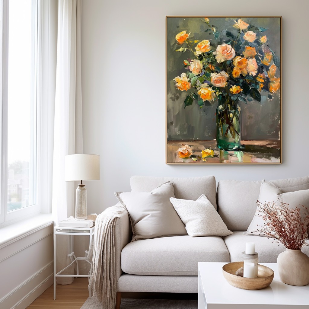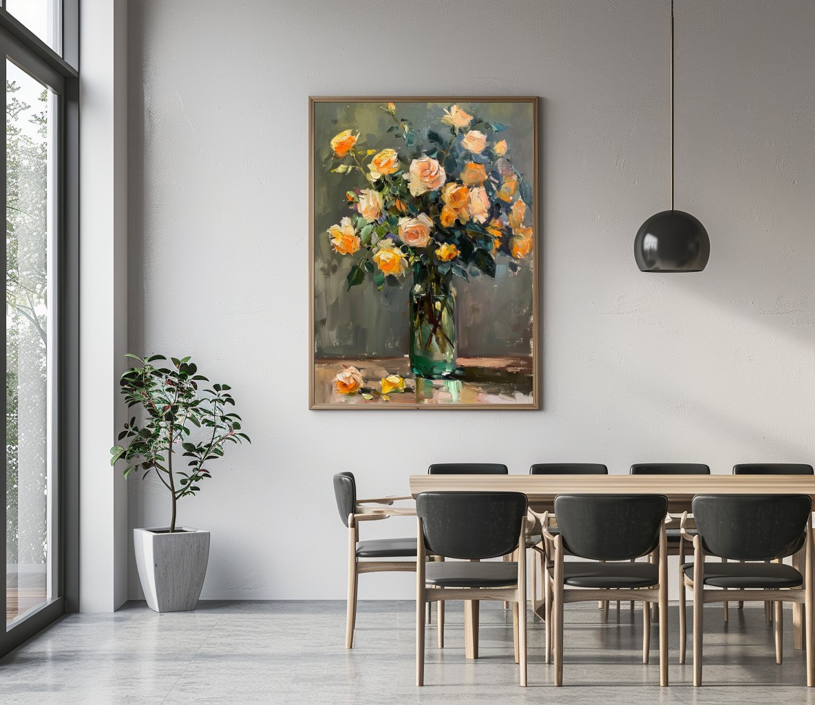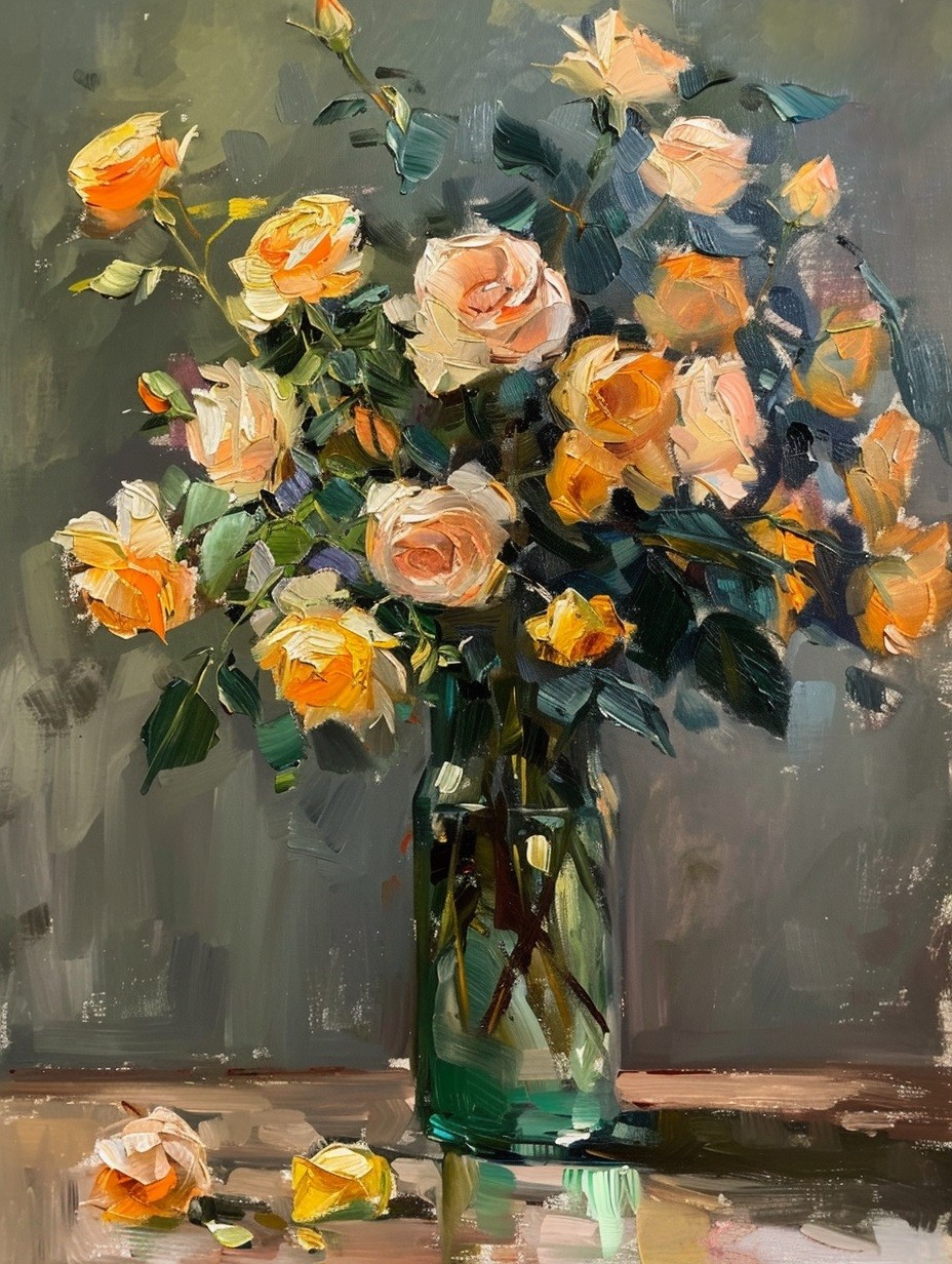 Este bello cuadro evoca una atmósfera cálida y elegante, presentando un exquisito arreglo de rosas color durazno y crema en un jarrón de cristal verde. Las pinceladas gruesas y expresivas capturan la luz y textura de los pétalos, añadiendo profundidad y realismo a la obra. Perfecto para ambientes que buscan añadir un toque sofisticado y acogedor. Ideal para salones o estudios.