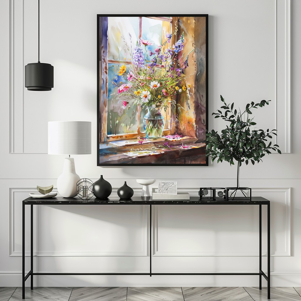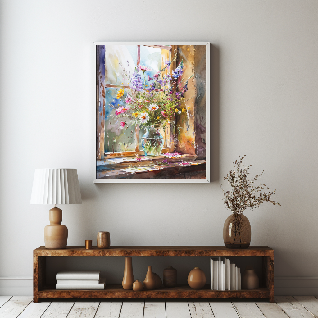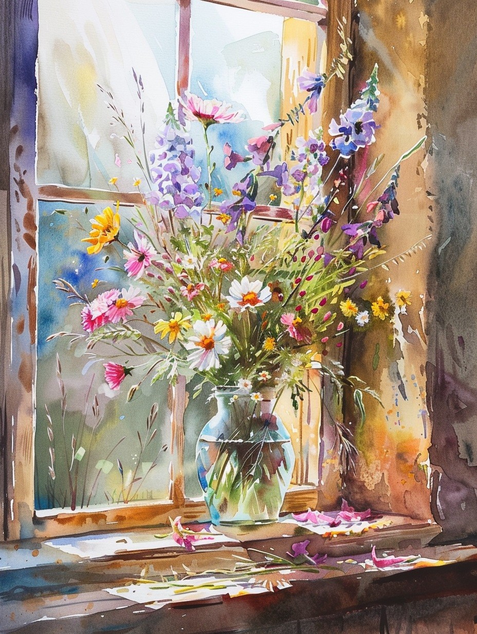 Este cuadro vibrante captura un arreglo floral rústico y colorido situado en un alféizar, con la luz natural del día iluminando cada flor. La técnica de acuarela resalta los tonos vivos de púrpura, rosa y amarillo, creando un contraste encantador con el fondo suave. Es una pieza perfecta para añadir un toque de naturaleza y calidez a cualquier ambiente.