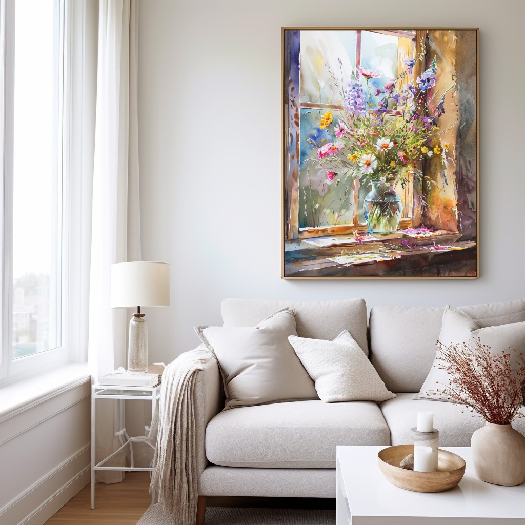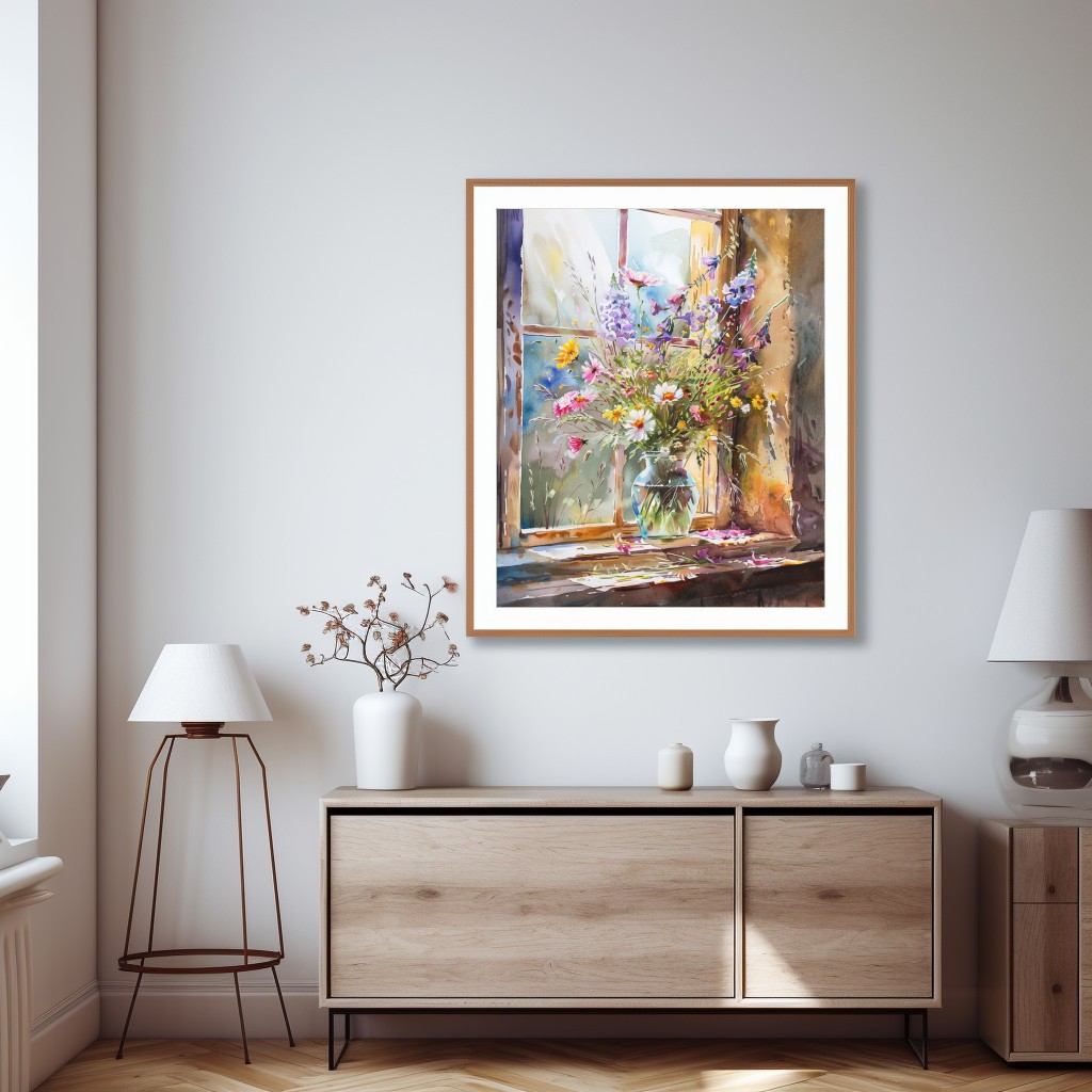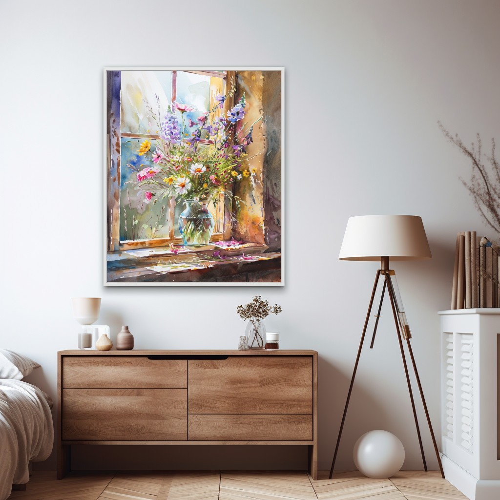 Este cuadro vibrante captura un arreglo floral rústico y colorido situado en un alféizar, con la luz natural del día iluminando cada flor. La técnica de acuarela resalta los tonos vivos de púrpura, rosa y amarillo, creando un contraste encantador con el fondo suave. Es una pieza perfecta para añadir un toque de naturaleza y calidez a cualquier ambiente.