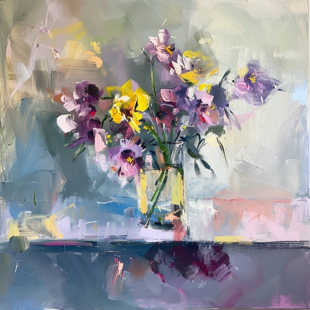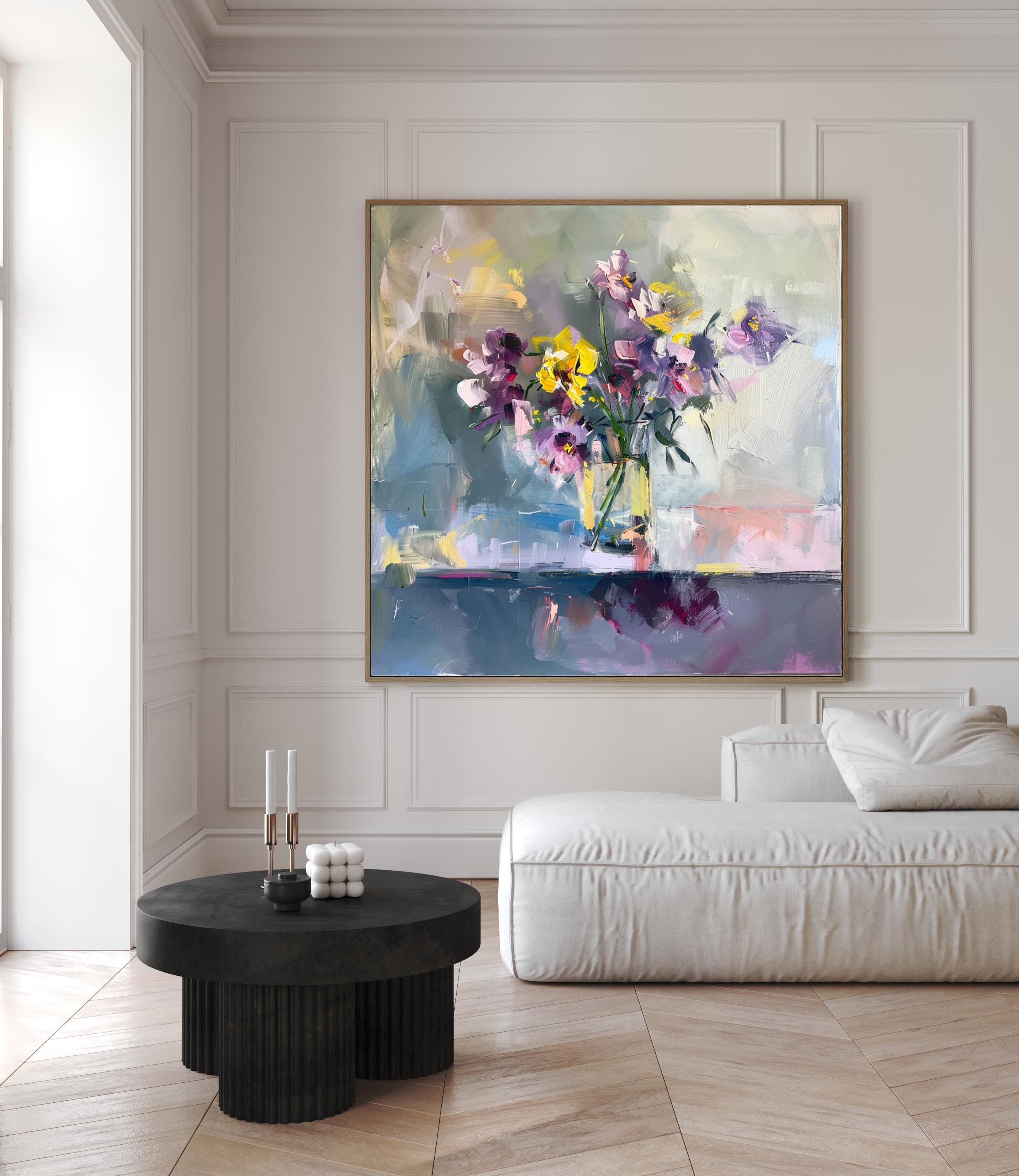 Este cuadro decorativo presenta un vibrante ramo de flores en un jarrón, pintado con pinceladas expresivas en tonos de púrpura, amarillo y rosa. El fondo abstracto en suaves colores pastel realza la frescura y el dinamismo del arreglo floral. Ideal para añadir un toque de color y modernidad a cualquier espacio, perfecto para entradas, salones, estudios o dormitorios.