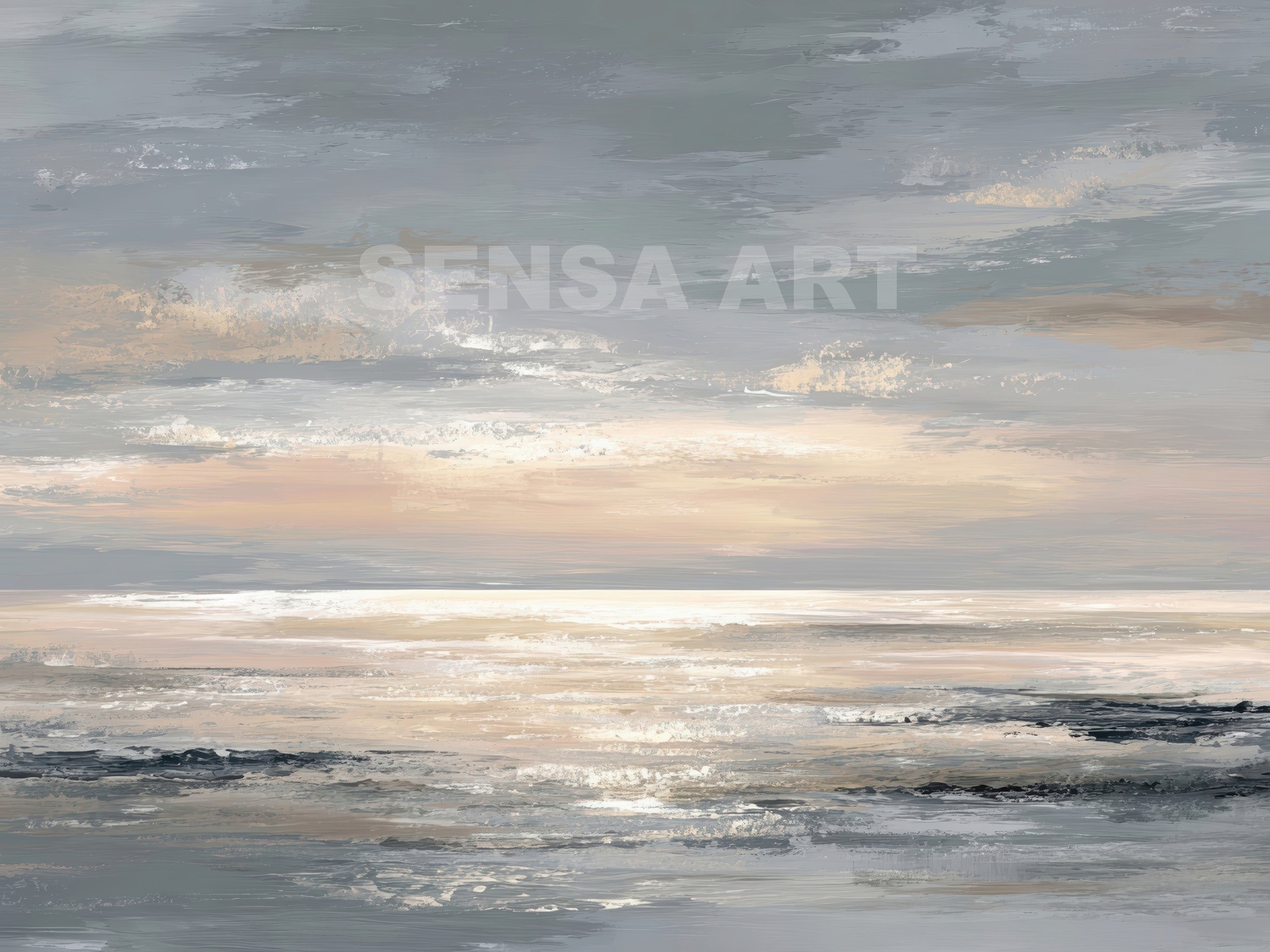 Este cuadro abstracto de horizonte marino combina delicadamente tonos grises, azul suave y arena, evocando la calma del mar al amanecer. Su composición equilibrada y su textura sutil aportan serenidad y profundidad a cualquier espacio. Ideal para interiores minimalistas o de estilo costero moderno, transmite una sensación de quietud y equilibrio visual. Perfecto para salones, dormitorios o despachos, este arte mural captura la belleza del paisaje marino con un enfoque contemporáneo y atemporal, creando una atmósfera envolvente y relajante.