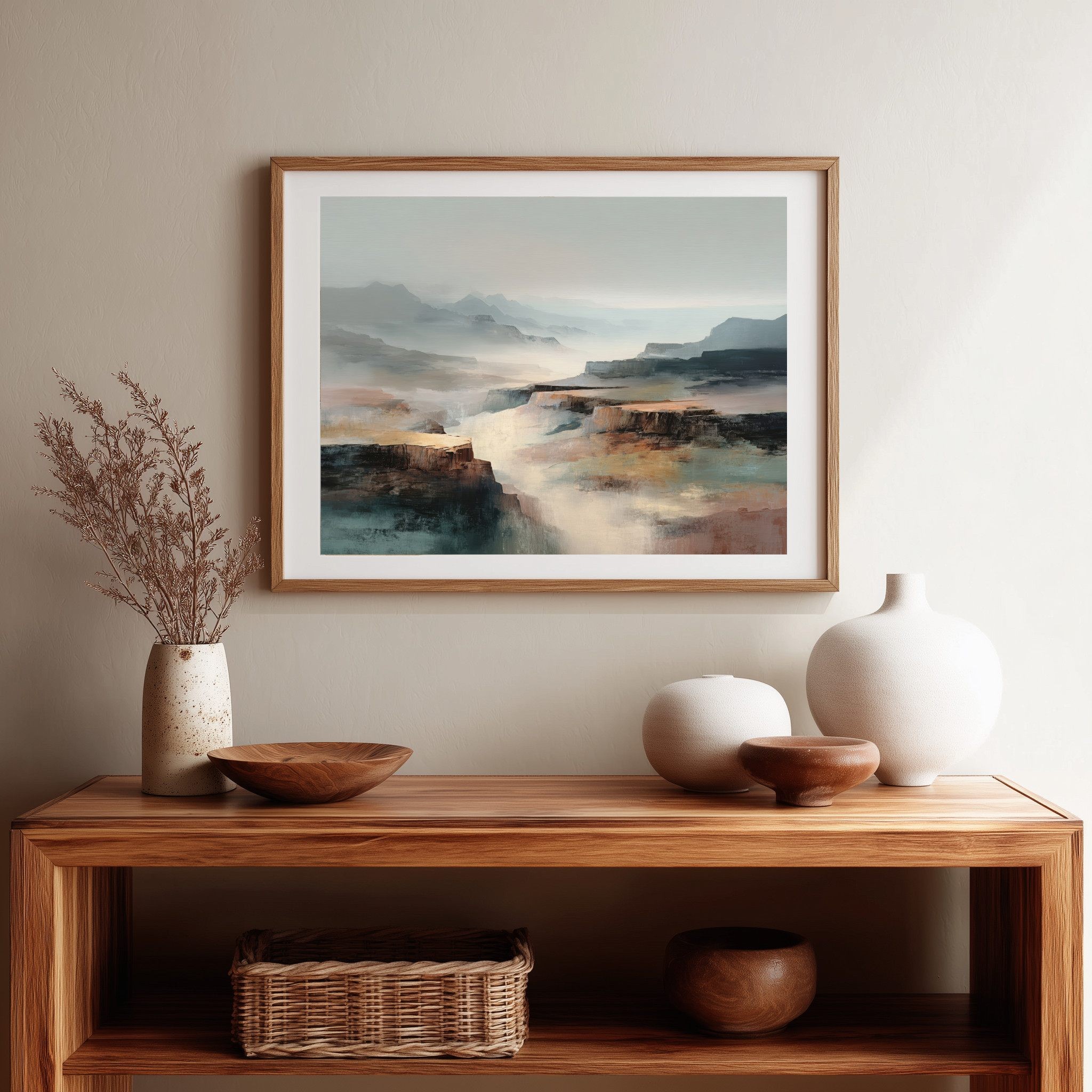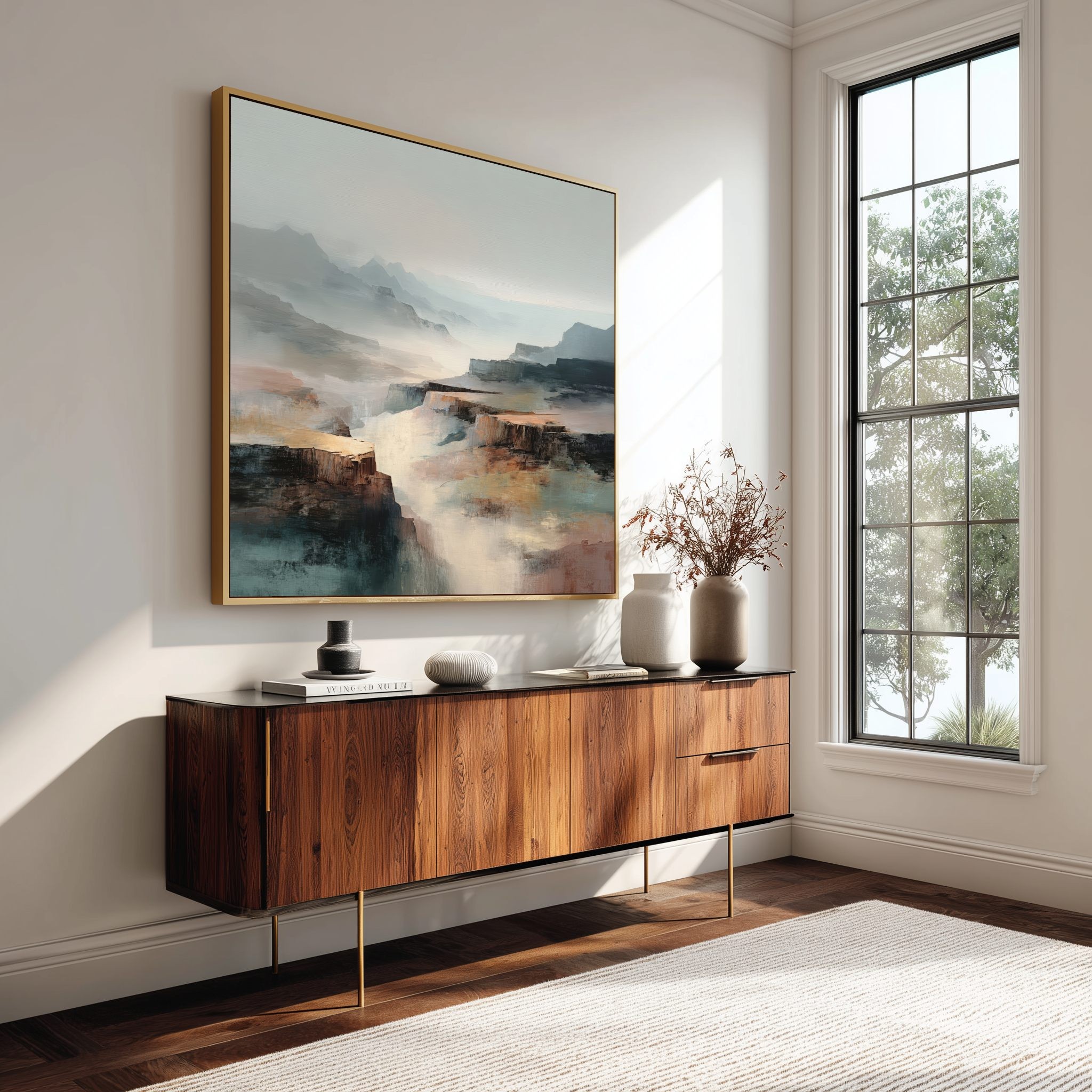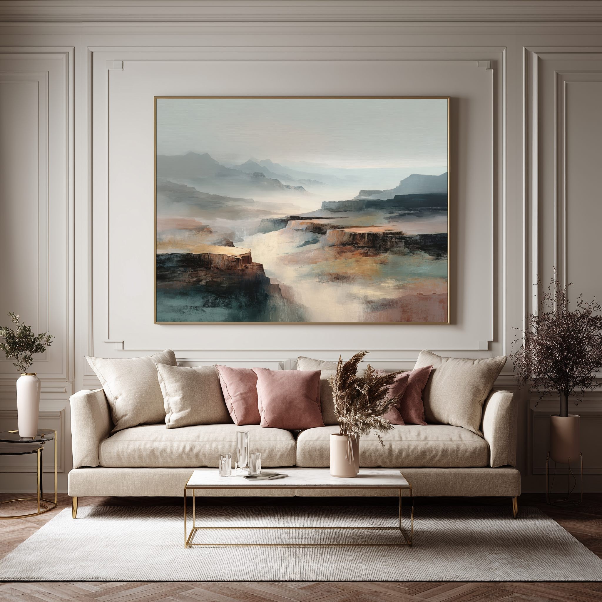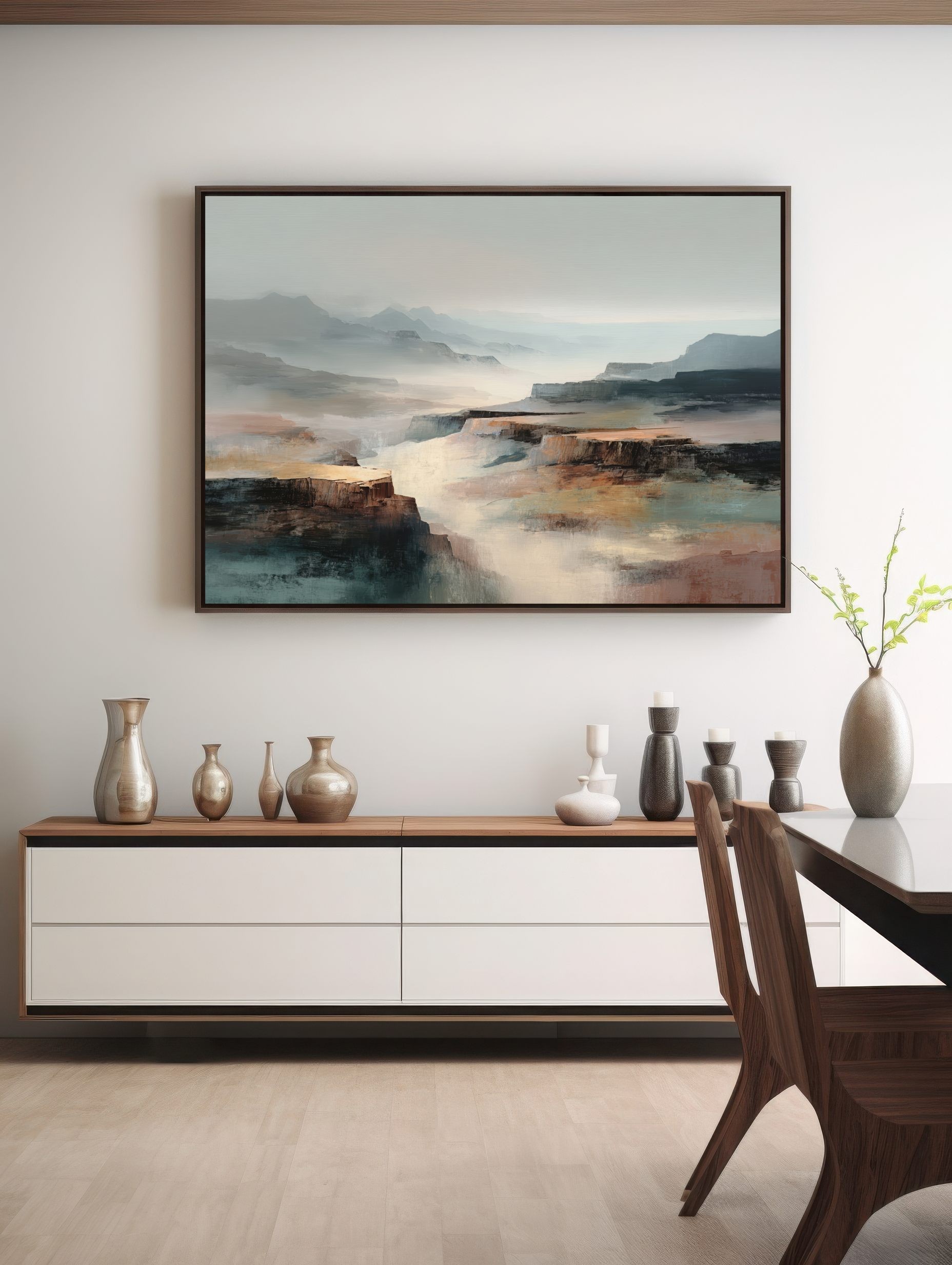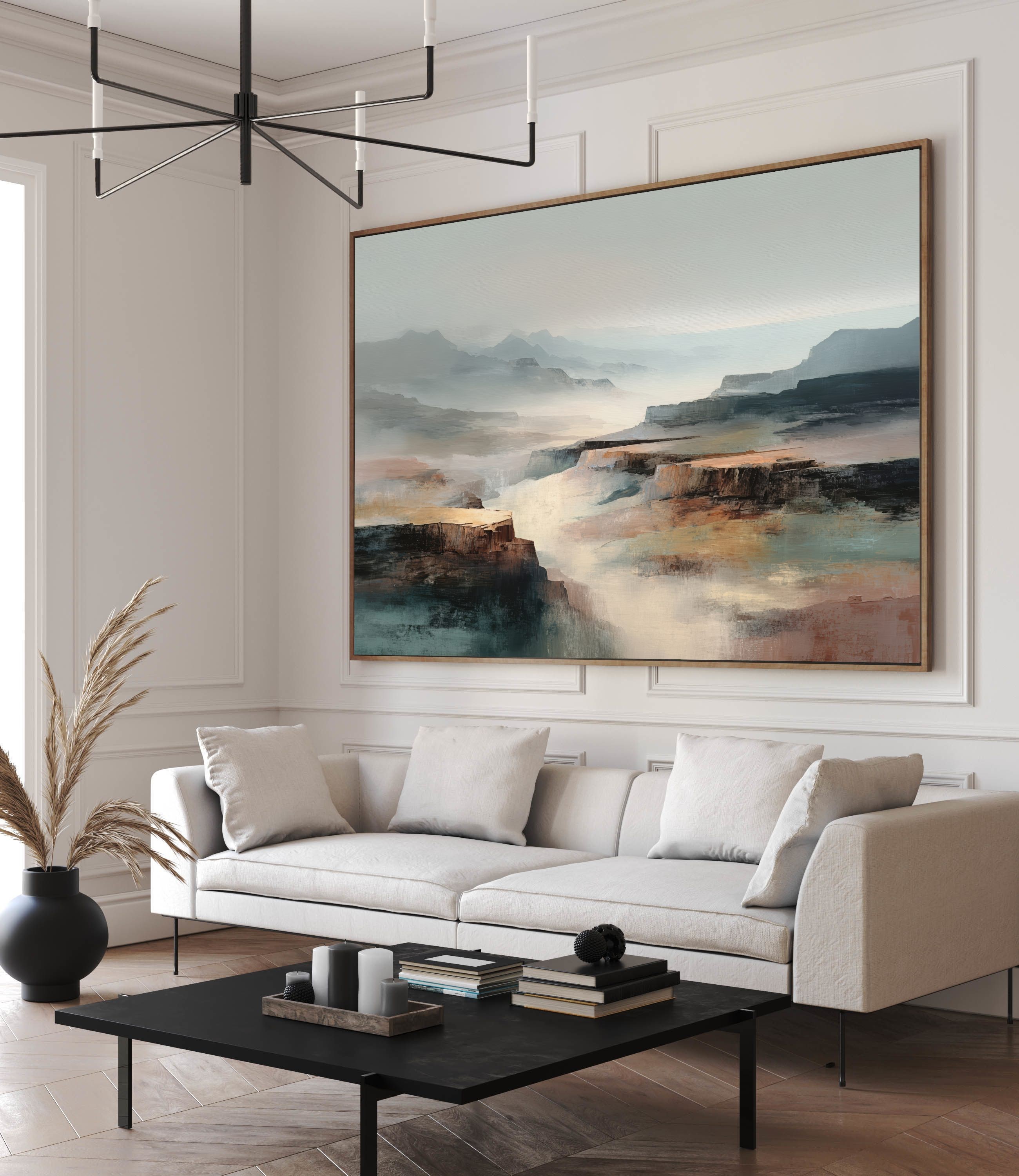Este cuadro abstracto del Gran Cañón recrea la majestuosidad de sus formaciones rocosas con un estilo minimalista y contemporáneo. Los tonos tierra, beige, ocres y azules suaves se funden en una composición equilibrada que transmite amplitud y calma. Perfecto para salones, oficinas o espacios de inspiración, esta obra aporta elegancia natural y un aire sofisticado a la decoración. Su estética moderna y atemporal lo convierte en un complemento ideal tanto para interiores clásicos como para ambientes modernos o de estilo industrial.