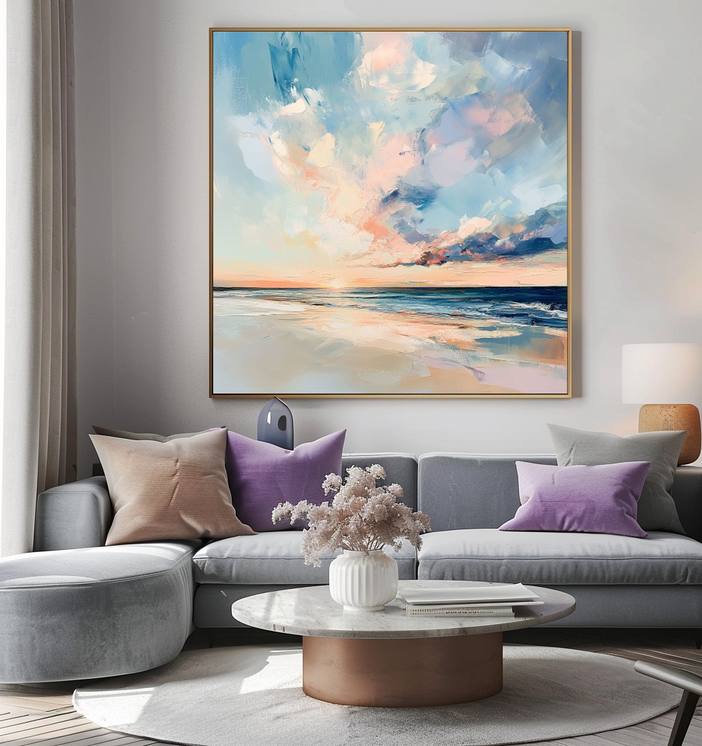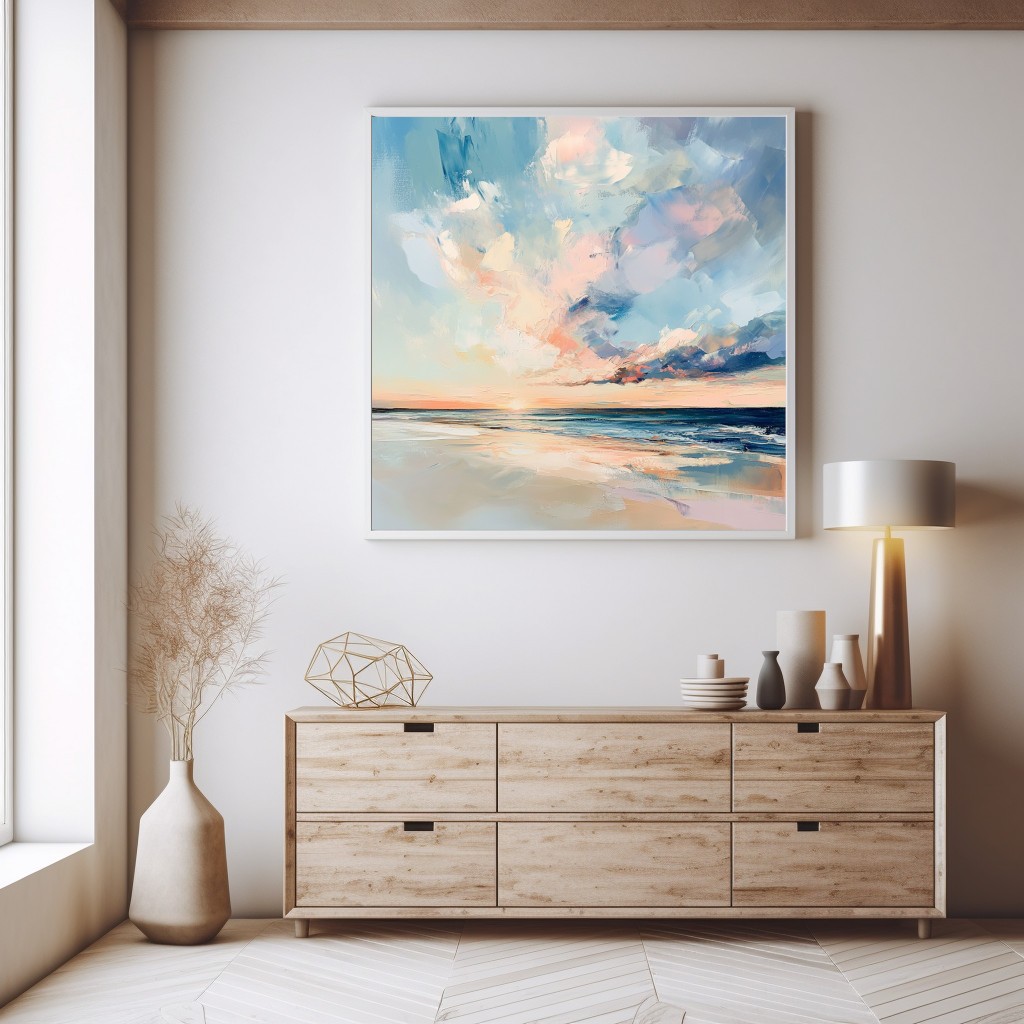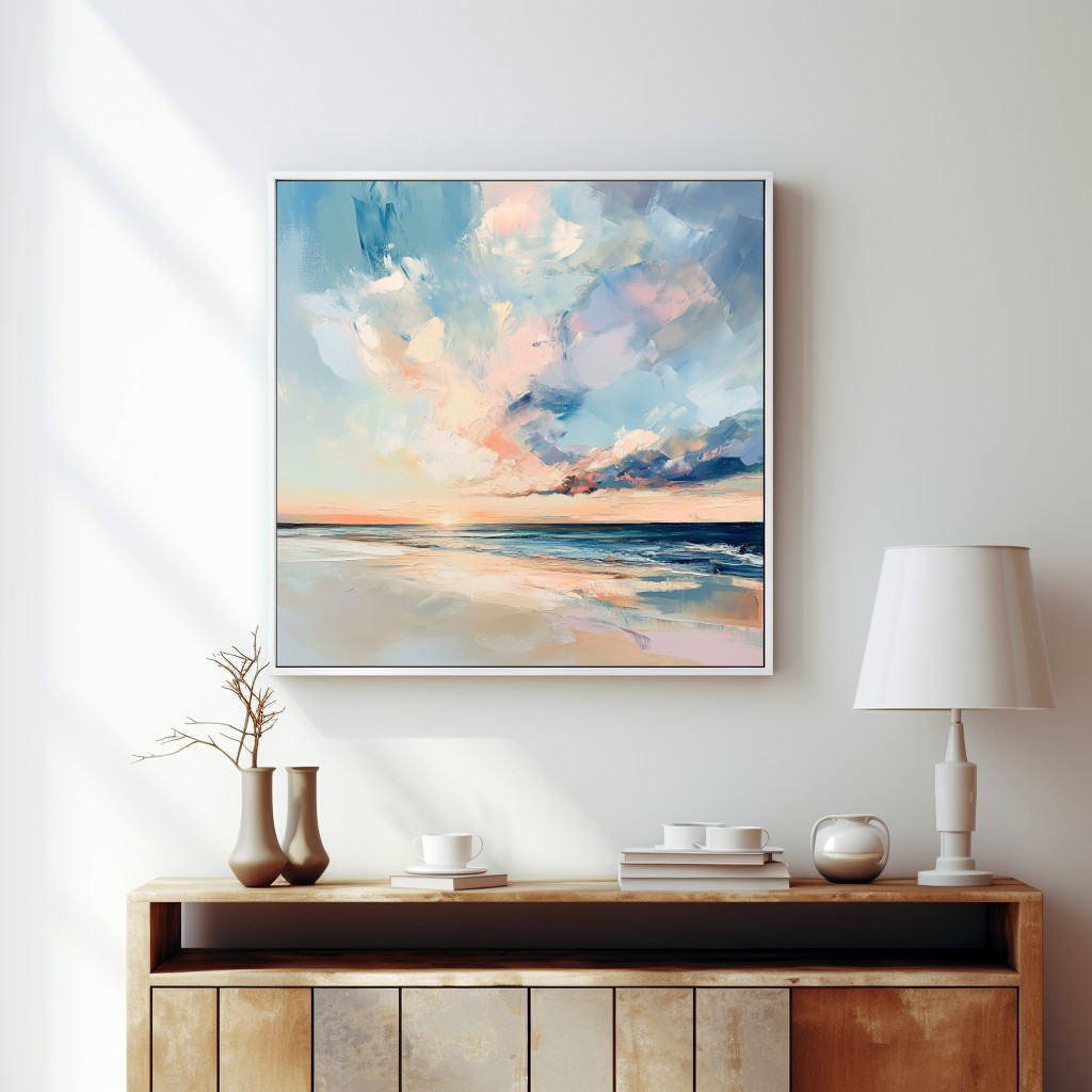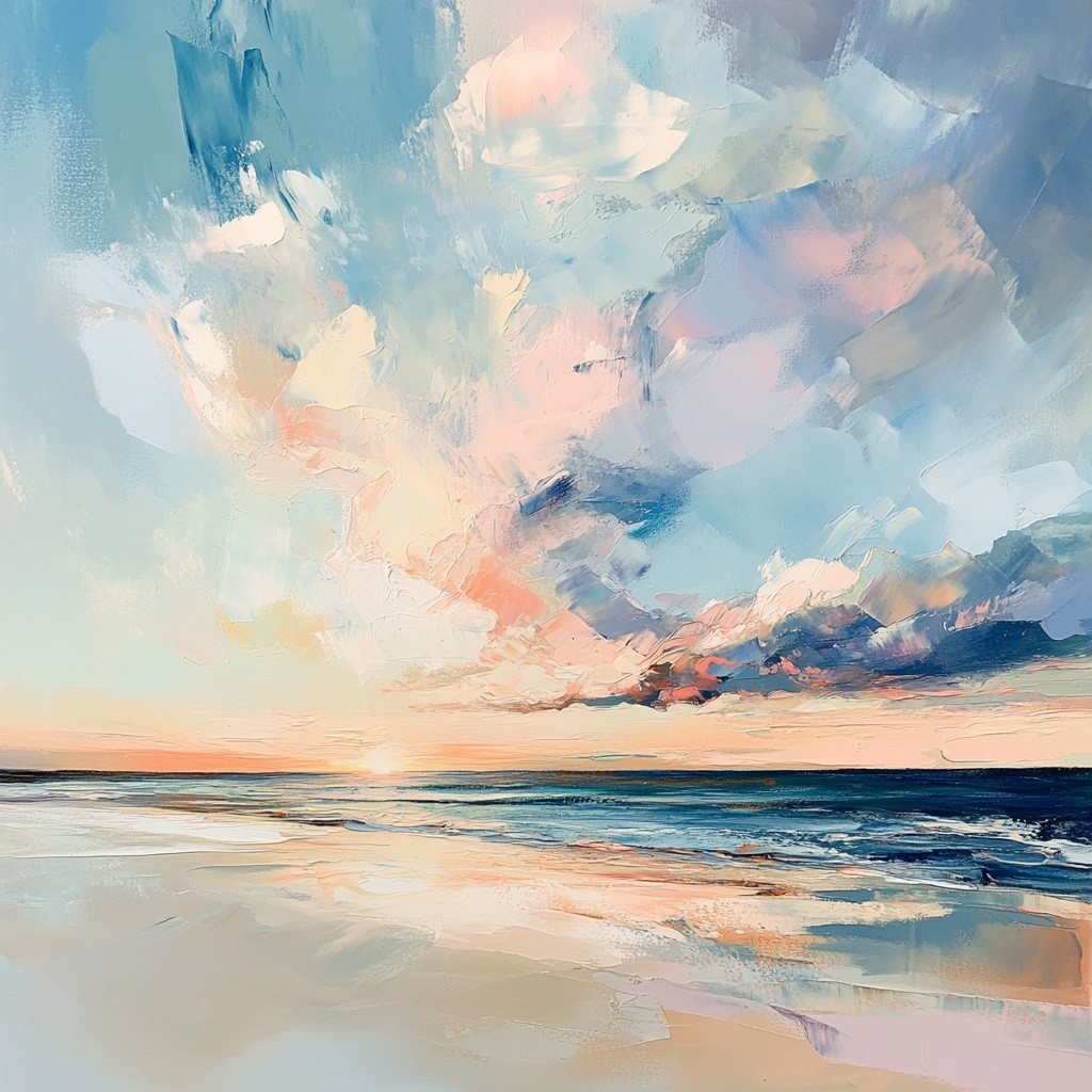 Este cuadro abstracto captura la belleza de un atardecer en la playa con tonos pastel y pinceladas suaves. Los colores rosados, azules y dorados se mezclan armoniosamente, creando un ambiente sereno y relajante que evoca la inmensidad del cielo y el mar. Ideal para quienes buscan añadir un toque de tranquilidad y elegancia a sus espacios, perfecto para decoraciones contemporáneas y minimalistas.