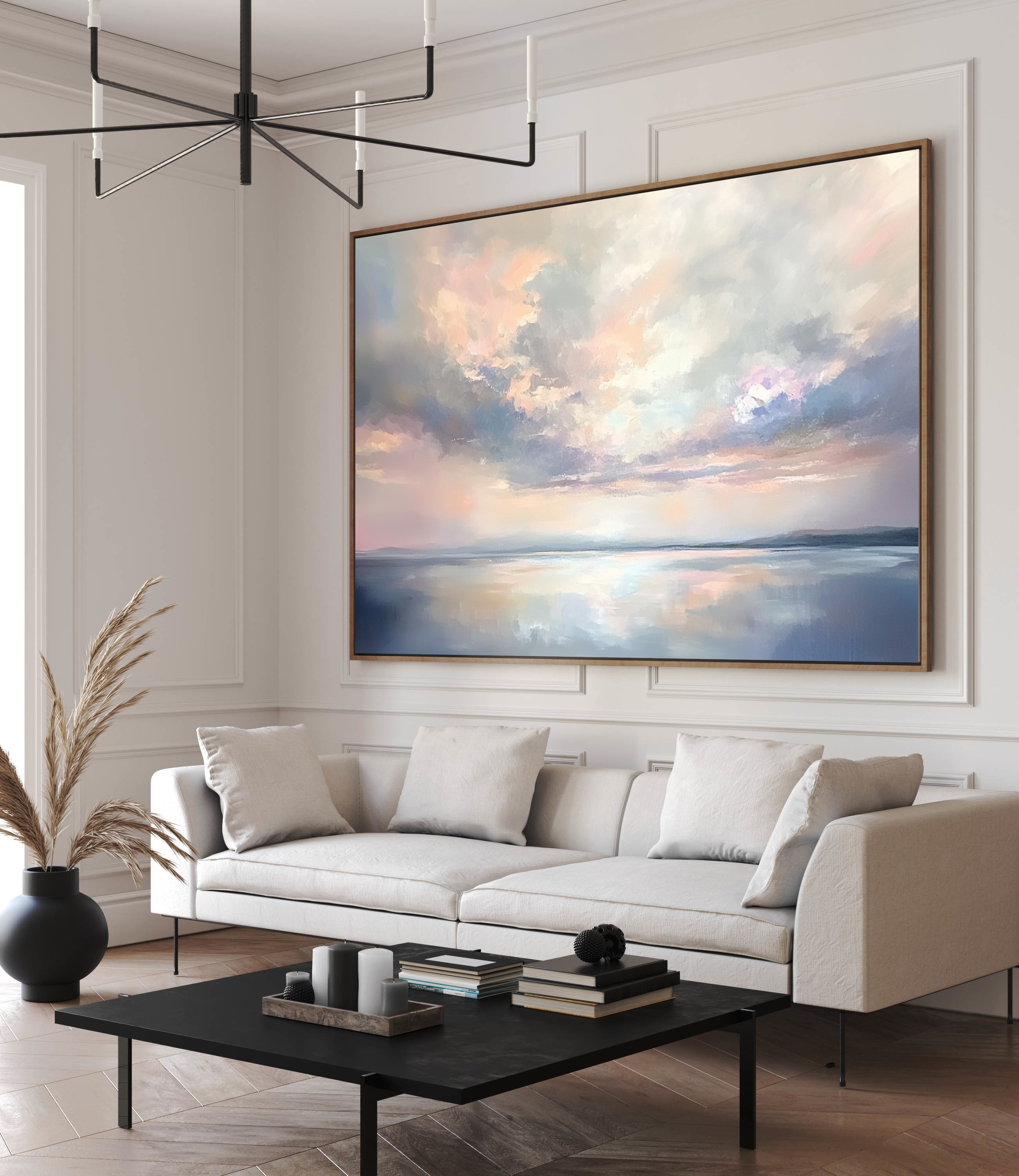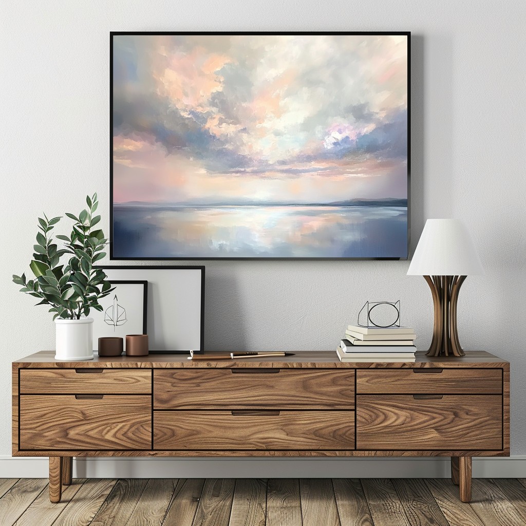 Este cuadro abstracto presenta un paisaje sereno y etéreo, capturando la suavidad de un cielo nublado reflejado en aguas tranquilas. Los tonos pastel, que van del azul al rosa, se mezclan en una composición delicada y armoniosa, ideal para crear un ambiente de calma y sofisticación. Perfecto para espacios modernos y minimalistas, aportando un toque de serenidad y belleza natural a cualquier rincón.