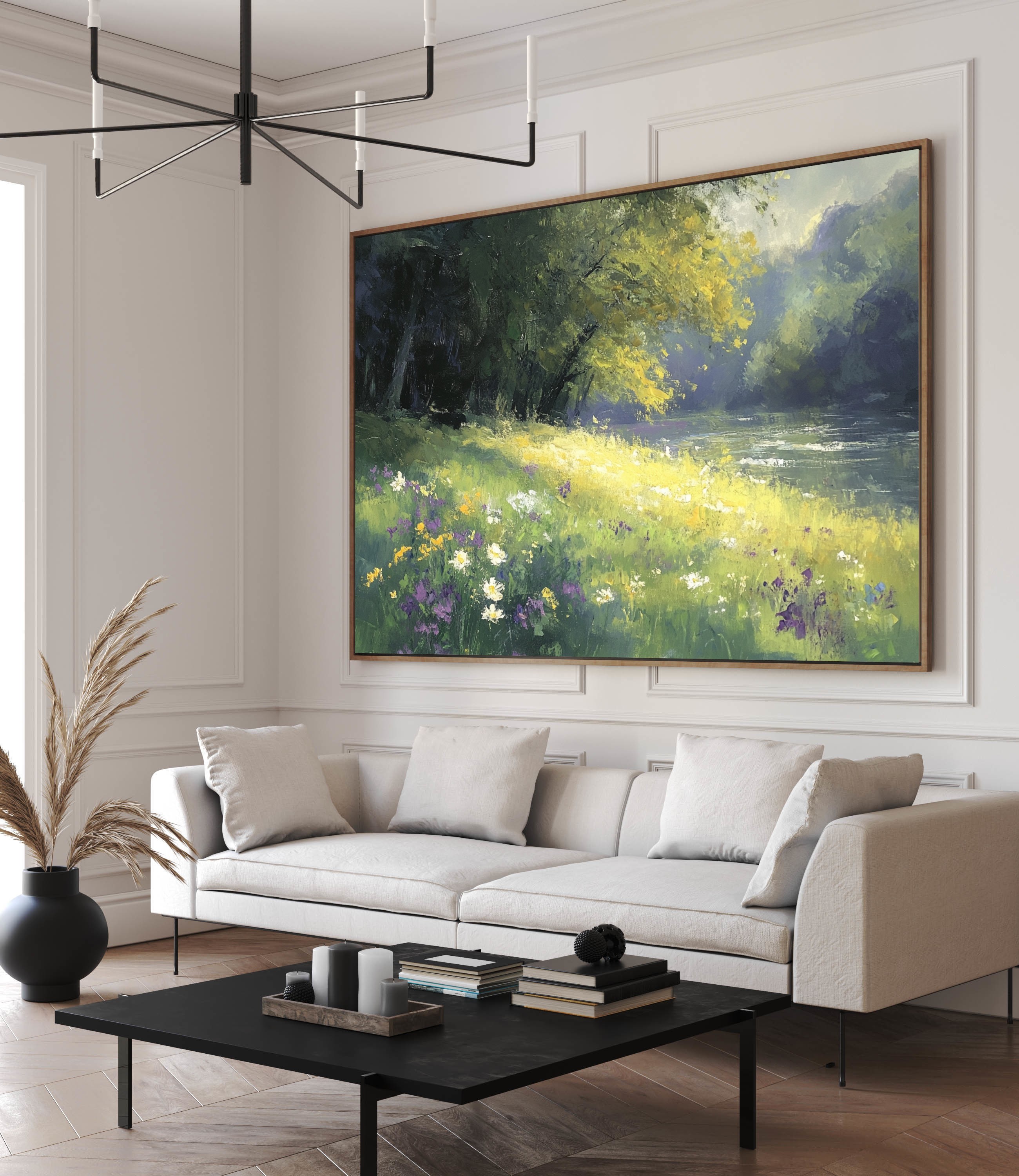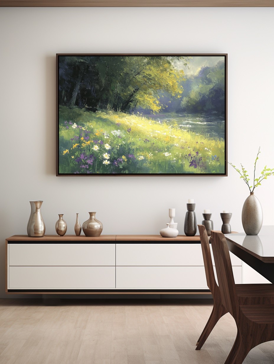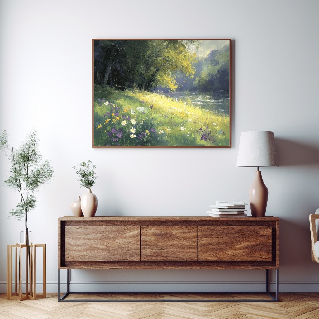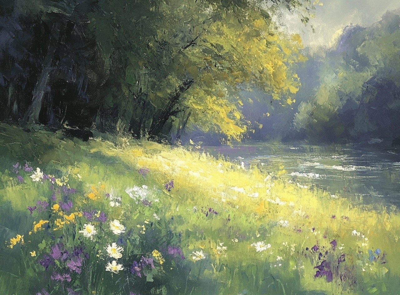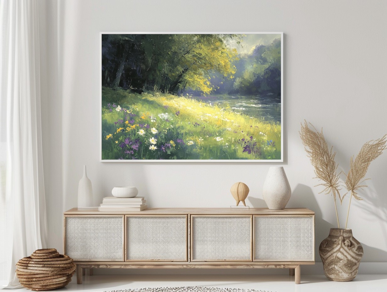 Este cuadro decorativo impresionista captura la serenidad de un paisaje natural con un río tranquilo, flores silvestres y luz dorada filtrándose entre los árboles. Sus tonos verdes, amarillos y lilas crean una atmósfera relajante y armoniosa, ideal para salones, dormitorios o espacios que buscan un toque de frescura y naturaleza. Esta obra aporta elegancia y calidez a cualquier ambiente.