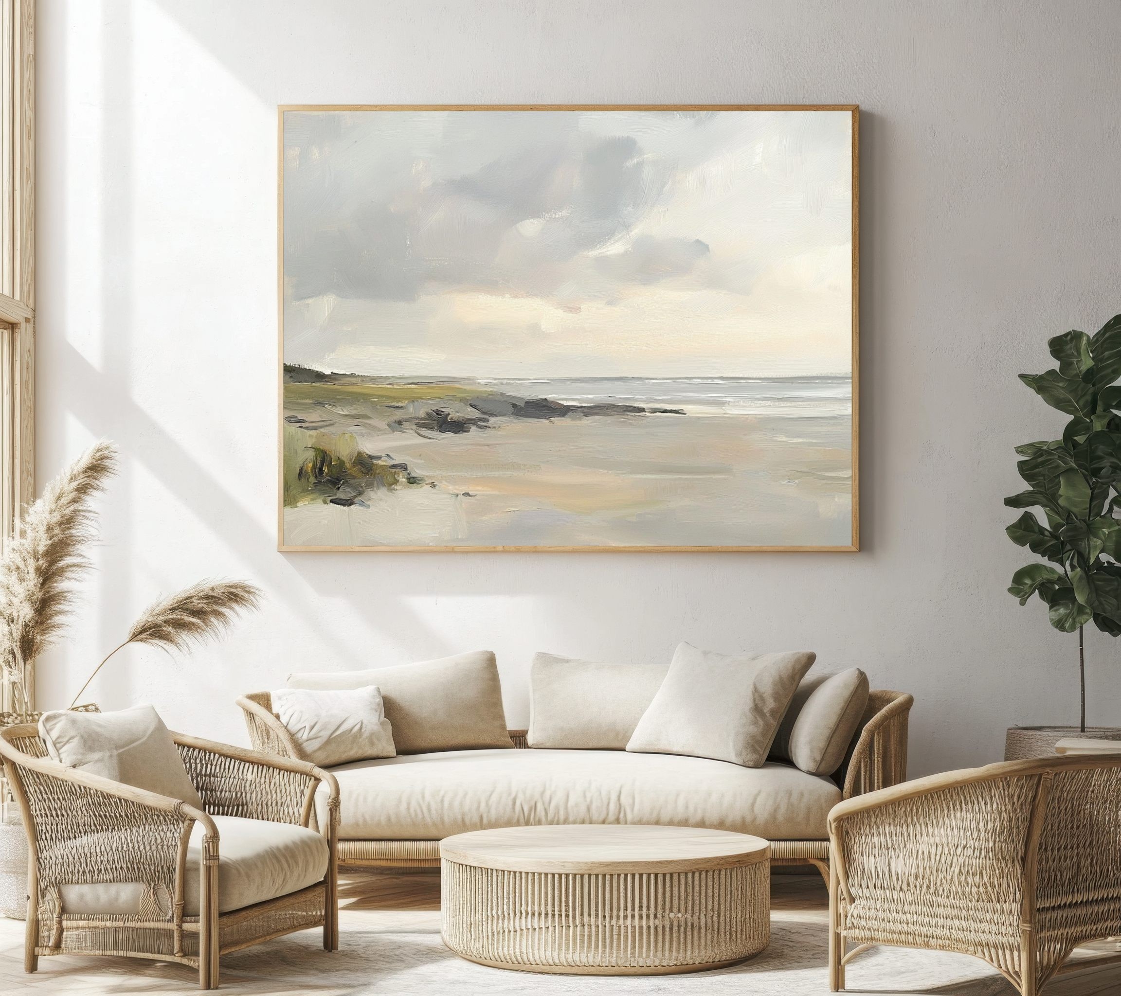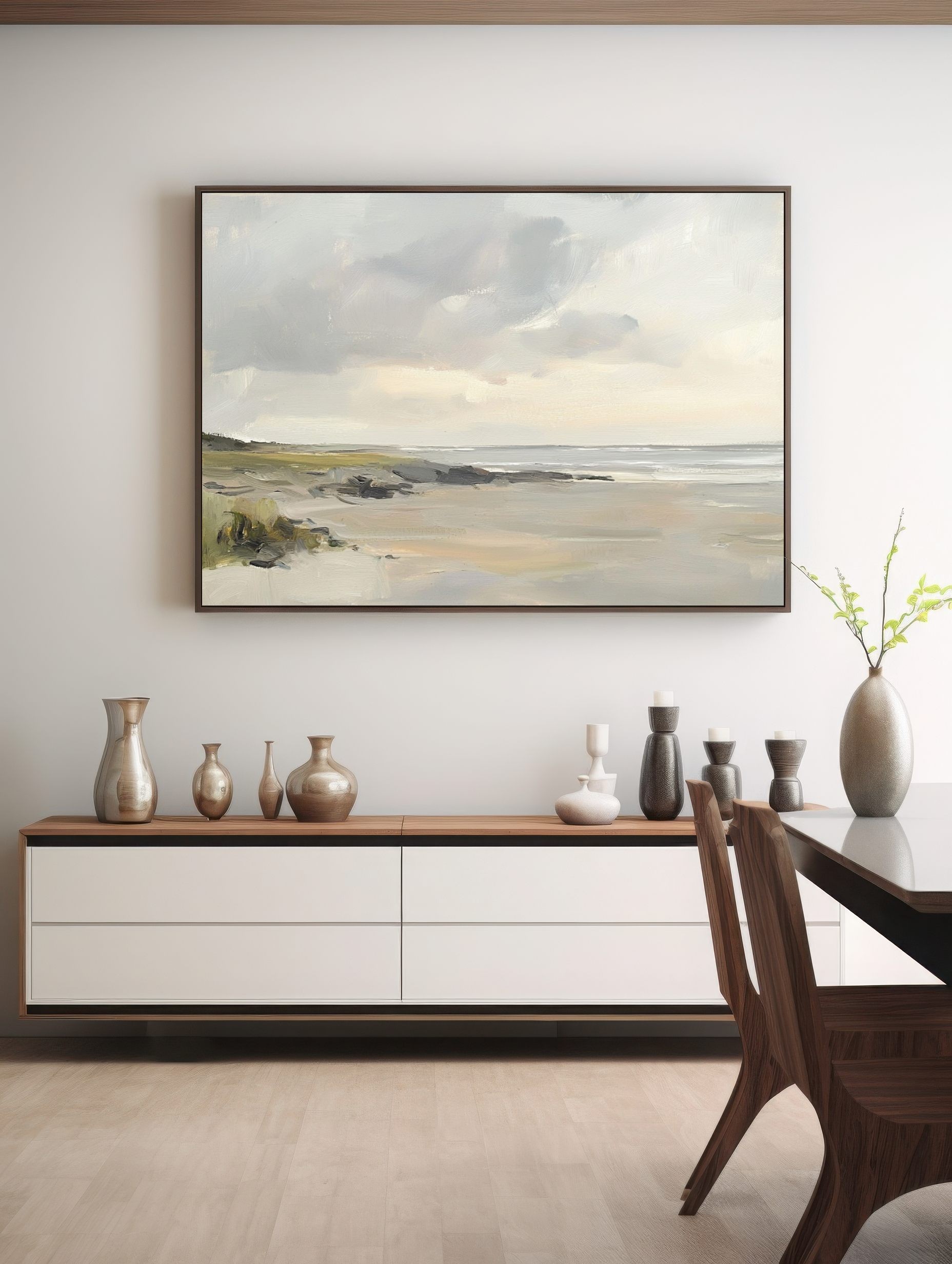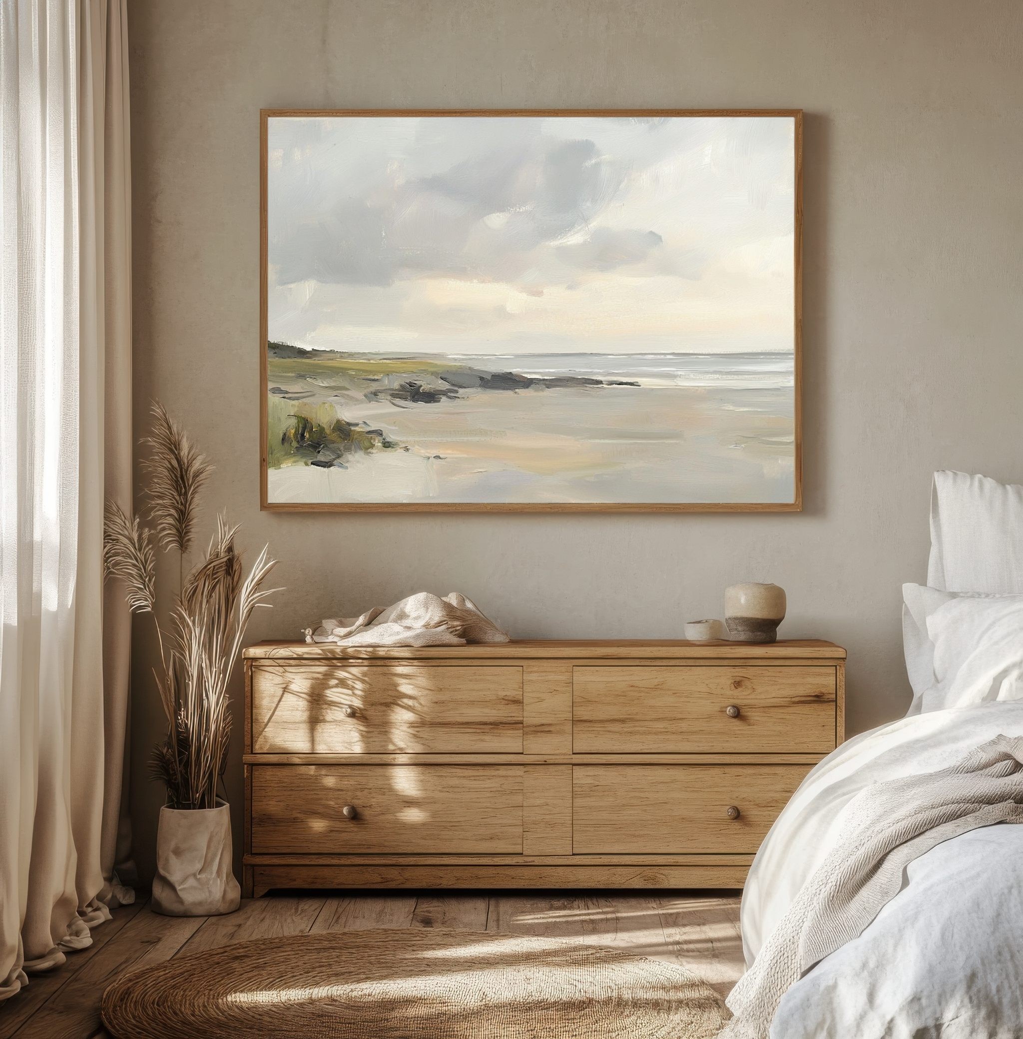 Esta pintura al óleo de paisaje costero destaca por su estética minimalista y sus delicados tonos neutros. El cielo nublado y la playa desierta evocan una profunda sensación de calma y espacio. Ideal como arte mural escandinavo, esta obra de arte serena es perfecta para interiores modernos que buscan un estilo relajado y elegante. Añade profundidad y naturalidad a tu hogar con esta escena de playa pintada a mano, que refleja belleza sutil y conexión con la naturaleza en su forma más pura.