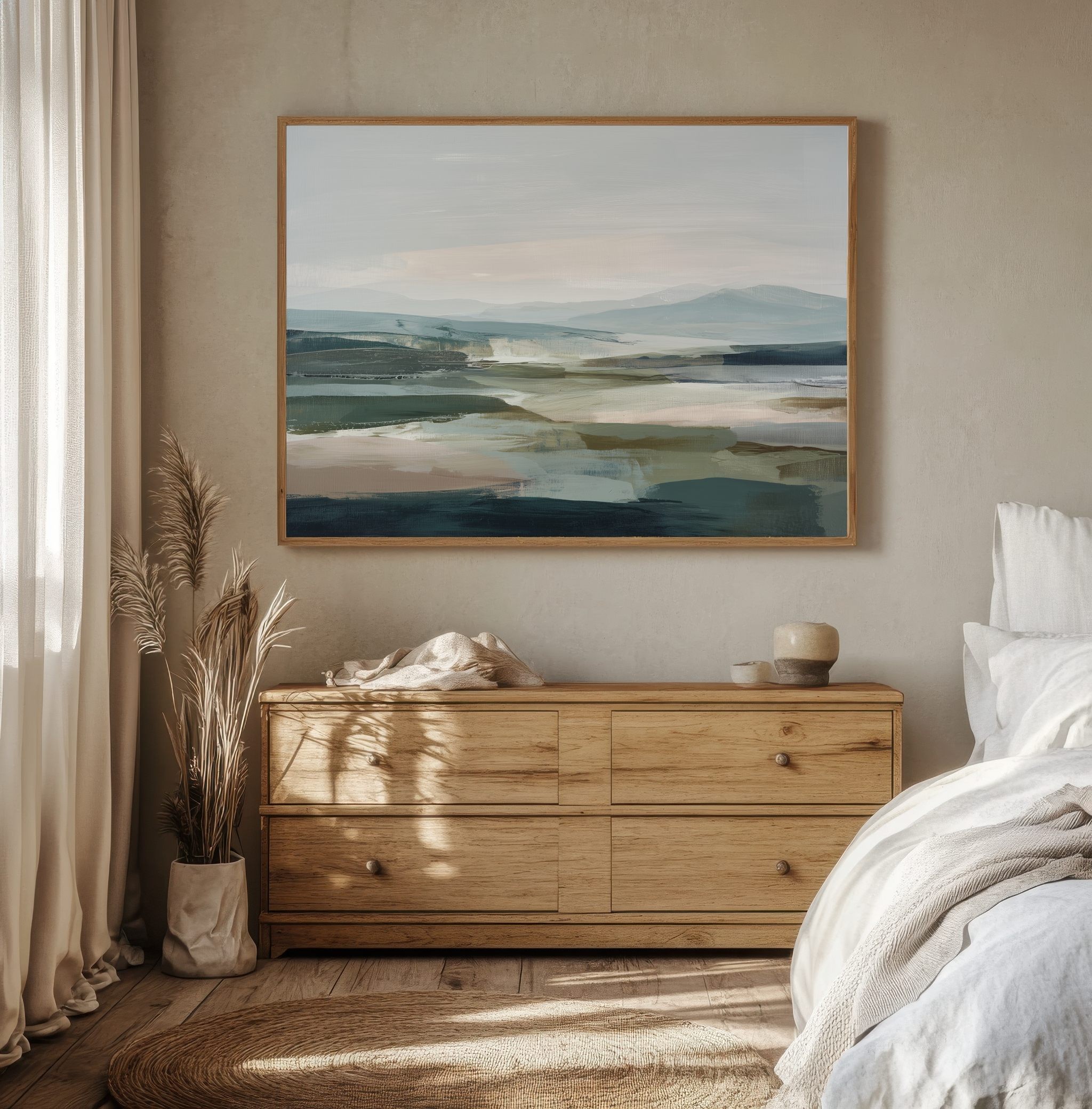 Este cuadro abstracto de paisaje montañoso combina tonos verdes, grises y beige en un estilo minimalista que transmite serenidad y amplitud. Las pinceladas suaves y difuminadas evocan colinas y montañas envueltas en bruma, creando una atmósfera calmada y contemporánea. Ideal para quienes buscan un arte elegante y atemporal, perfecto para decoración moderna en salones, oficinas o dormitorios. Su paleta neutra y equilibrada aporta frescura y sofisticación a cualquier espacio, convirtiéndose en una pieza versátil que invita a la contemplación y al descanso visual.