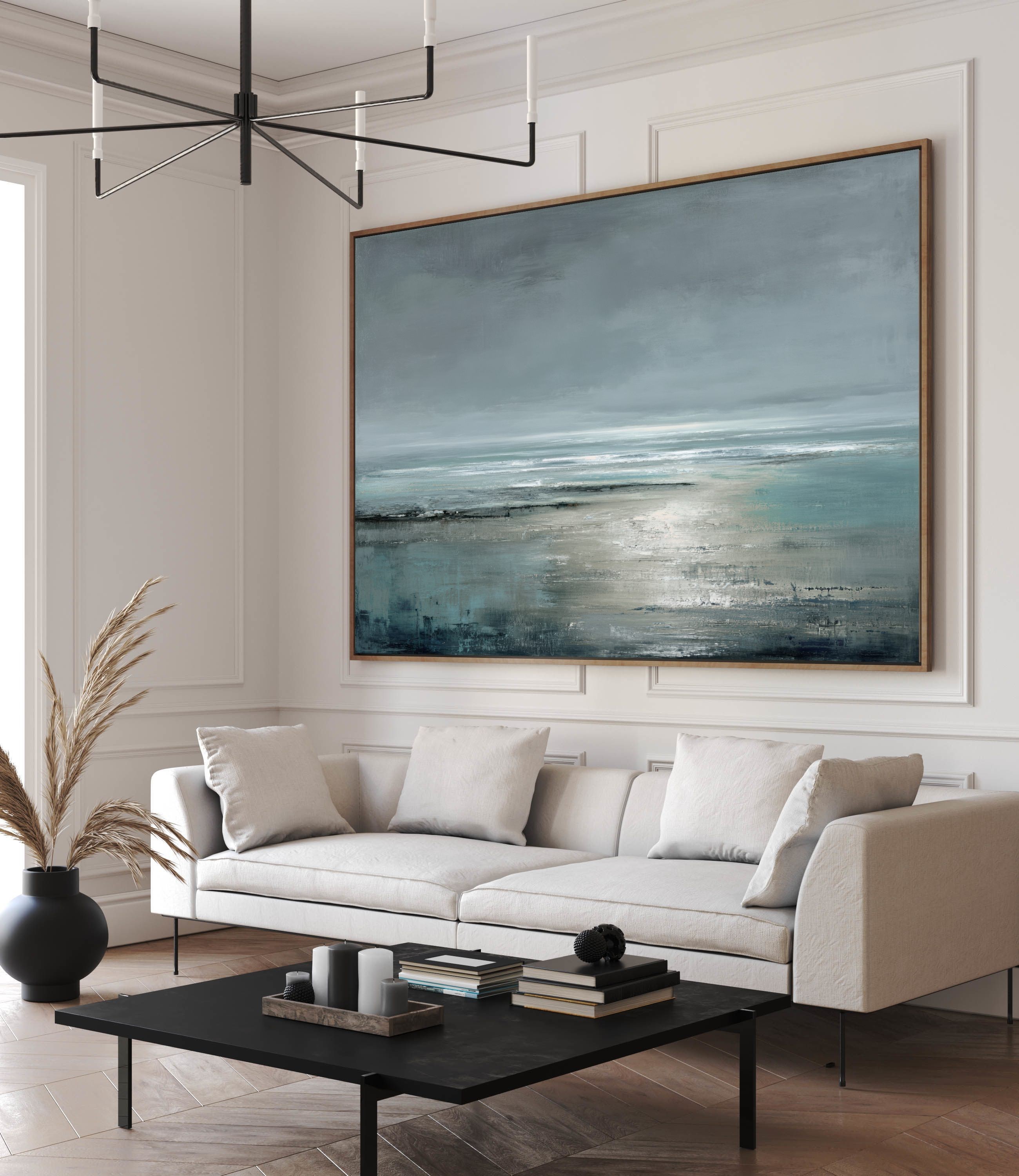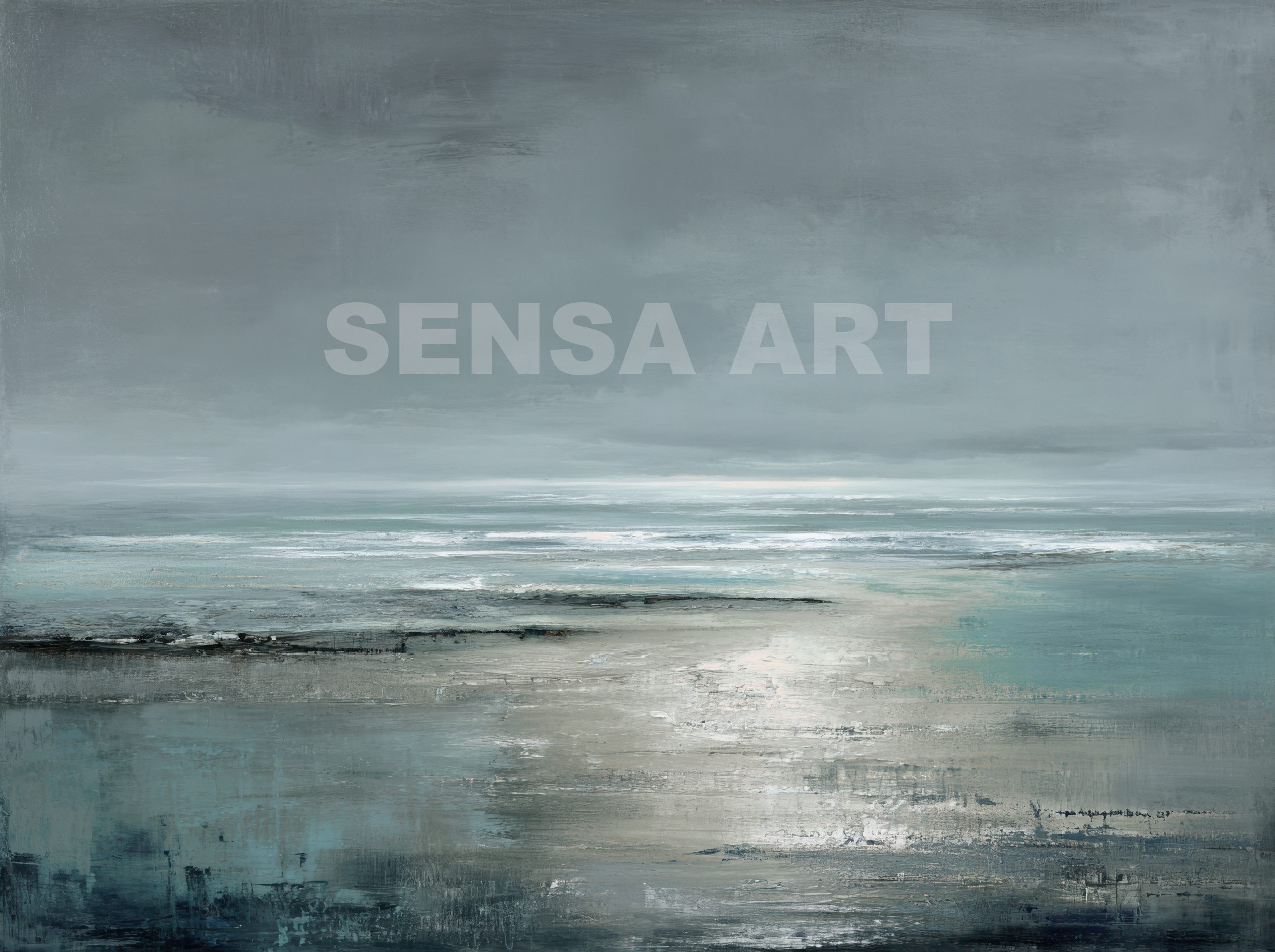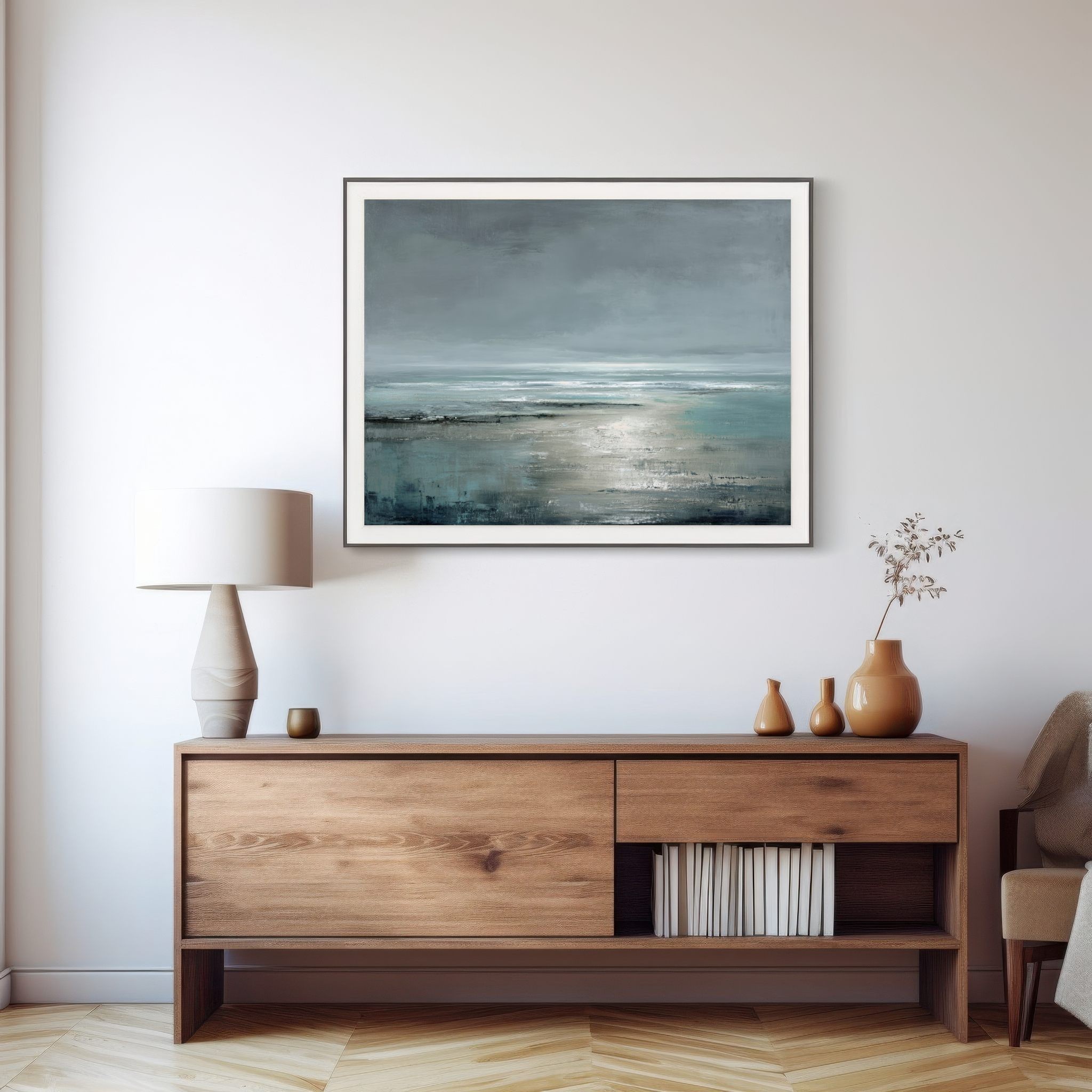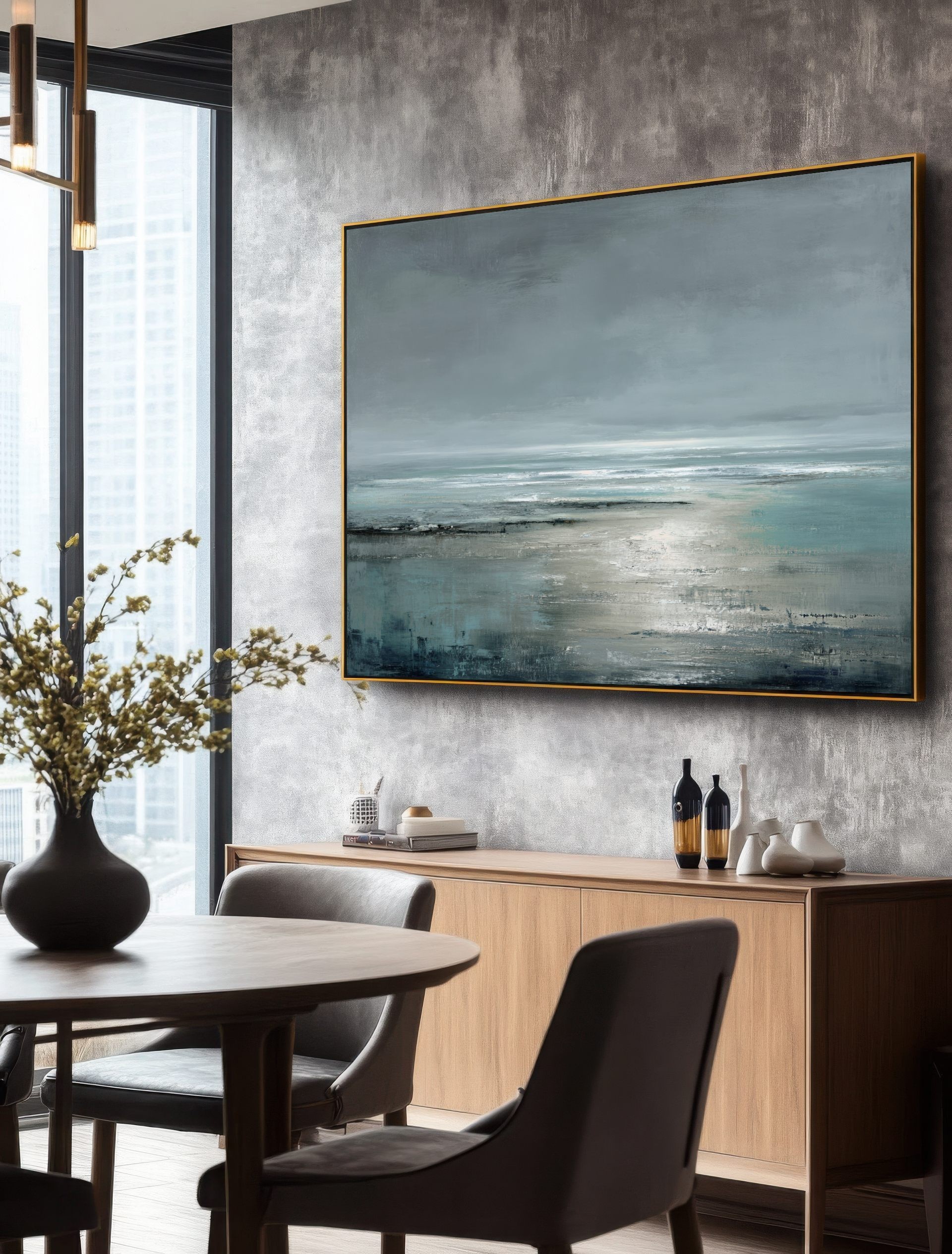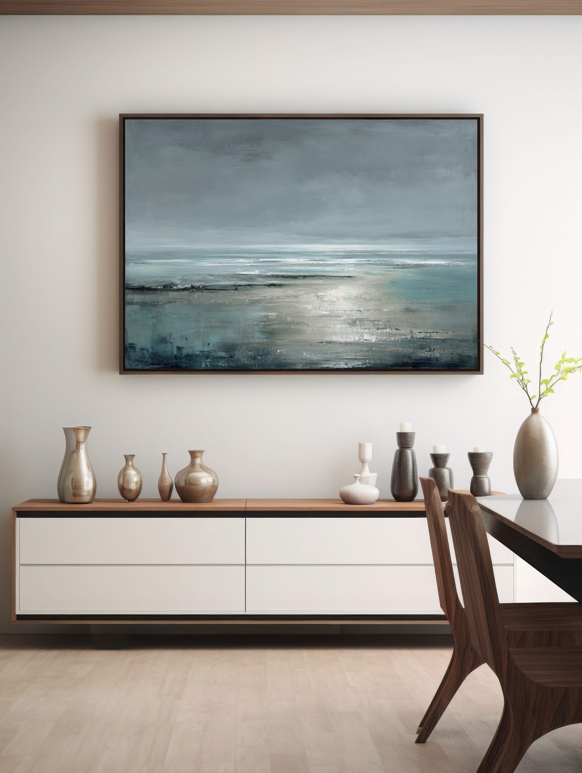 Este cuadro abstracto de paisaje marino combina tonos grises, plateados y aguamarina, evocando la calma del océano bajo un cielo nublado. Las pinceladas texturizadas y los reflejos de luz transmiten serenidad y profundidad, creando una obra contemporánea de gran impacto visual. Ideal para quienes buscan una pieza artística elegante y atemporal, perfecta para decoración moderna en salones, oficinas o dormitorios. Su estilo minimalista y sofisticado convierte este cuadro en un punto focal único, aportando equilibrio y frescura a cualquier ambiente.