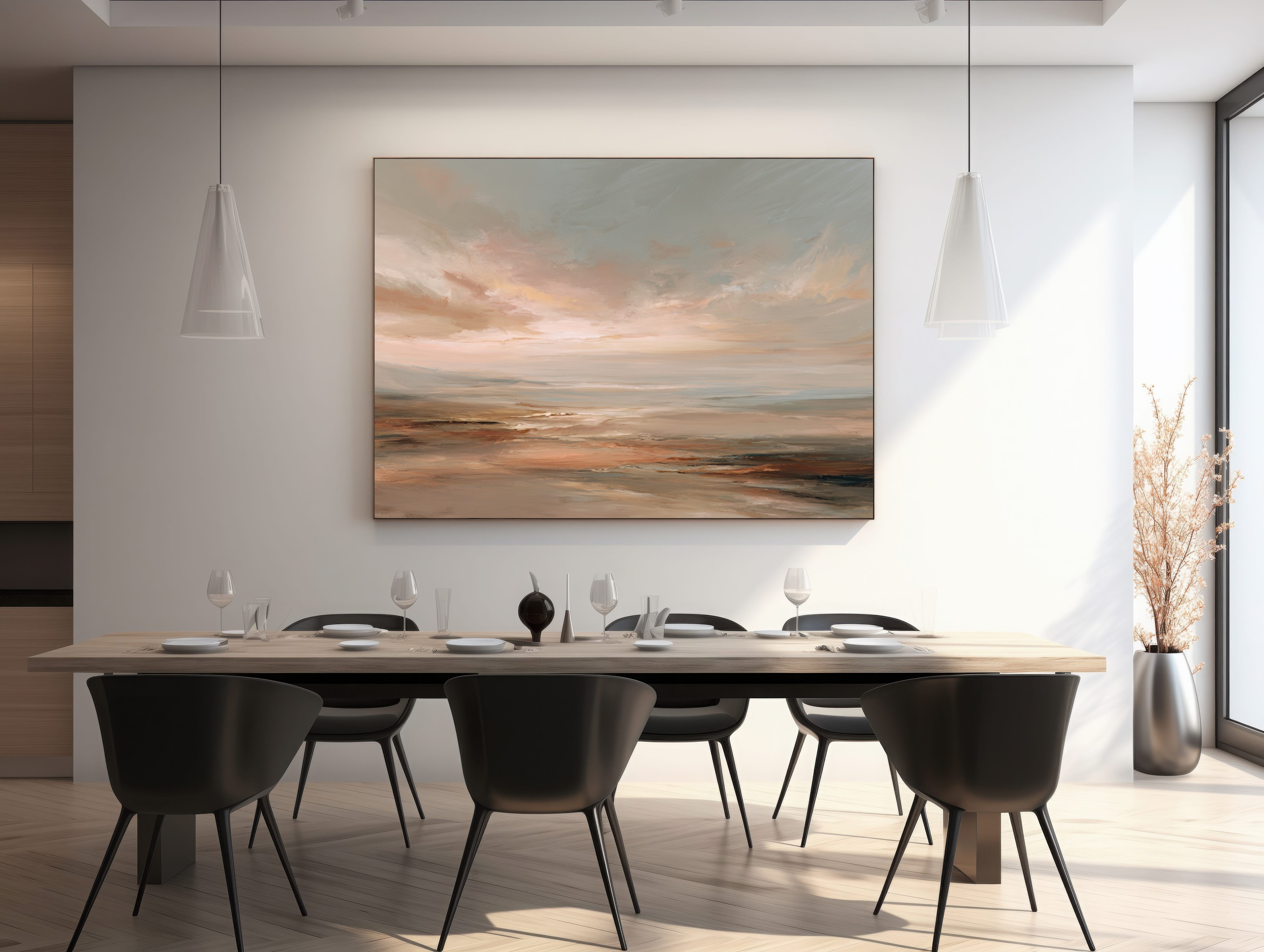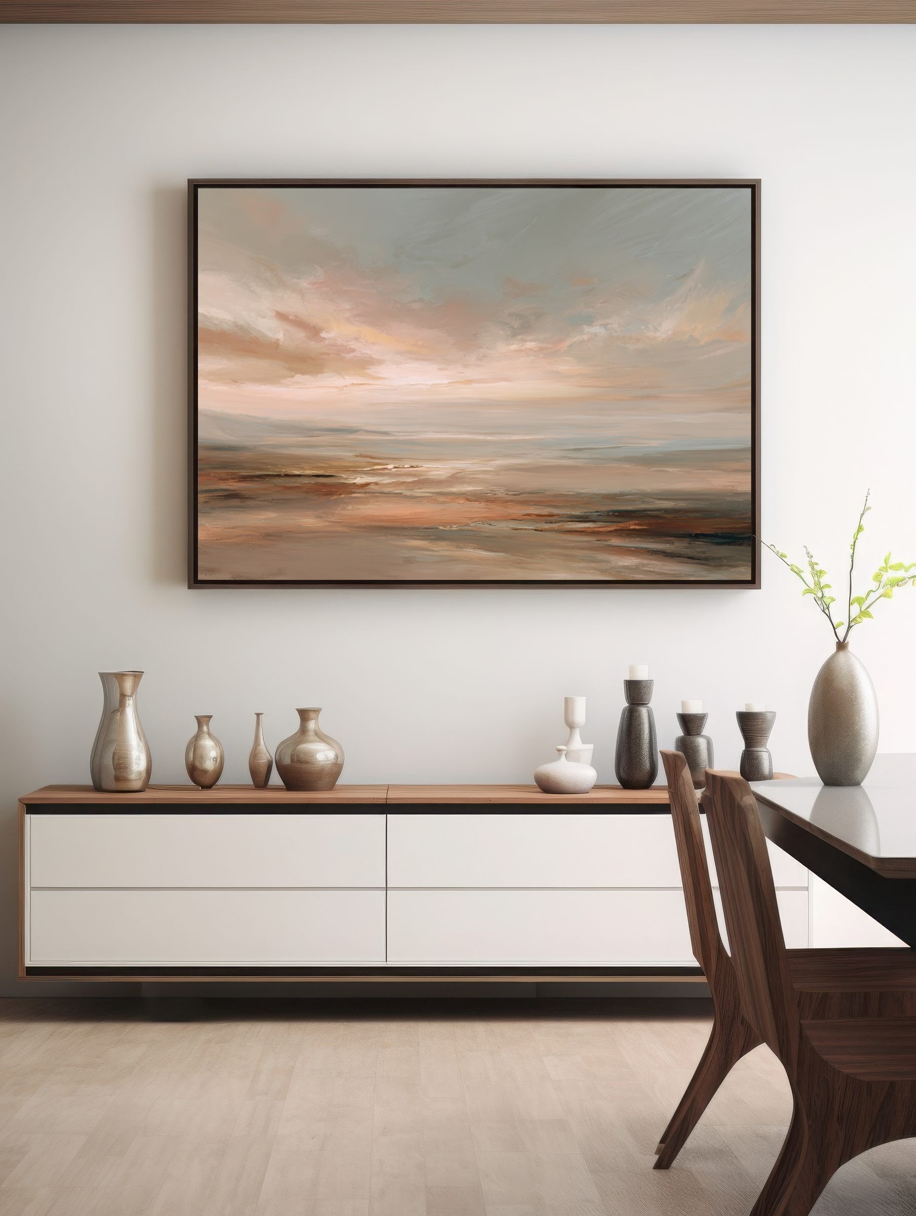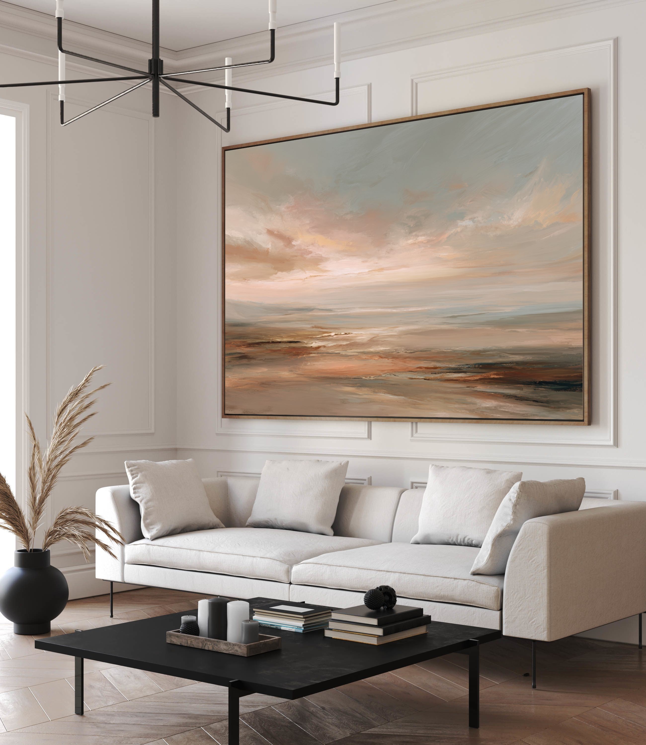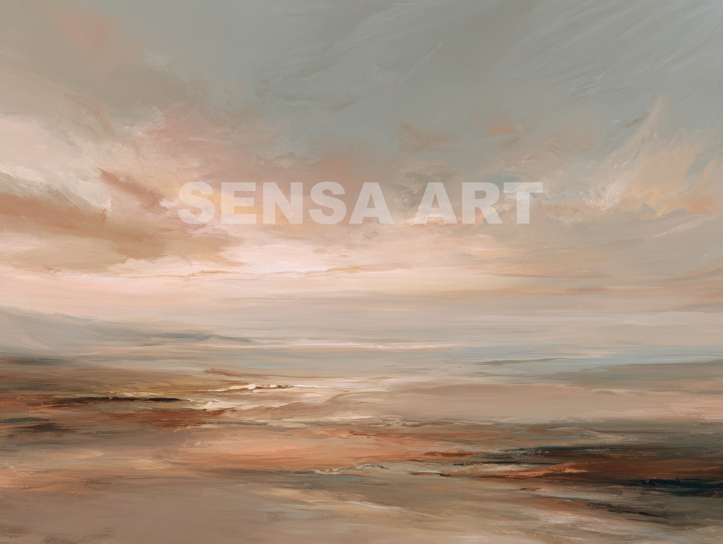 Este cuadro abstracto de paisaje marino al óleo utiliza una paleta de tonos cálidos y neutros como terracota, beige y gris suave, evocando la calma del horizonte al atardecer. Las pinceladas fluidas y expresivas transmiten movimiento y serenidad, creando una obra contemporánea llena de atmósfera. Perfecta para decoración moderna y espacios elegantes, esta pintura aporta calidez y sofisticación tanto en salones como en dormitorios u oficinas. Su estilo atemporal convierte cada mirada en un viaje visual hacia la tranquilidad y la contemplación.