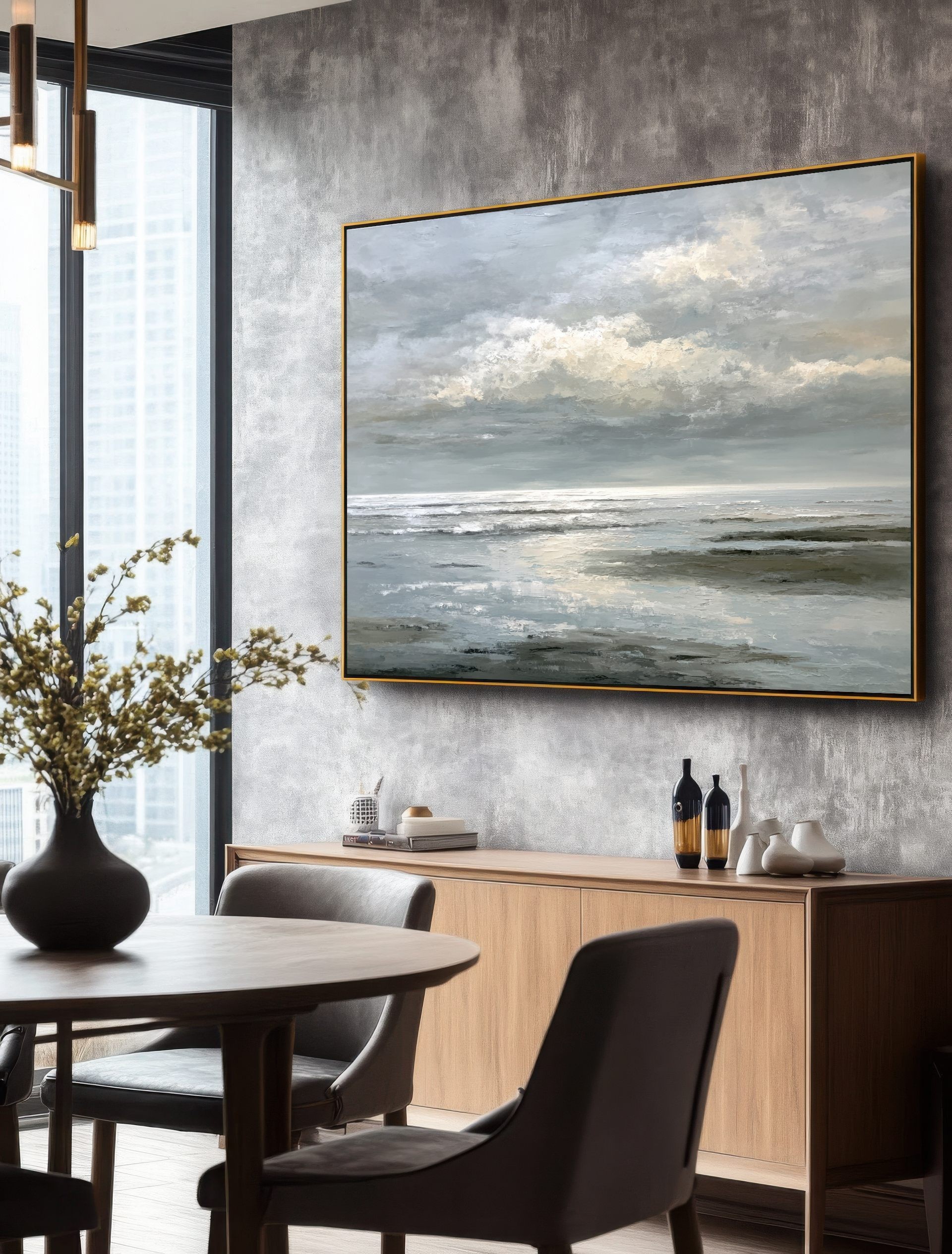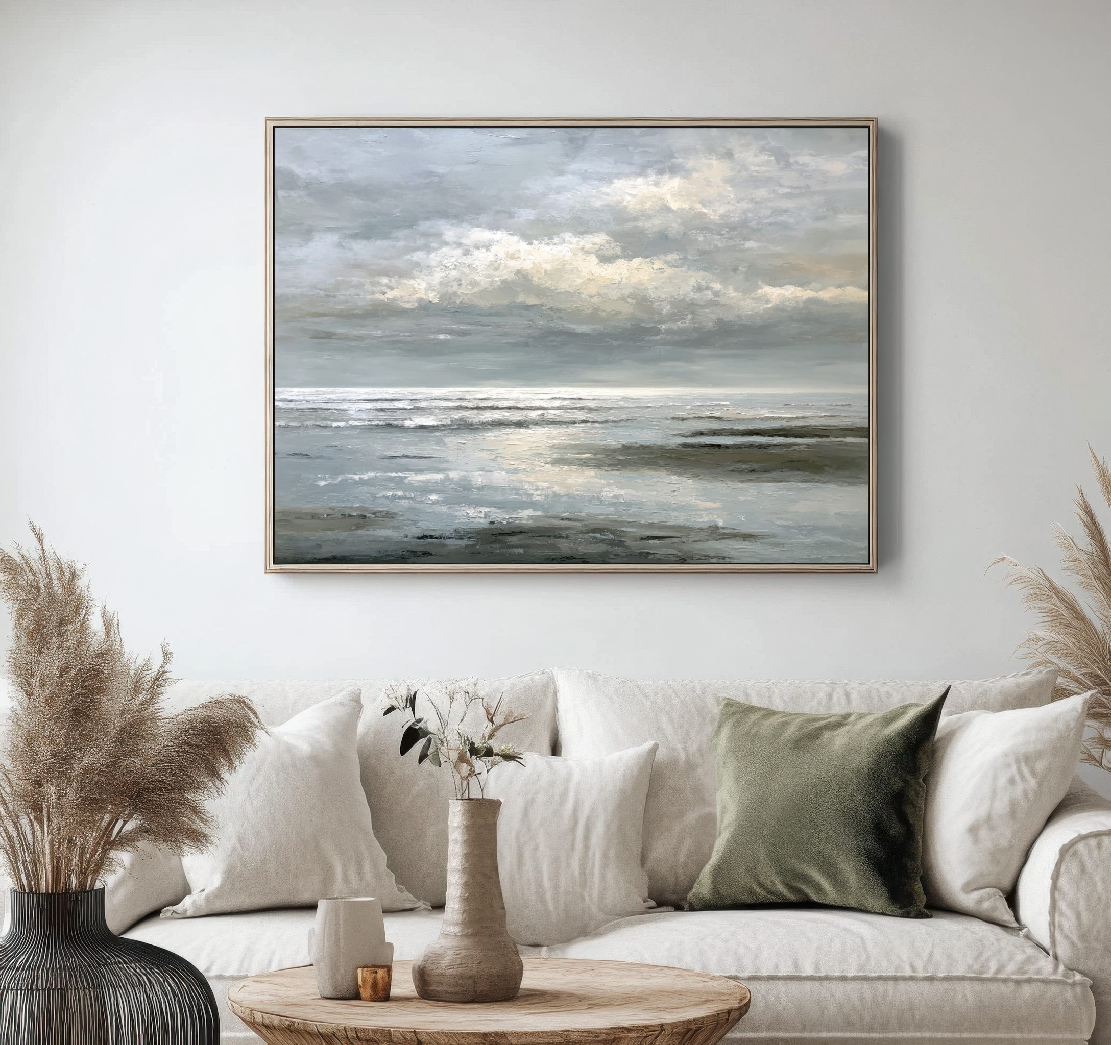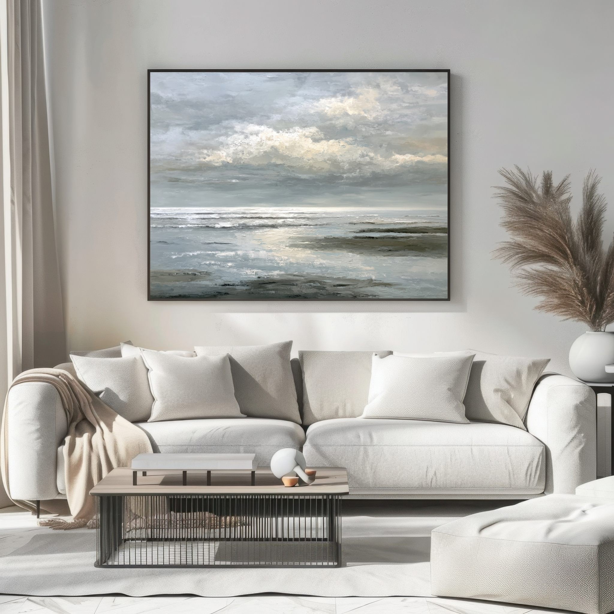 Este cuadro abstracto de paisaje marino refleja la serenidad del océano bajo un cielo cubierto, con una paleta en tonos grises, blancos y suaves matices beige. Las pinceladas texturizadas evocan la espuma de las olas y el reflejo de la luz en el agua, transmitiendo calma y profundidad. Ideal para decoración moderna y ambientes minimalistas, esta obra aporta elegancia y frescura a salones, oficinas o dormitorios. Su estilo atemporal y contemporáneo la convierte en una pieza versátil que inspira contemplación y armonía visual.