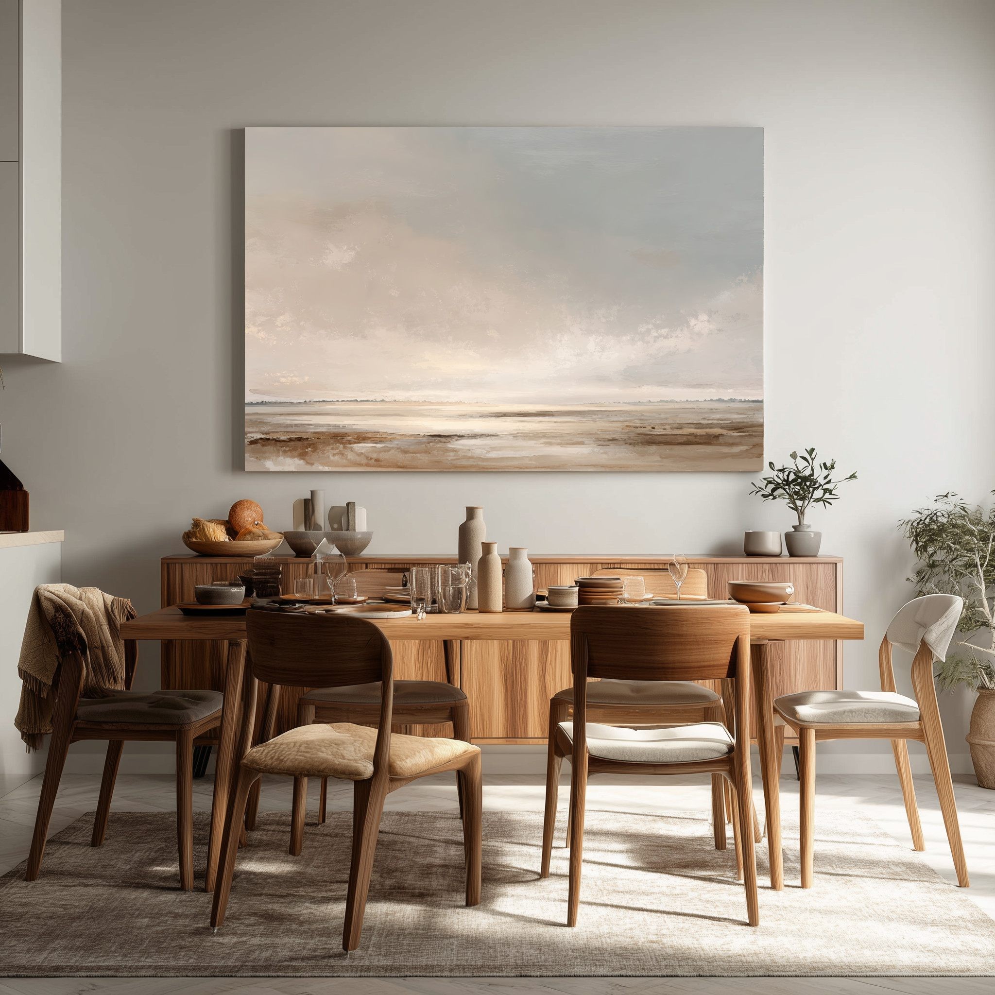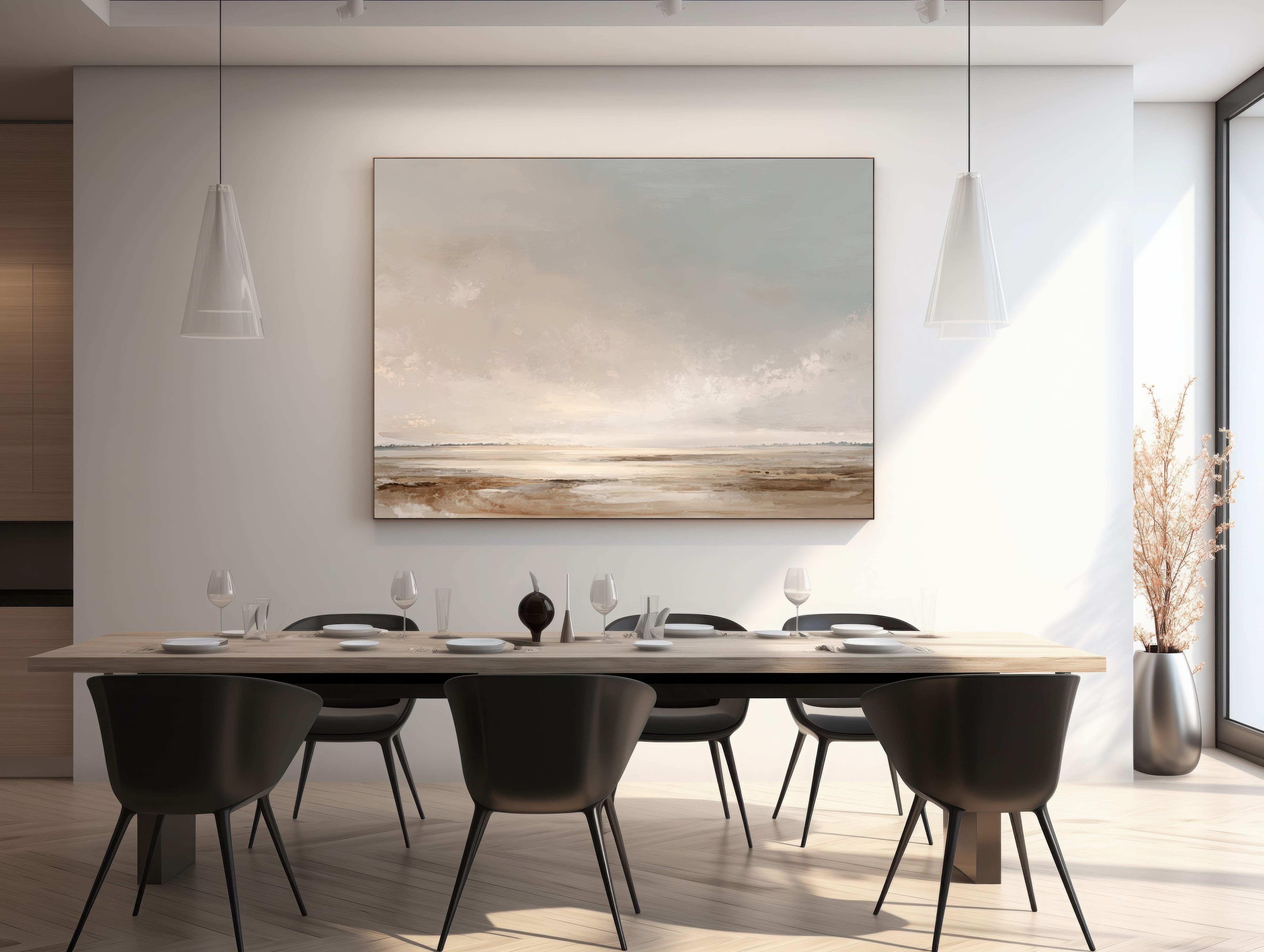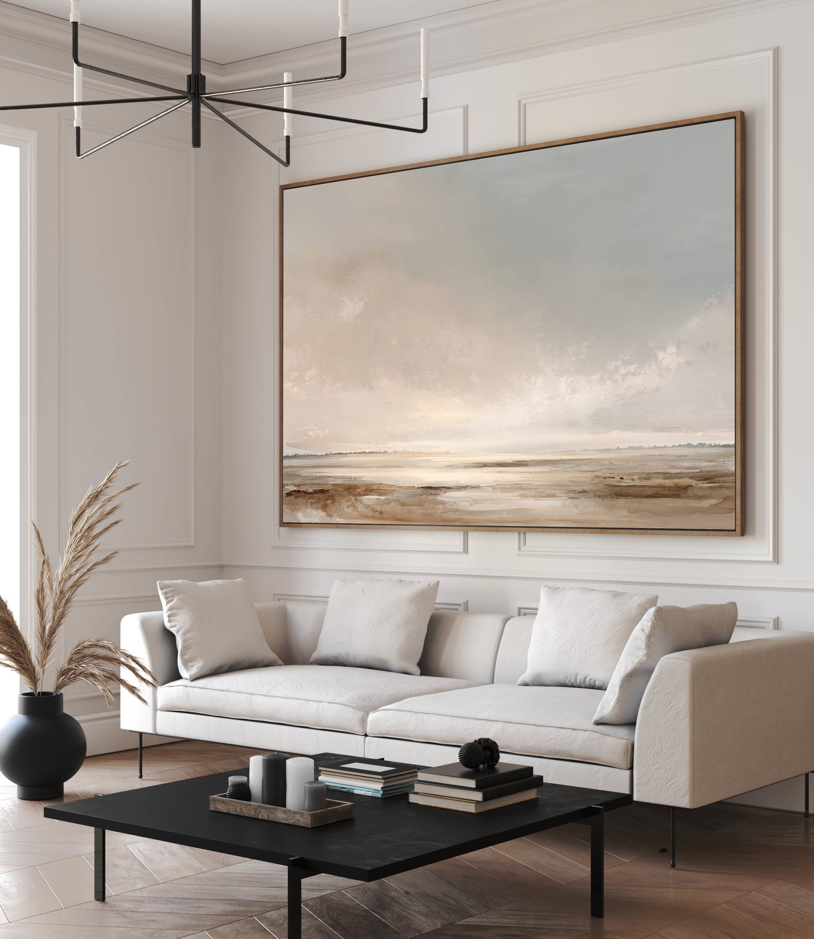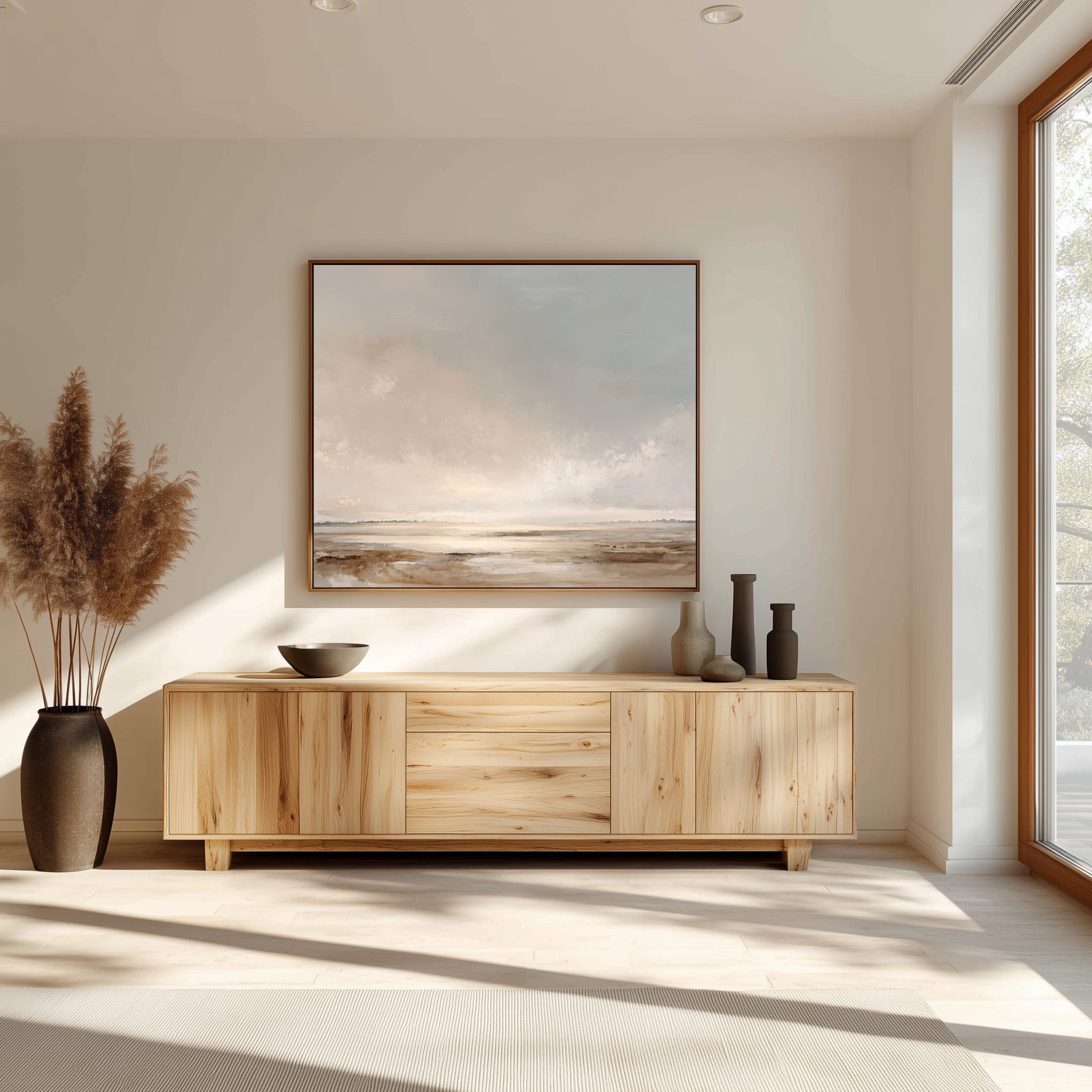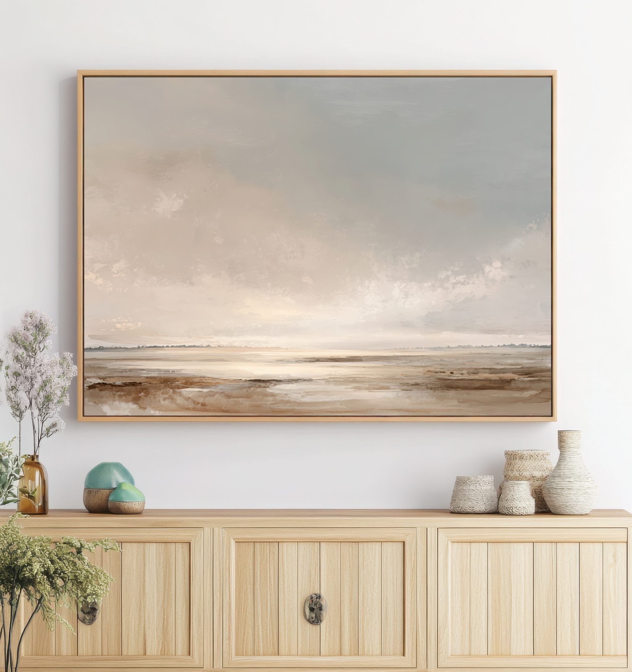 Este cuadro abstracto minimalista evoca un paisaje sereno en tonos tierra, beige y grises suaves, con un cielo difuminado que transmite calma y amplitud. Su estilo delicado y contemporáneo convierte cada detalle en una invitación a la contemplación, aportando equilibrio y luminosidad a cualquier ambiente. Ideal para decoración moderna en salones, dormitorios u oficinas, esta obra aporta elegancia atemporal sin sobrecargar el espacio. Perfecto para quienes buscan un arte minimalista y sofisticado que se adapte a diferentes estilos decorativos, realzando el ambiente con sutileza.
