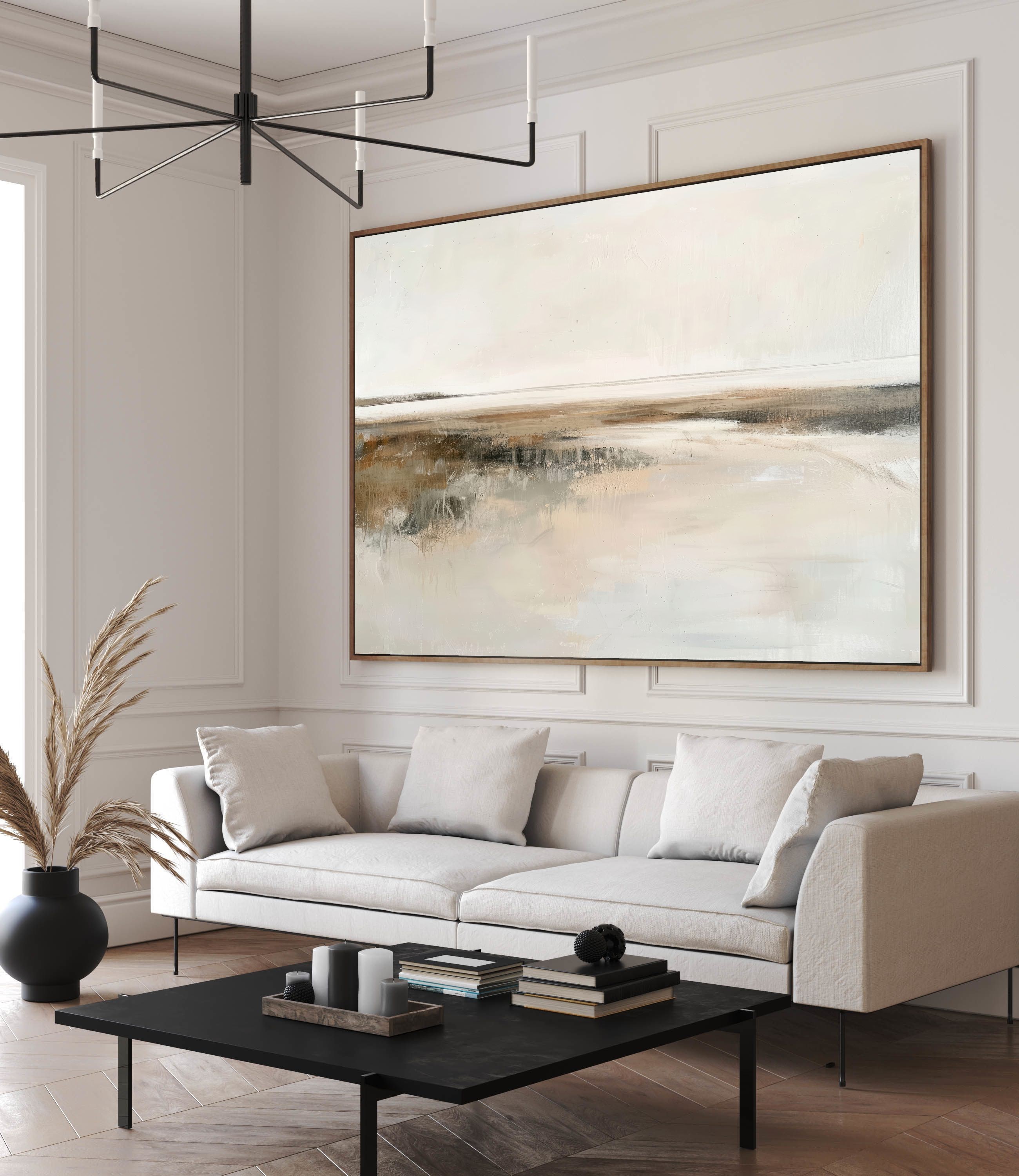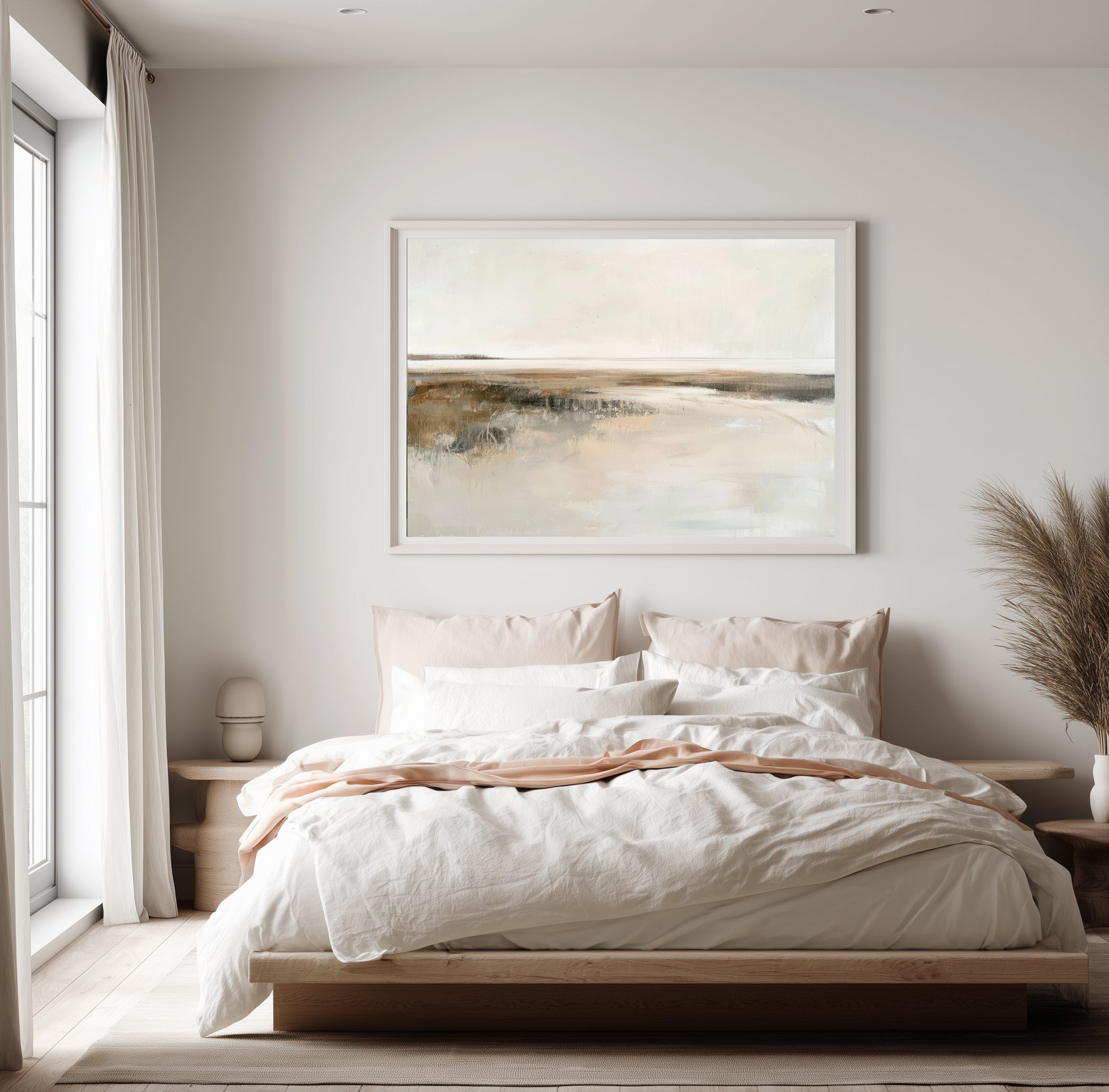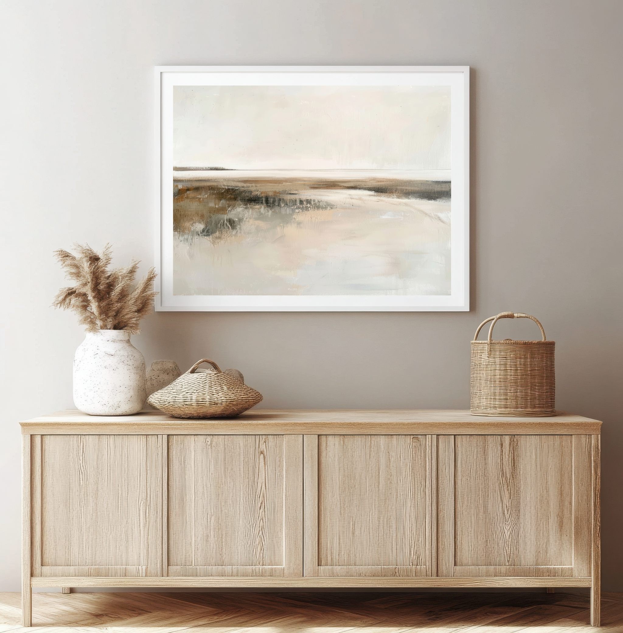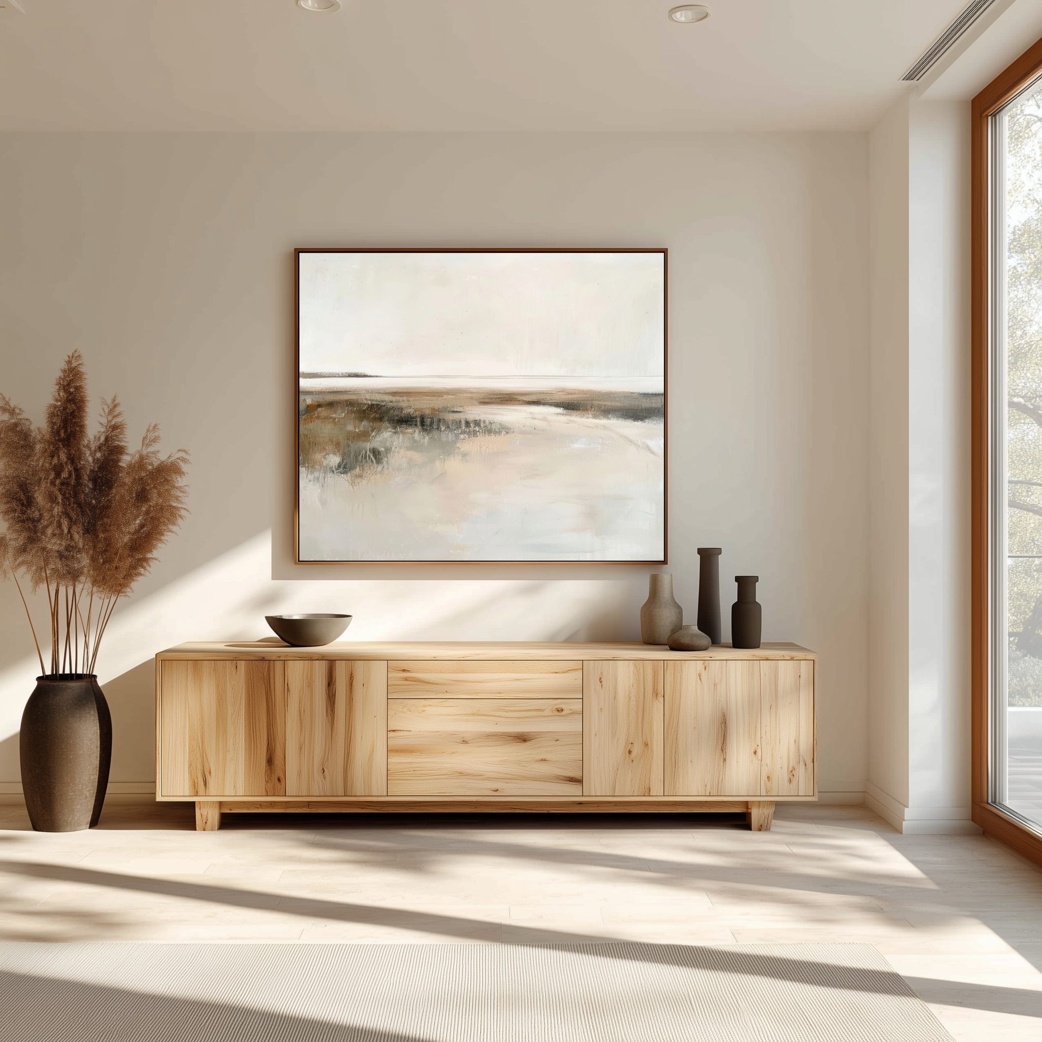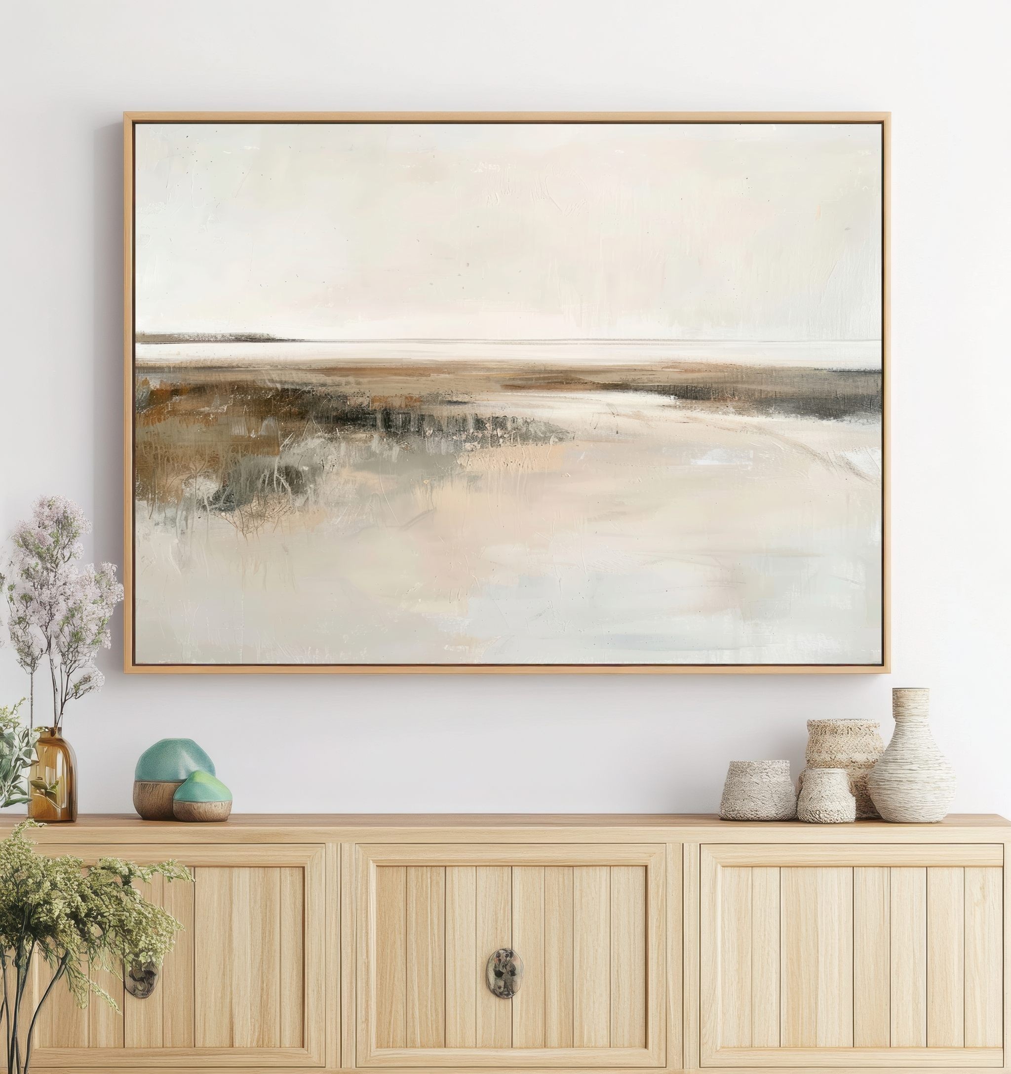Este cuadro abstracto minimalista plasma un paisaje sereno en tonos neutros de beige, blanco roto y marrones suaves. Su estilo contemporáneo y delicado crea una atmósfera relajante, ideal para decorar salones, dormitorios u oficinas. Las pinceladas sutiles evocan la calma de un horizonte infinito, aportando elegancia y sofisticación a cualquier espacio. Perfecto para quienes buscan una obra de arte moderna y atemporal que combine con interiores nórdicos, Japandi, escandinavos o minimalistas, convirtiéndose en el punto focal de la decoración sin sobrecargar el ambiente.