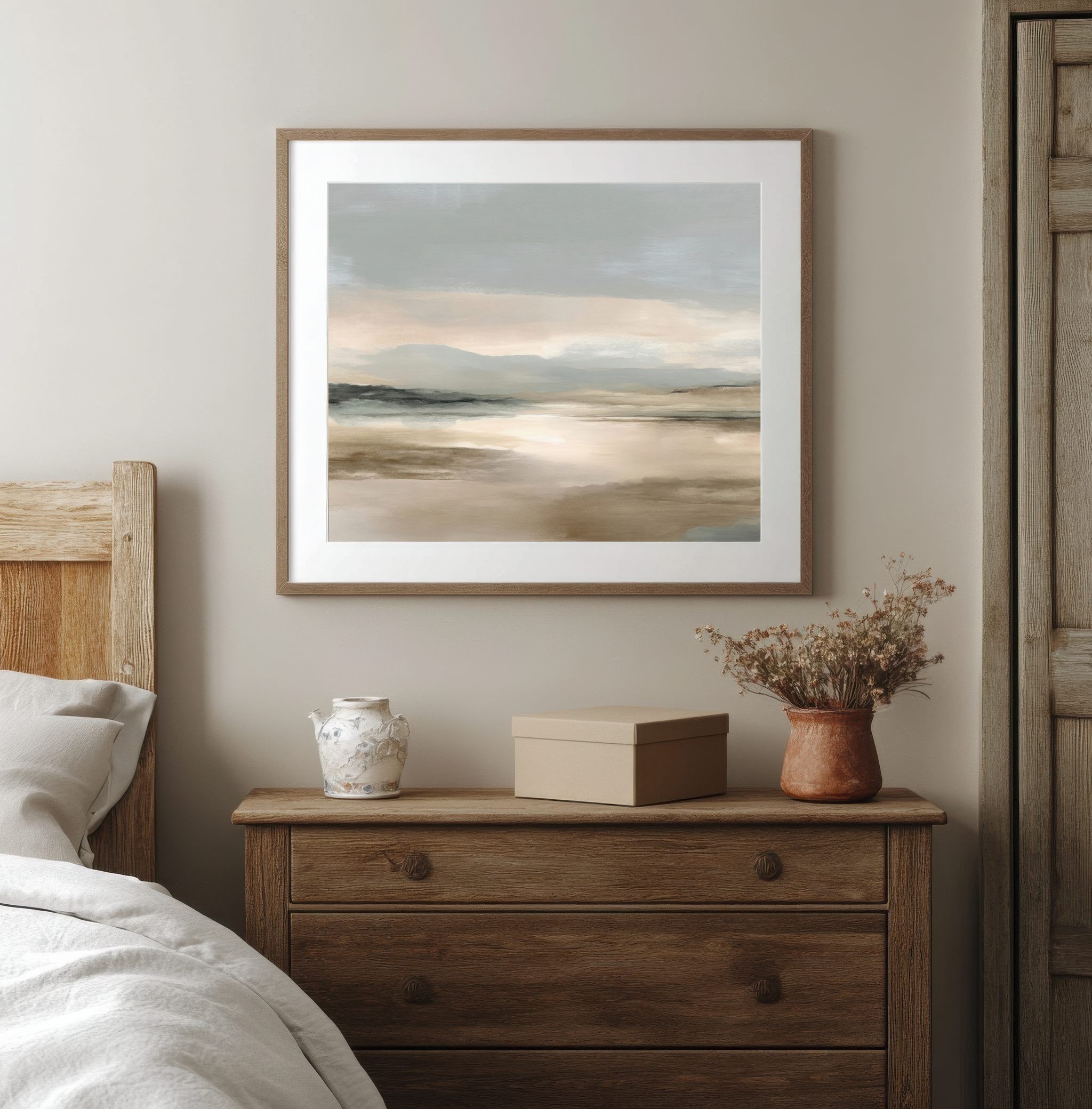 El cuadro abstracto Horizonte Sereno captura la esencia de la calma natural a través de una paleta suave de tonos tierra, beige y gris claro. Su composición minimalista y etérea evoca paisajes lejanos envueltos en niebla, creando una sensación de equilibrio y paz. Ideal para interiores modernos, Japandi o escandinavos, esta obra aporta calidez y sofisticación a cualquier espacio. Un diseño atemporal que combina arte y serenidad, perfecto para quienes buscan una decoración elegante, armoniosa y llena de luz natural.