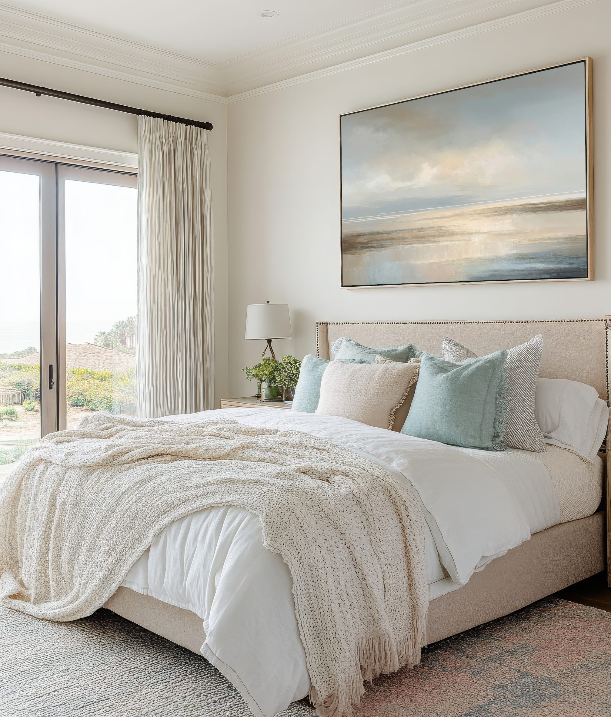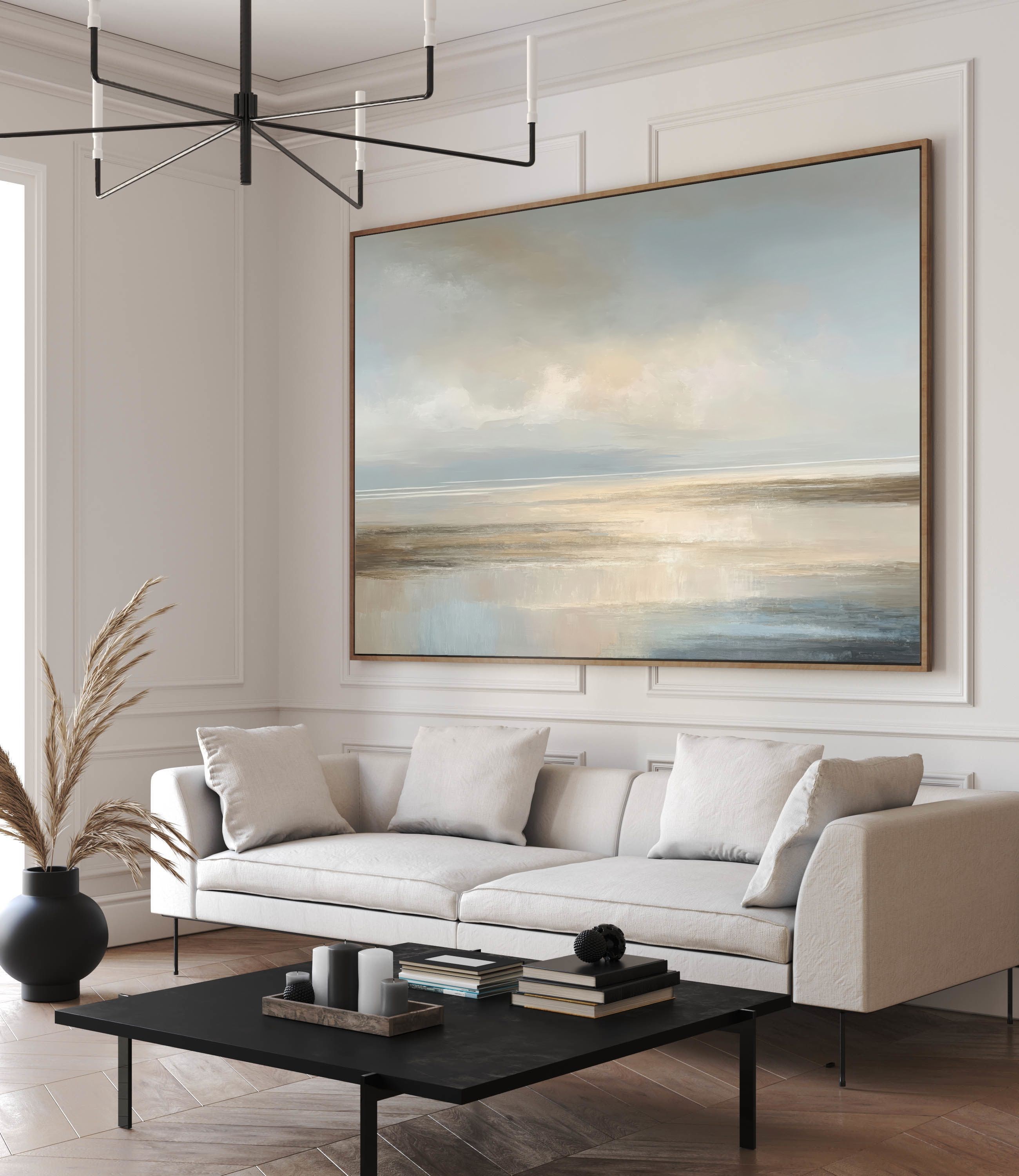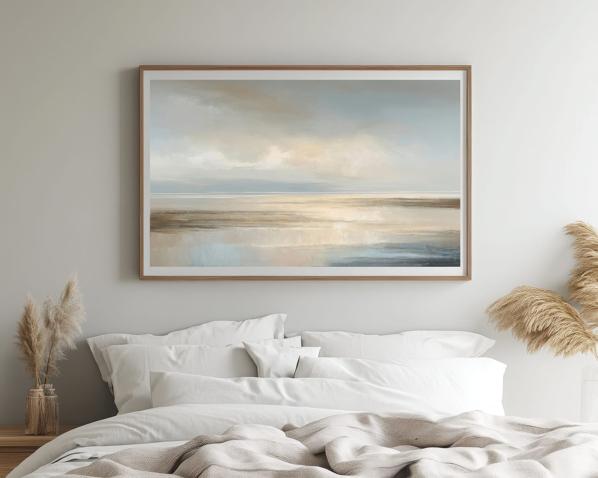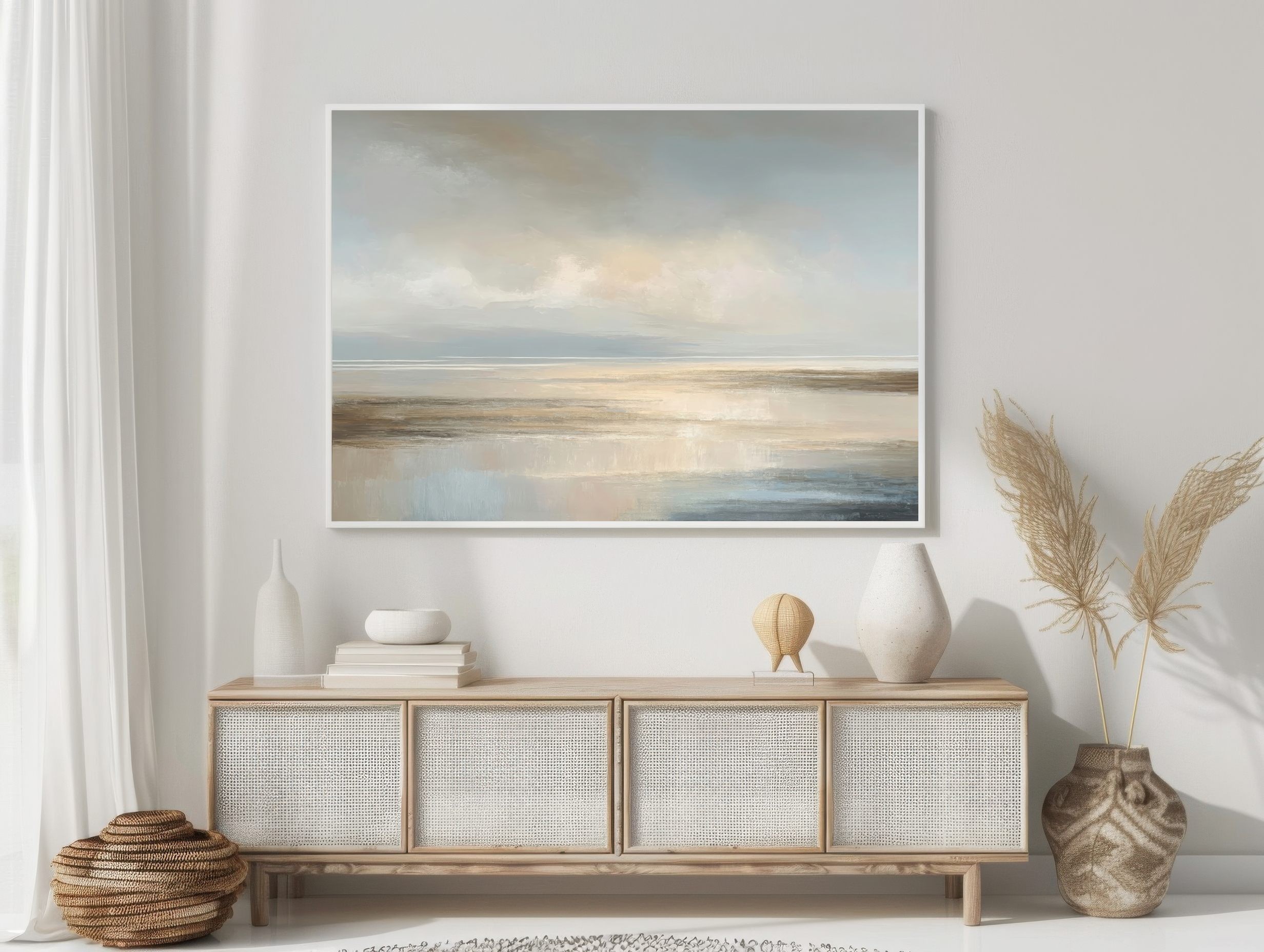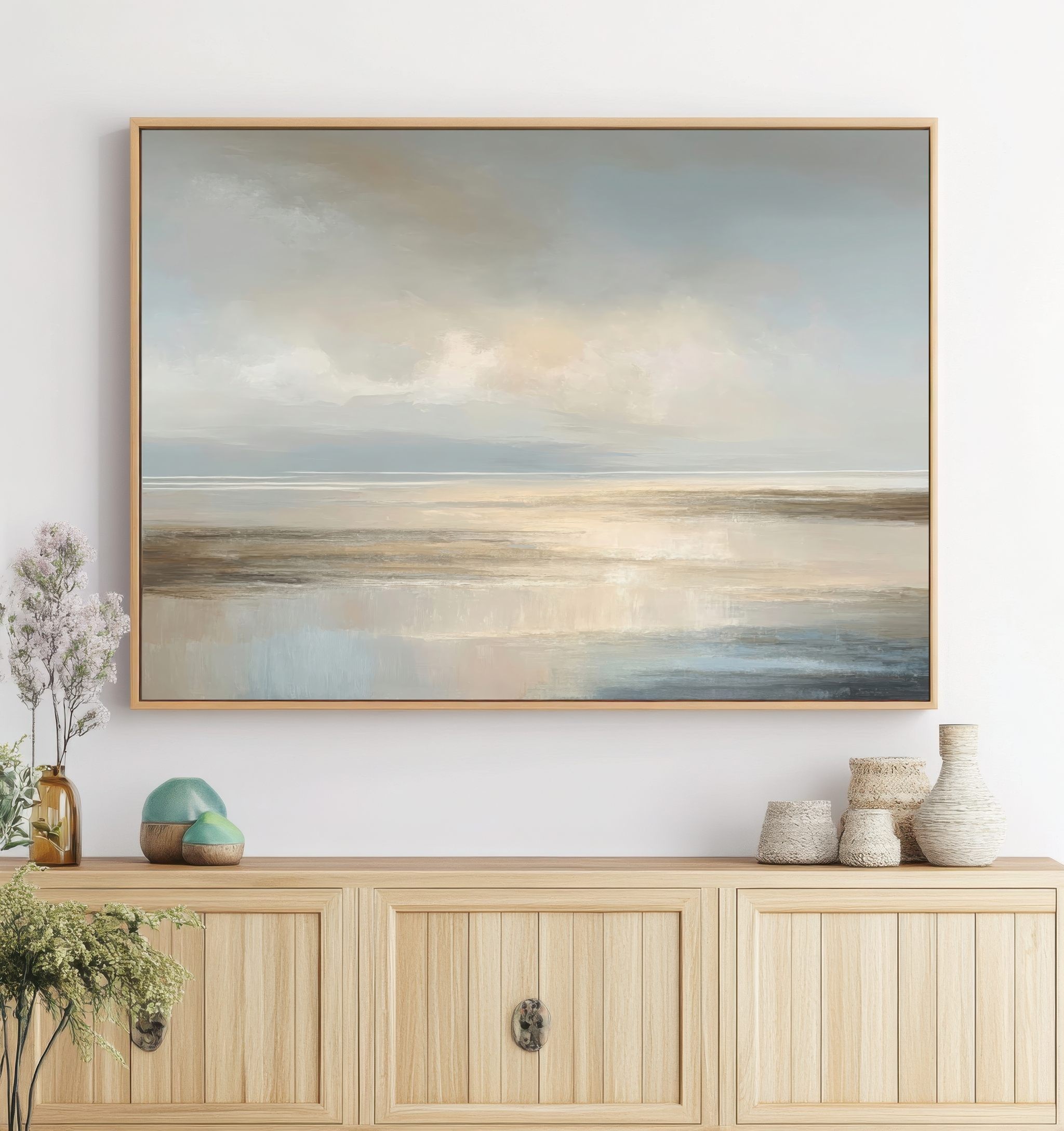 El cuadro abstracto Horizonte Calmado evoca la serenidad del mar en calma con una delicada mezcla de tonos neutros, beige, azul suave y arena dorada. Su composición minimalista refleja equilibrio, luz y amplitud, creando una atmósfera relajante ideal para interiores contemporáneos, costeros o Japandi. Esta obra aporta luminosidad y armonía visual, perfecta para salones, dormitorios o espacios de descanso donde se busca una sensación de paz y sofisticación natural. Arte elegante y atemporal para ambientes tranquilos y acogedores.
