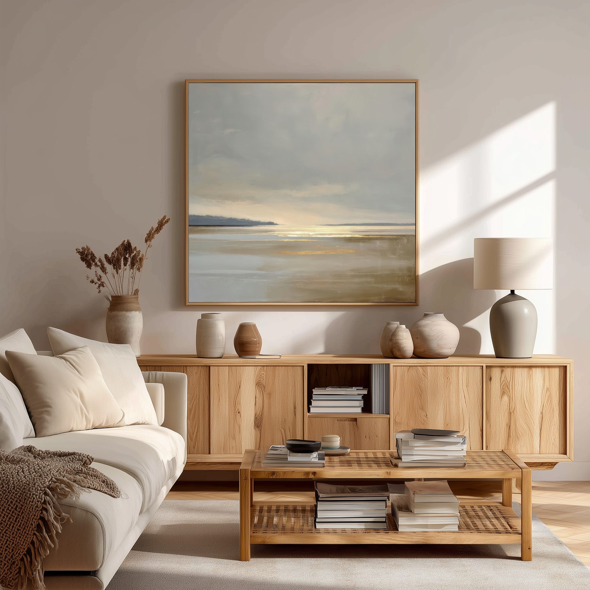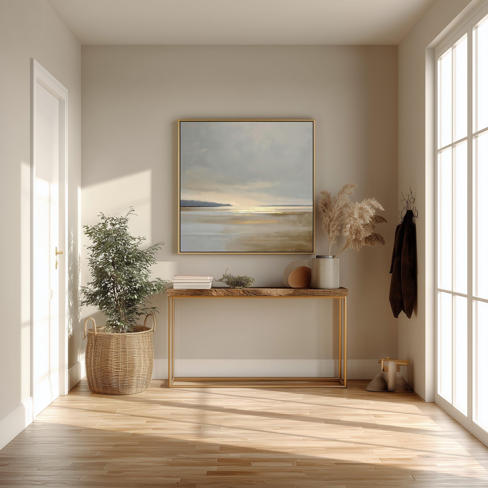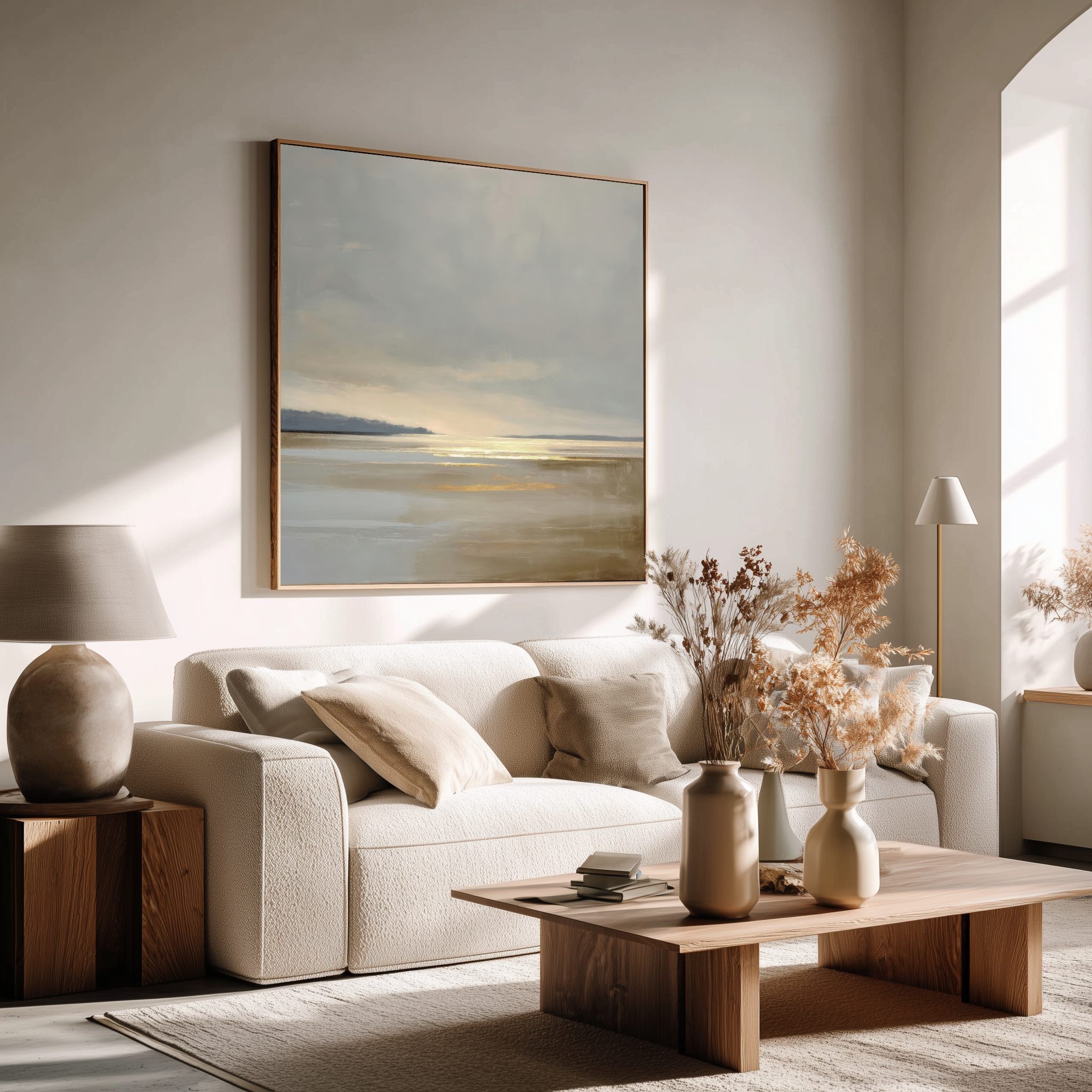 El cuadro abstracto Luz Dorada transmite serenidad y elegancia a través de una composición suave en tonos neutros, beige, arena y dorado tenue. Su atmósfera luminosa evoca el reflejo del sol sobre el mar al atardecer, creando una sensación de paz y equilibrio. Ideal para interiores modernos, minimalistas o Japandi, este diseño aporta calidez y sofisticación natural. Perfecto para salones, dormitorios o espacios de descanso que buscan un toque artístico refinado y armónico con la luz y los tonos naturales.