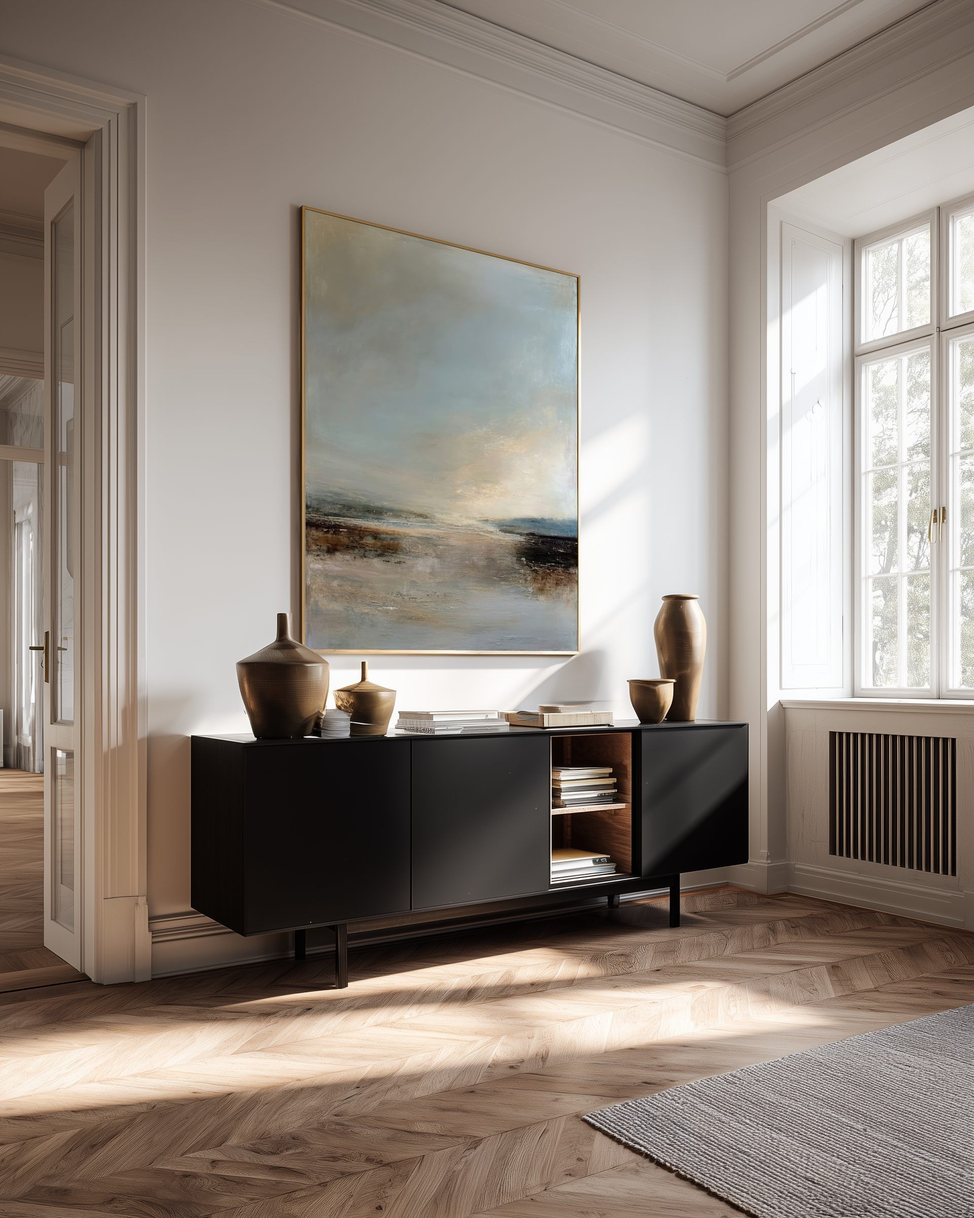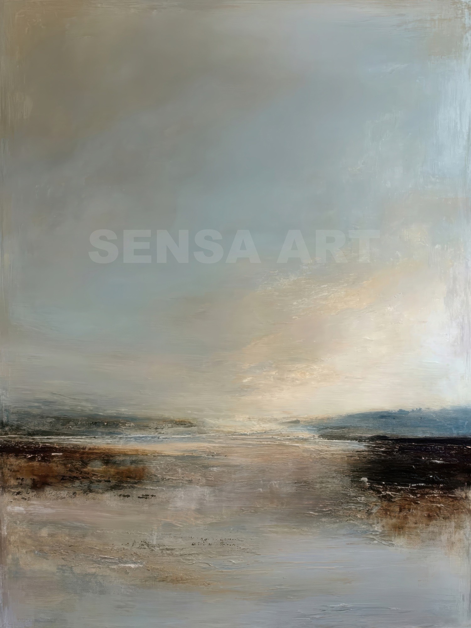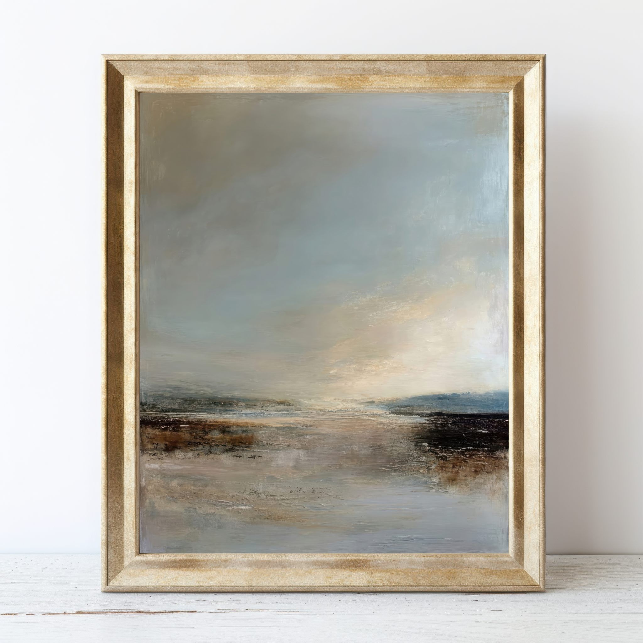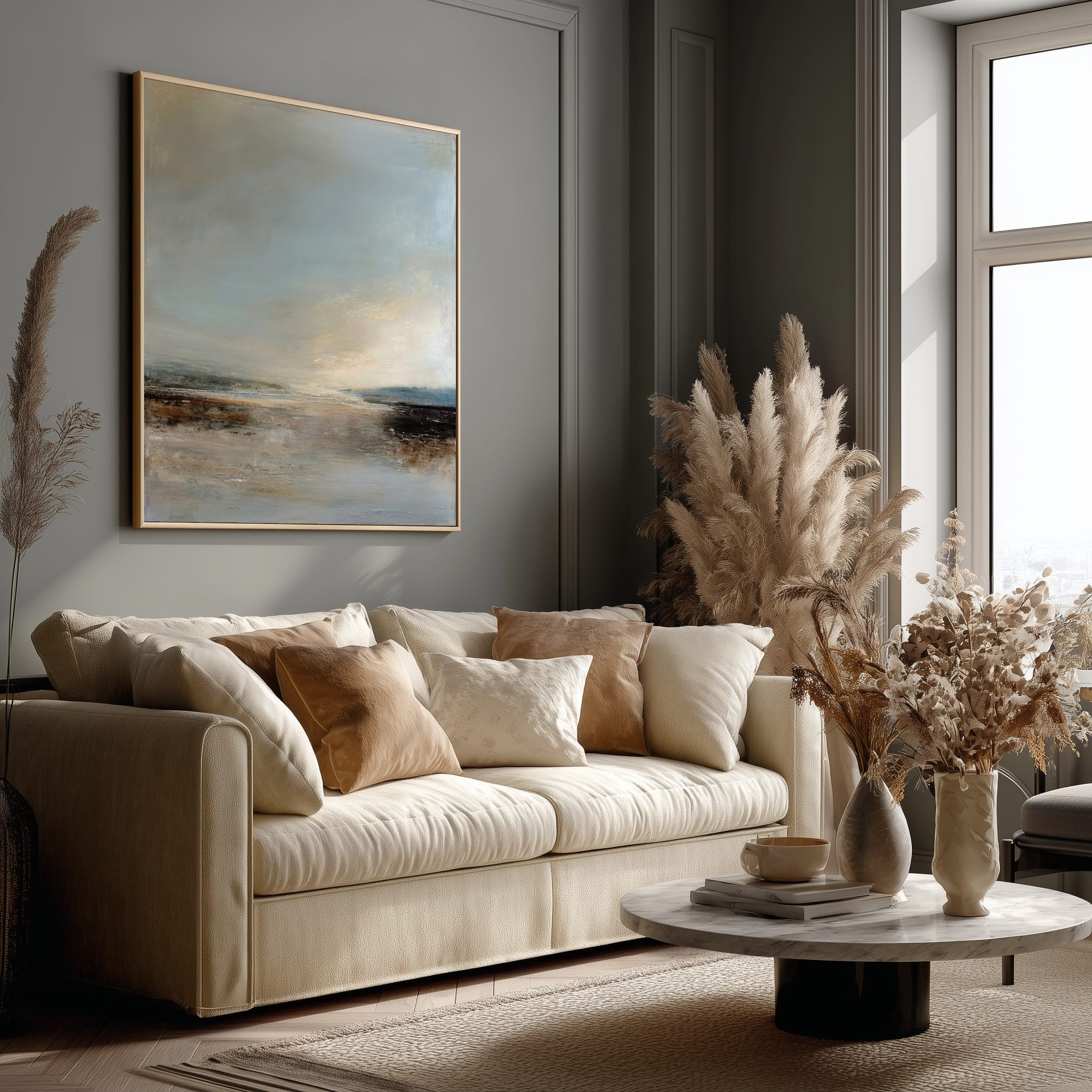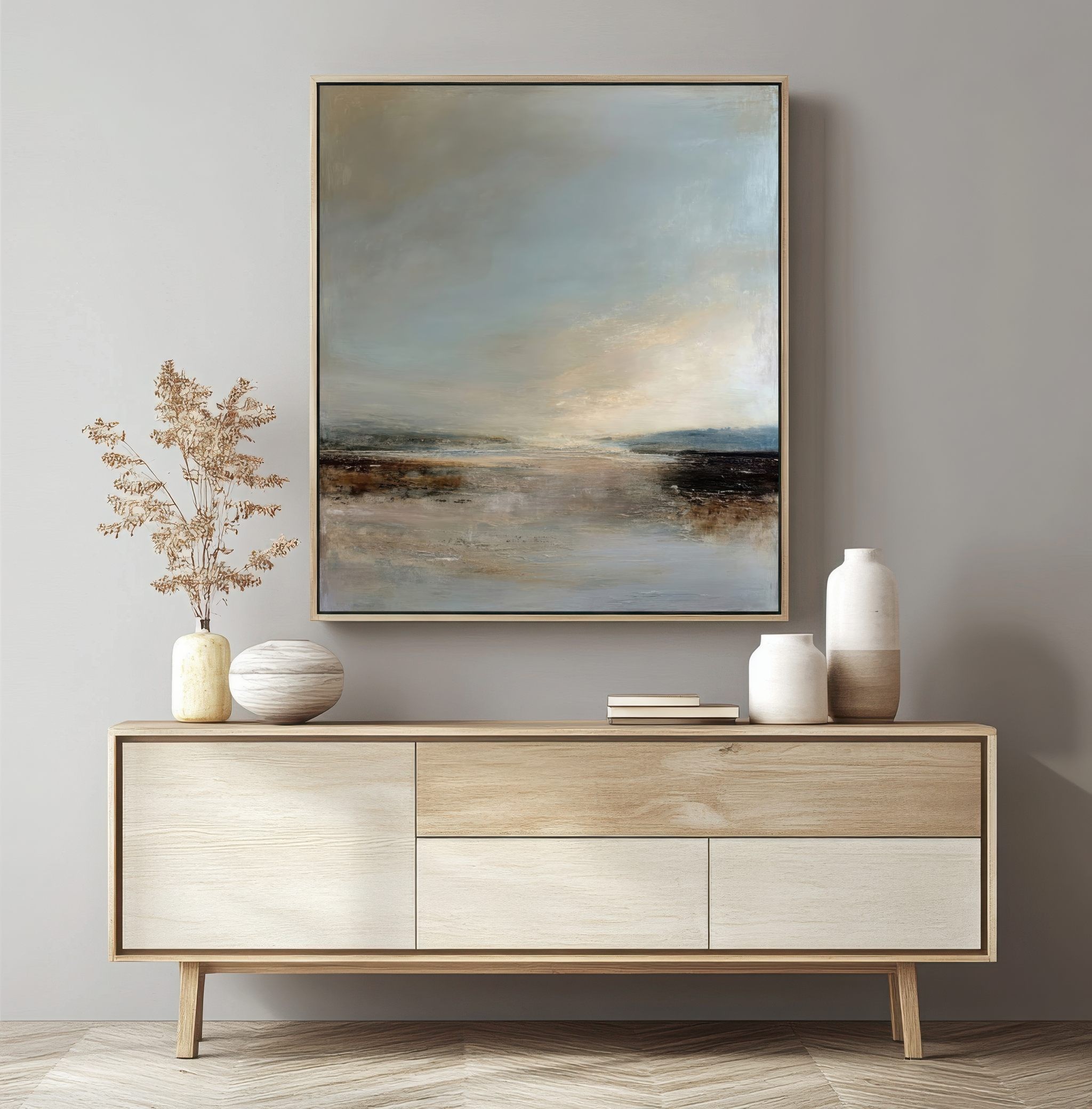 El cuadro abstracto Earth Reflection captura la calma de un paisaje sereno con matices de azul claro, beige y marrón tierra. Su composición difuminada y luminosa transmite una sensación de equilibrio natural, perfecta para interiores modernos, costeros o Japandi. Inspirado en la quietud del horizonte tras la lluvia, este diseño invita al descanso y la contemplación. Ideal para salones, dormitorios o espacios de meditación, donde su atmósfera suave y armónica aporta calidez, profundidad y un toque artístico atemporal.