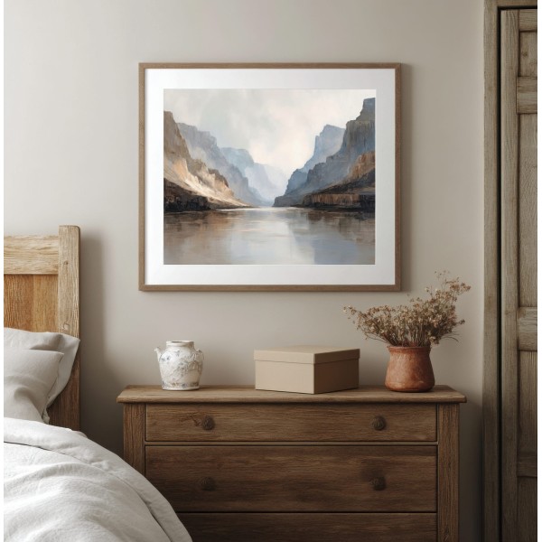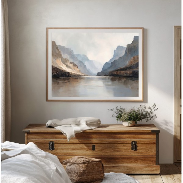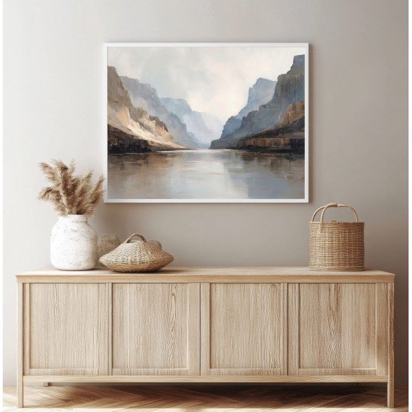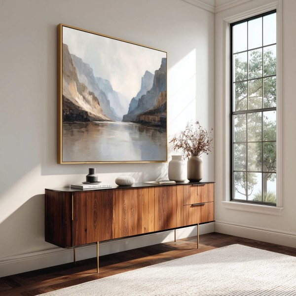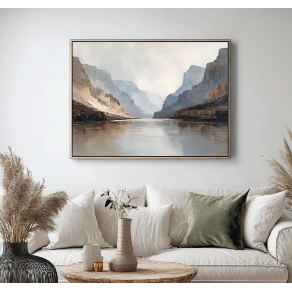 Este cuadro abstracto de paisaje está inspirado en la majestuosidad de un cañón natural, representado a través de tonos neutros, arenas suaves y grises luminosos. Su composición transmite calma, amplitud y una sensación de profundidad ideal para interiores contemporáneos. Es un cuadro decorativo moderno perfecto para salones, dormitorios u oficinas, especialmente en espacios de estilo minimalista, Japandi o natural. Una obra elegante que aporta luz, equilibrio visual y sofisticación sin sobrecargar el ambiente.