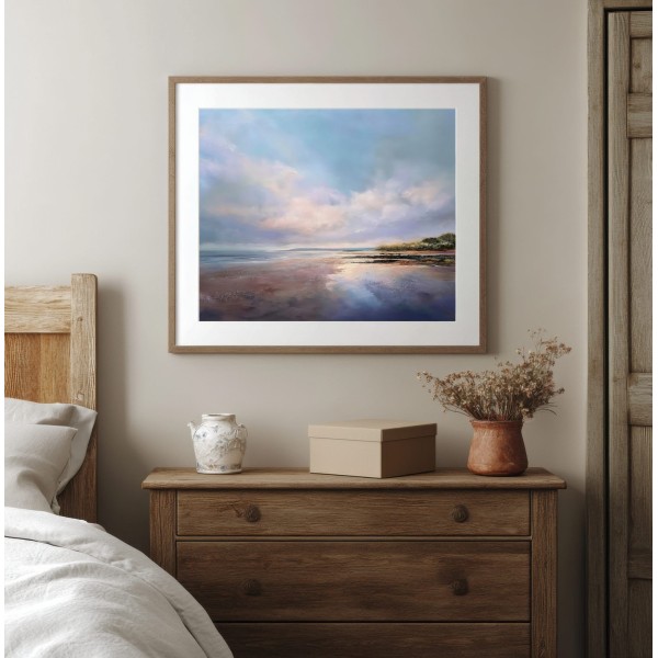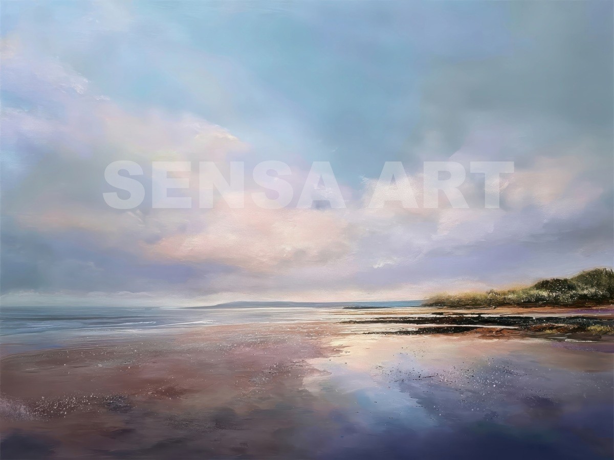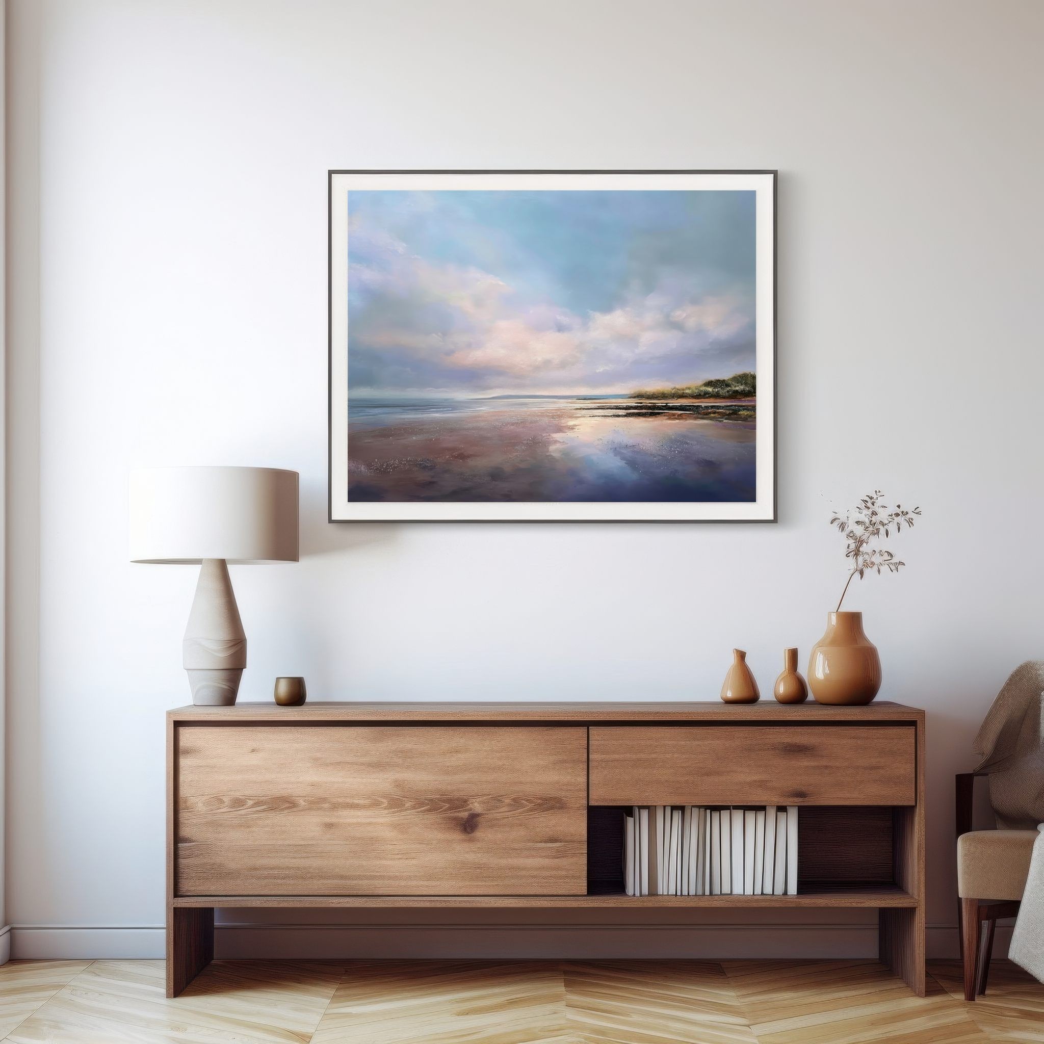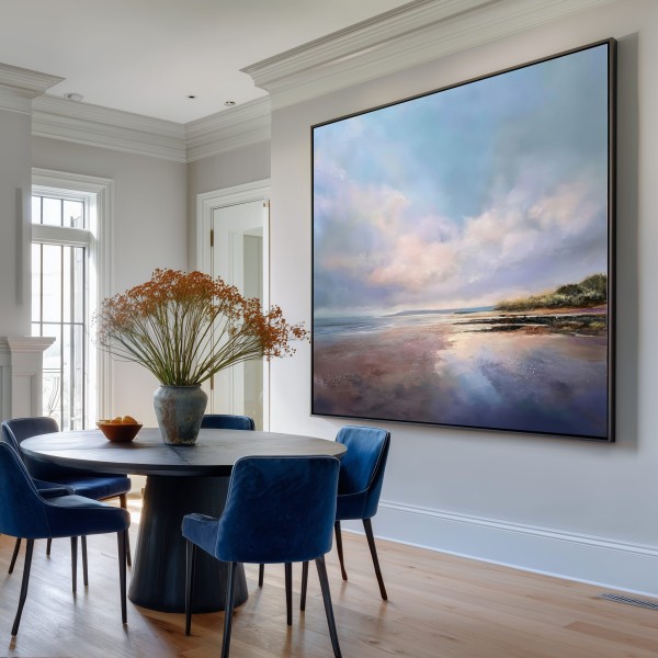Este cuadro abstracto de paisaje marino transmite una atmósfera serena y envolvente a través de tonos pastel, azules empolvados y matices rosados. La composición difusa evoca una costa tranquila al amanecer, con reflejos suaves que aportan calma, profundidad y ligereza visual. Es un cuadro decorativo moderno ideal para salones, dormitorios o espacios de estilo minimalista, Japandi o nórdico. Su paleta equilibrada lo convierte en una pieza perfecta para crear ambientes relajantes y luminosos.