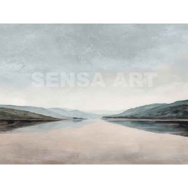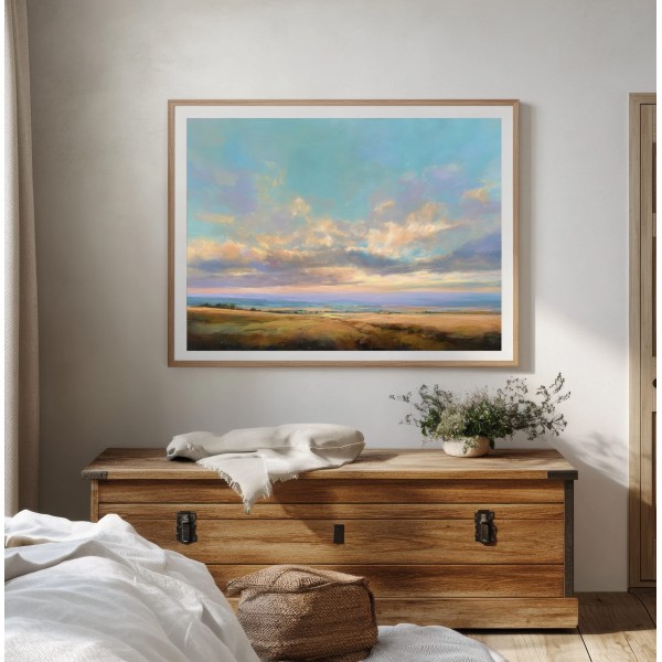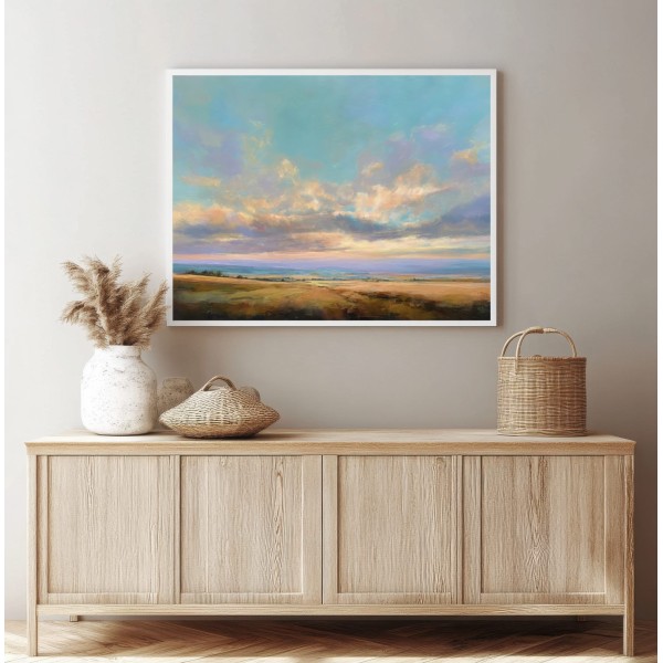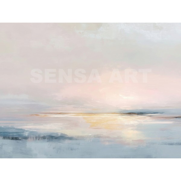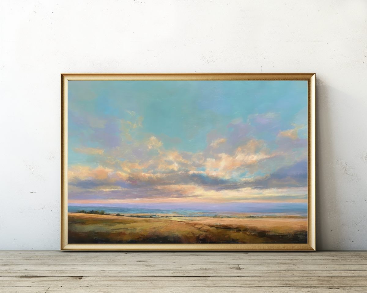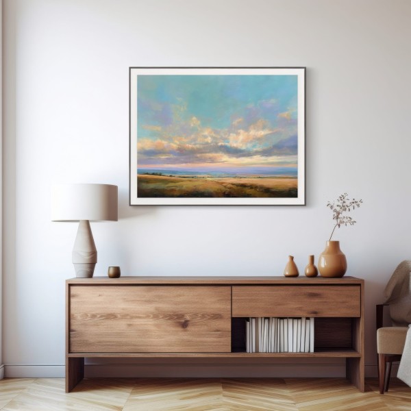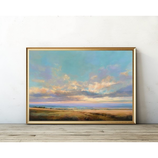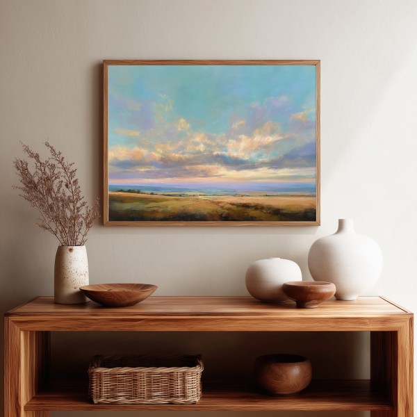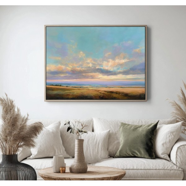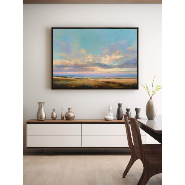 Este cuadro abstracto de paisaje destaca por un cielo amplio y luminoso trabajado en tonos pastel, azules suaves, ocres y matices rosados que transmiten calma y serenidad. La composición evoca un paisaje abierto y natural, con una sensación de profundidad y equilibrio visual ideal para espacios contemporáneos. Es un cuadro decorativo moderno perfecto para salones, dormitorios o zonas de descanso, encajando a la perfección en interiores de estilo minimalista, Japandi o nórdico.