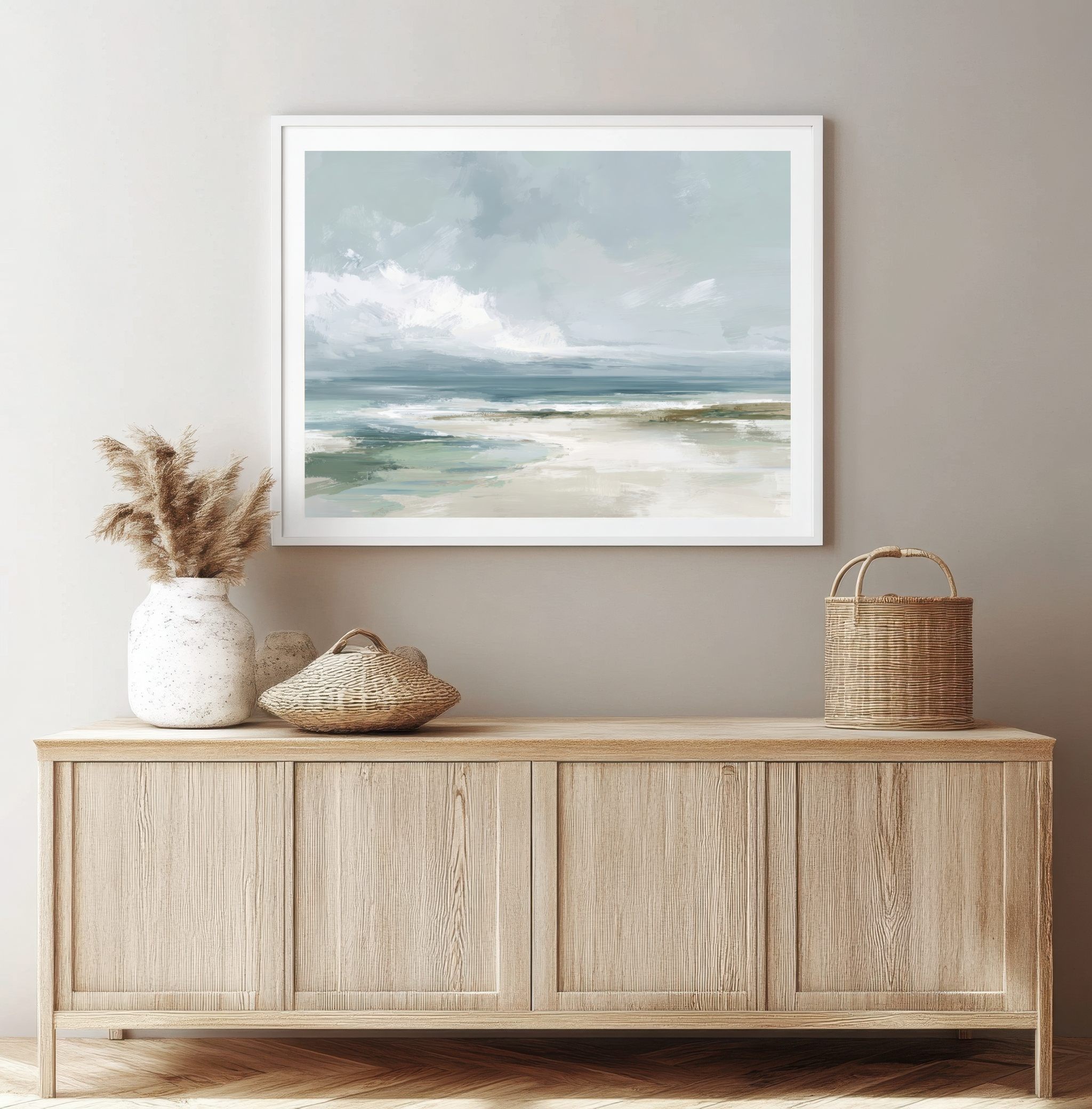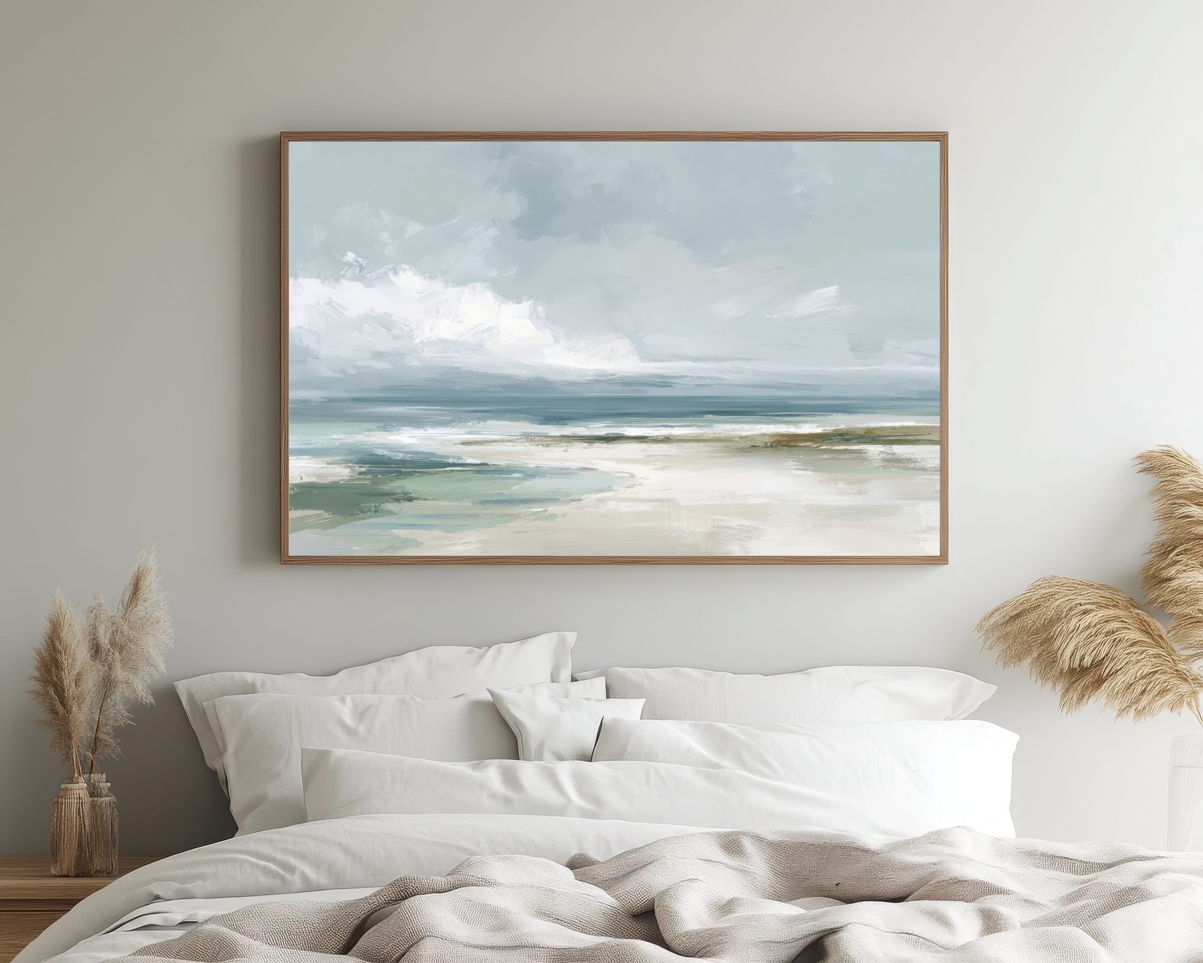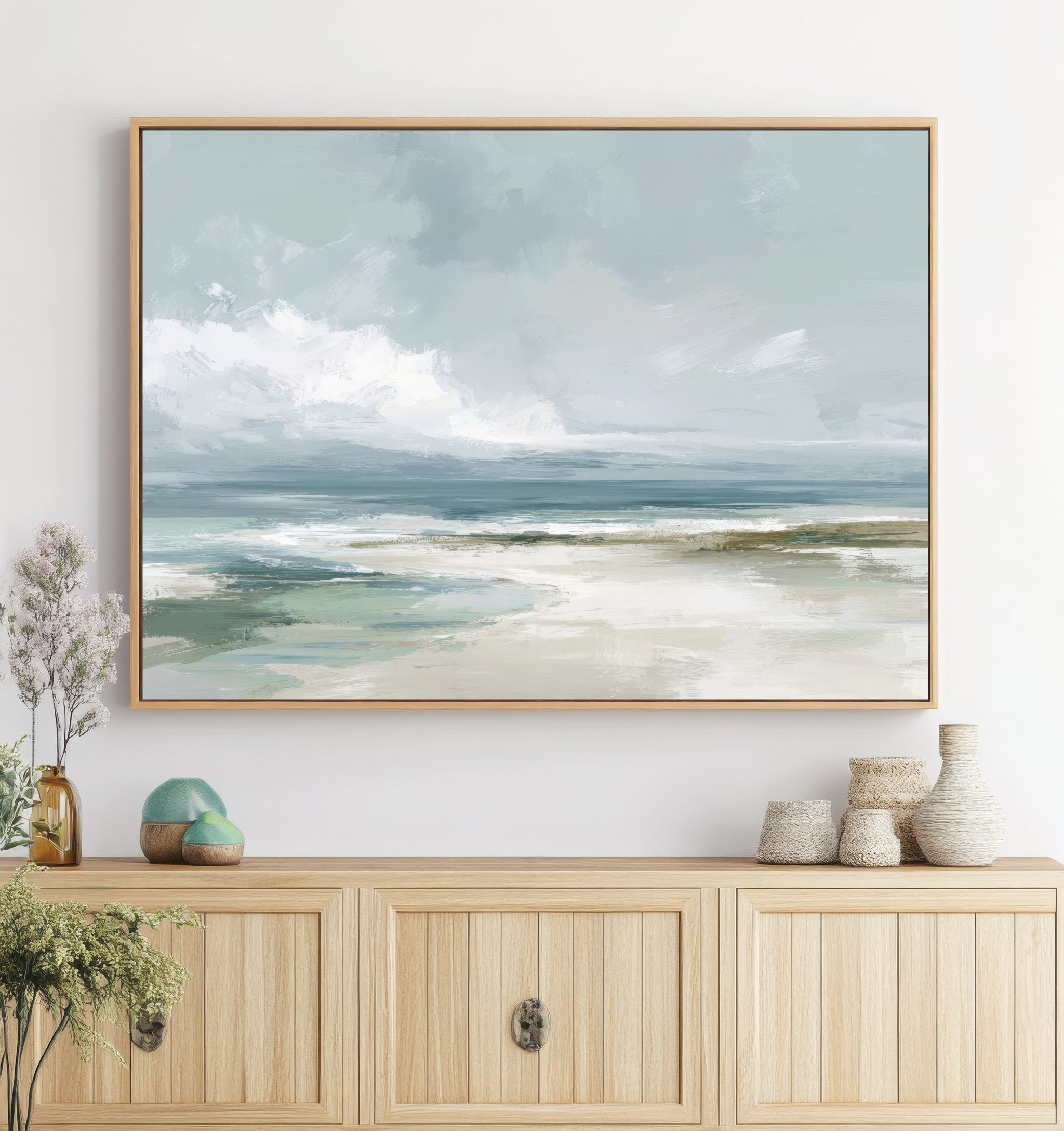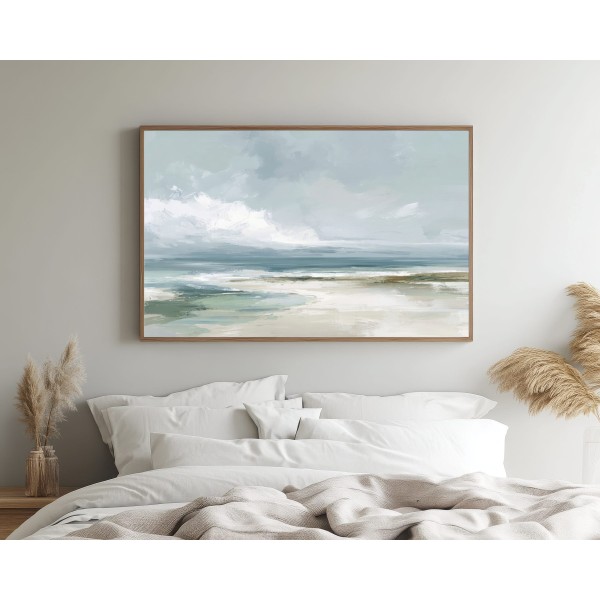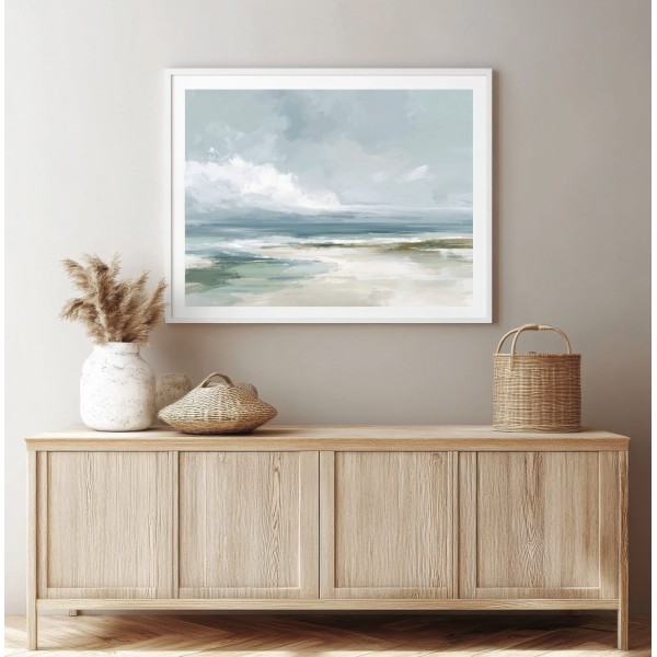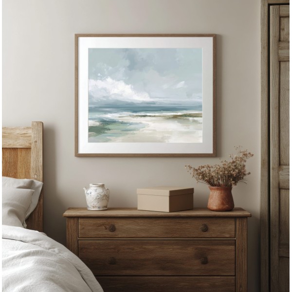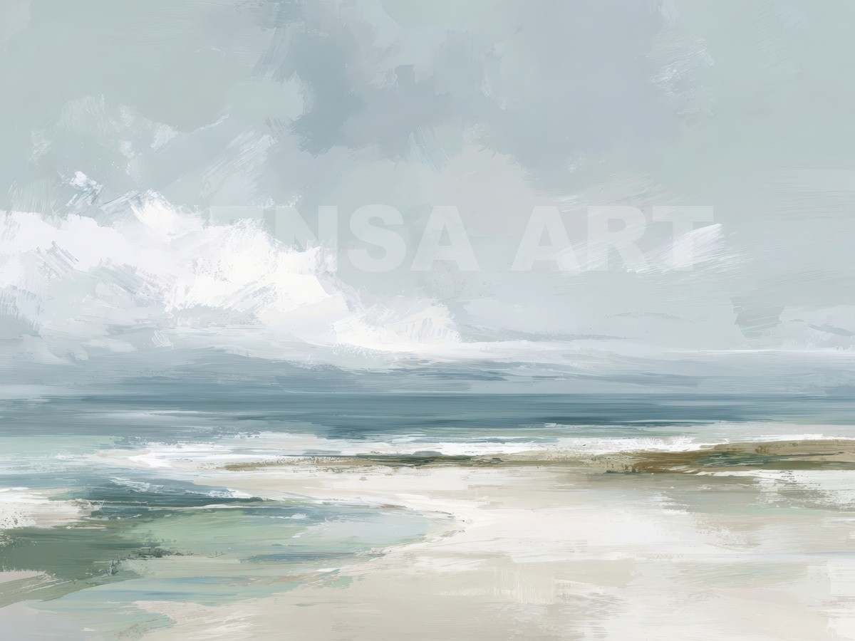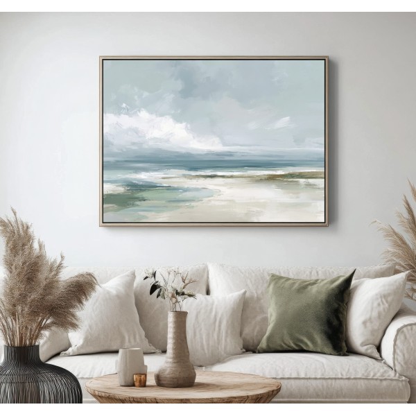 Este cuadro abstracto de paisaje costero evoca la serenidad del mar abierto a través de una composición ligera y etérea, dominada por tonos suaves de azul, verde agua y arena. Las pinceladas amplias y difuminadas crean una atmósfera de calma y profundidad visual, ideal para interiores que buscan equilibrio y luminosidad. Es un cuadro decorativo moderno perfecto para salones, dormitorios y espacios de descanso, especialmente en estilos minimalista, Japandi, nórdico y mediterráneo, aportando frescura y sensación de amplitud.