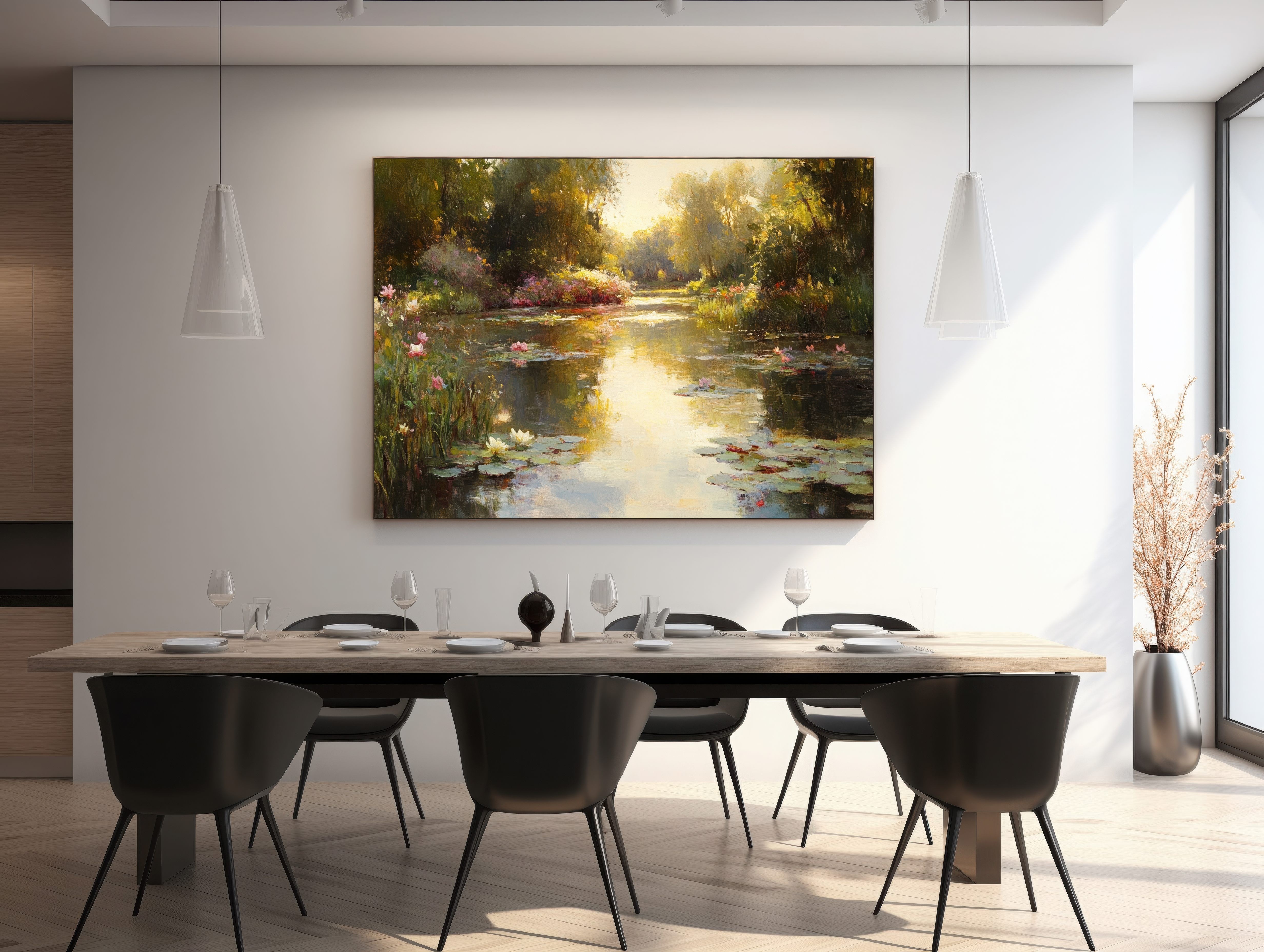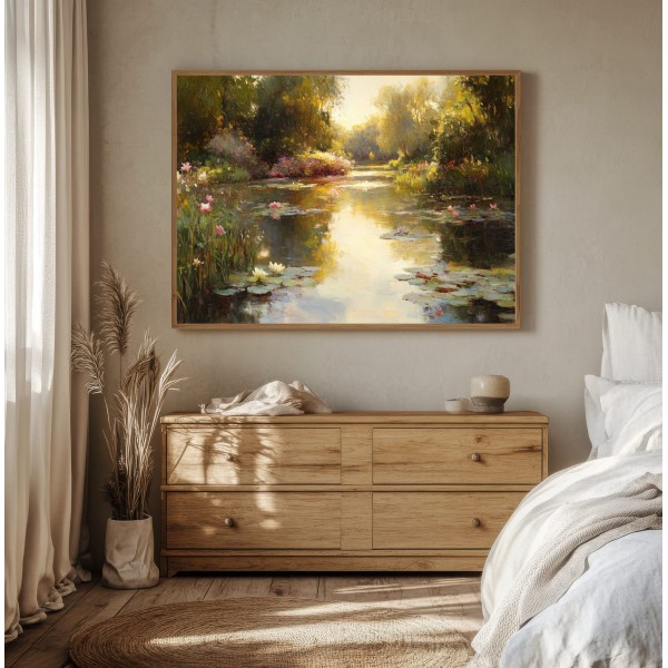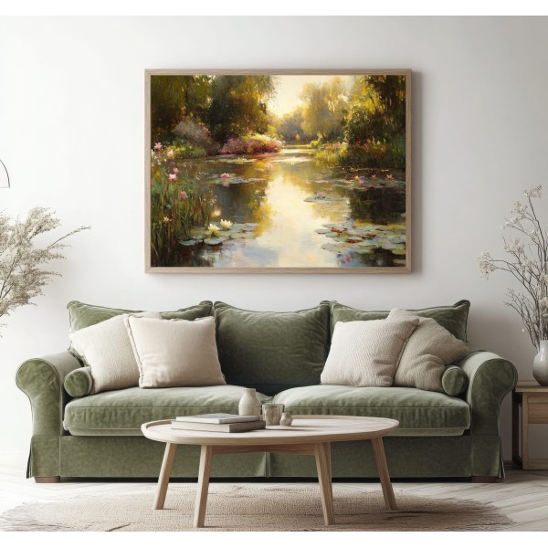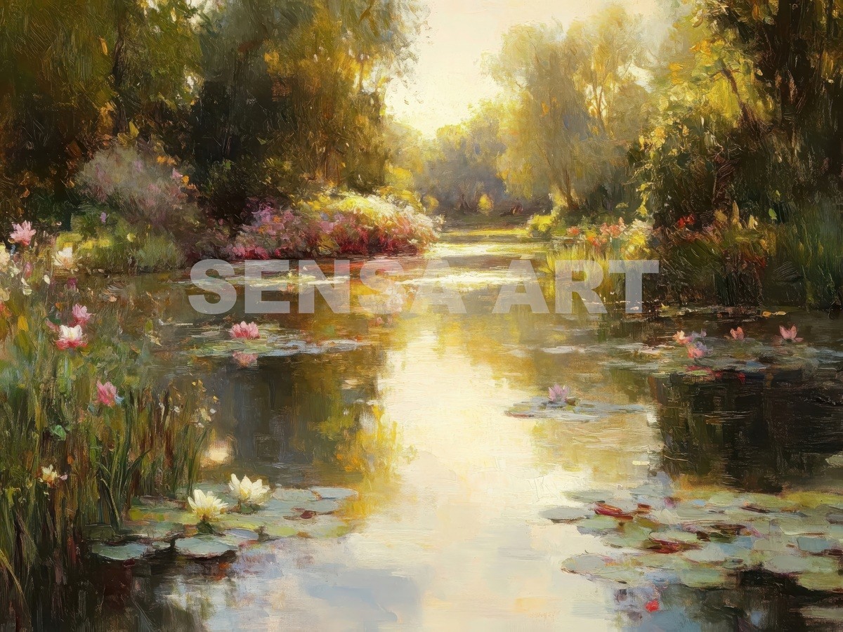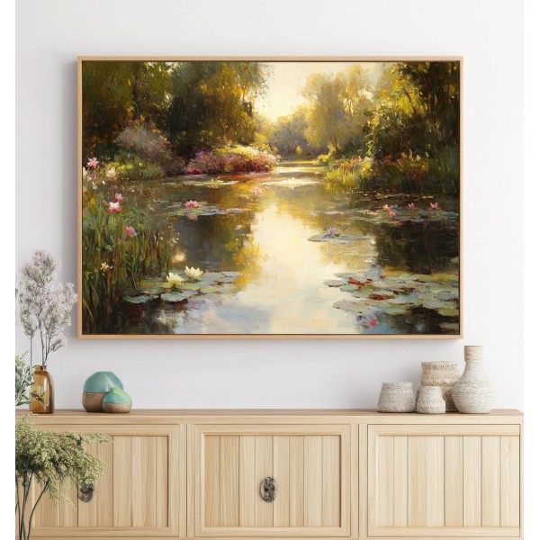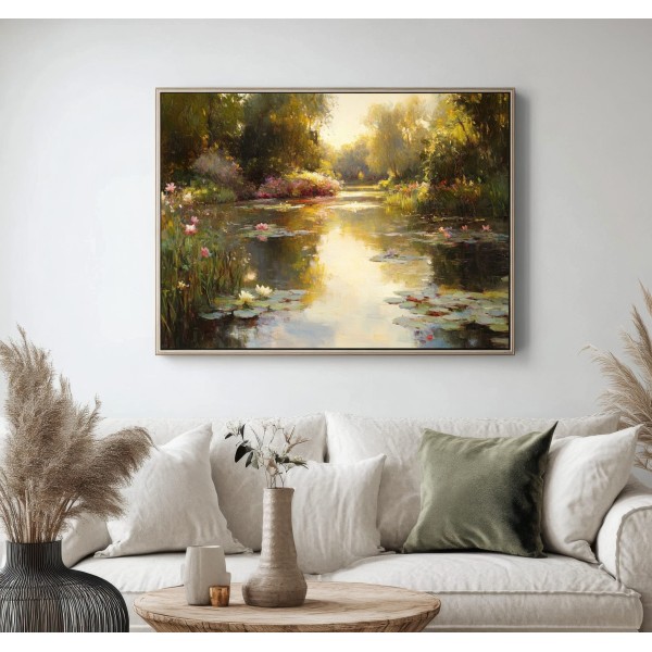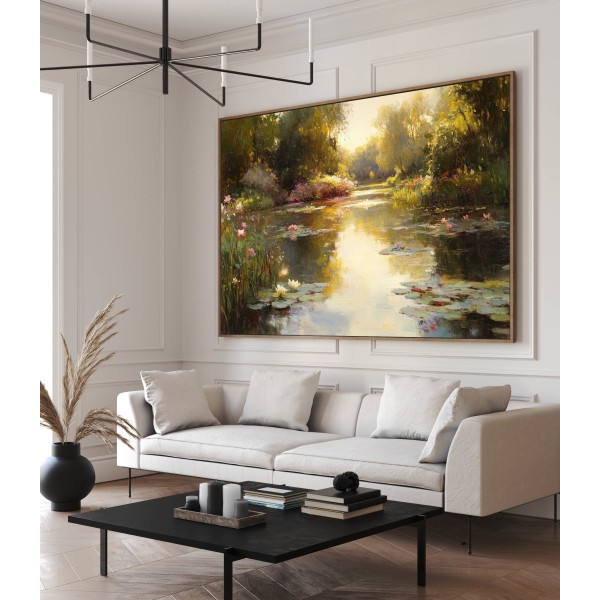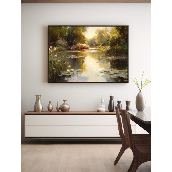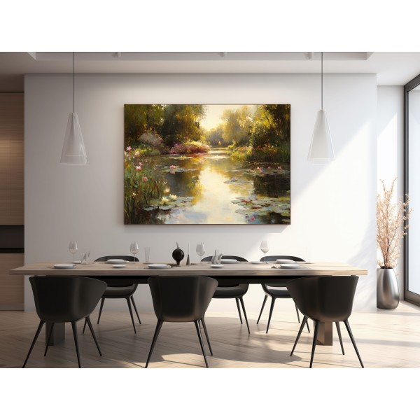 Inspirado en la pintura al óleo impresionista, el cuadro destaca por sus pinceladas ricas y expresivas, así como por una paleta vibrante de verdes, amarillos, rosas y reflejos dorados. Los nenúfares flotando sobre el agua añaden un toque delicado y elegante, reforzando la sensación de calma y armonía.