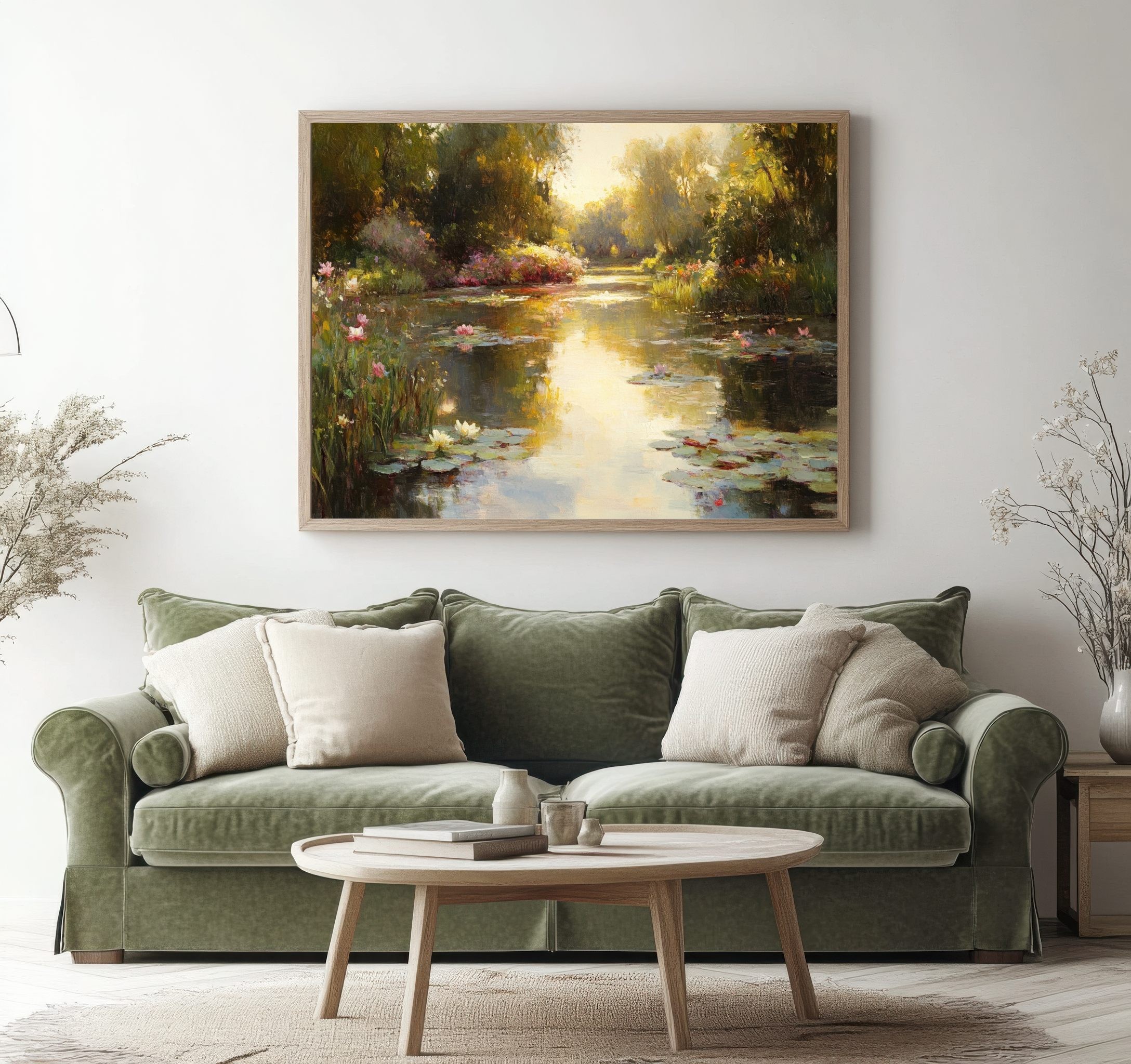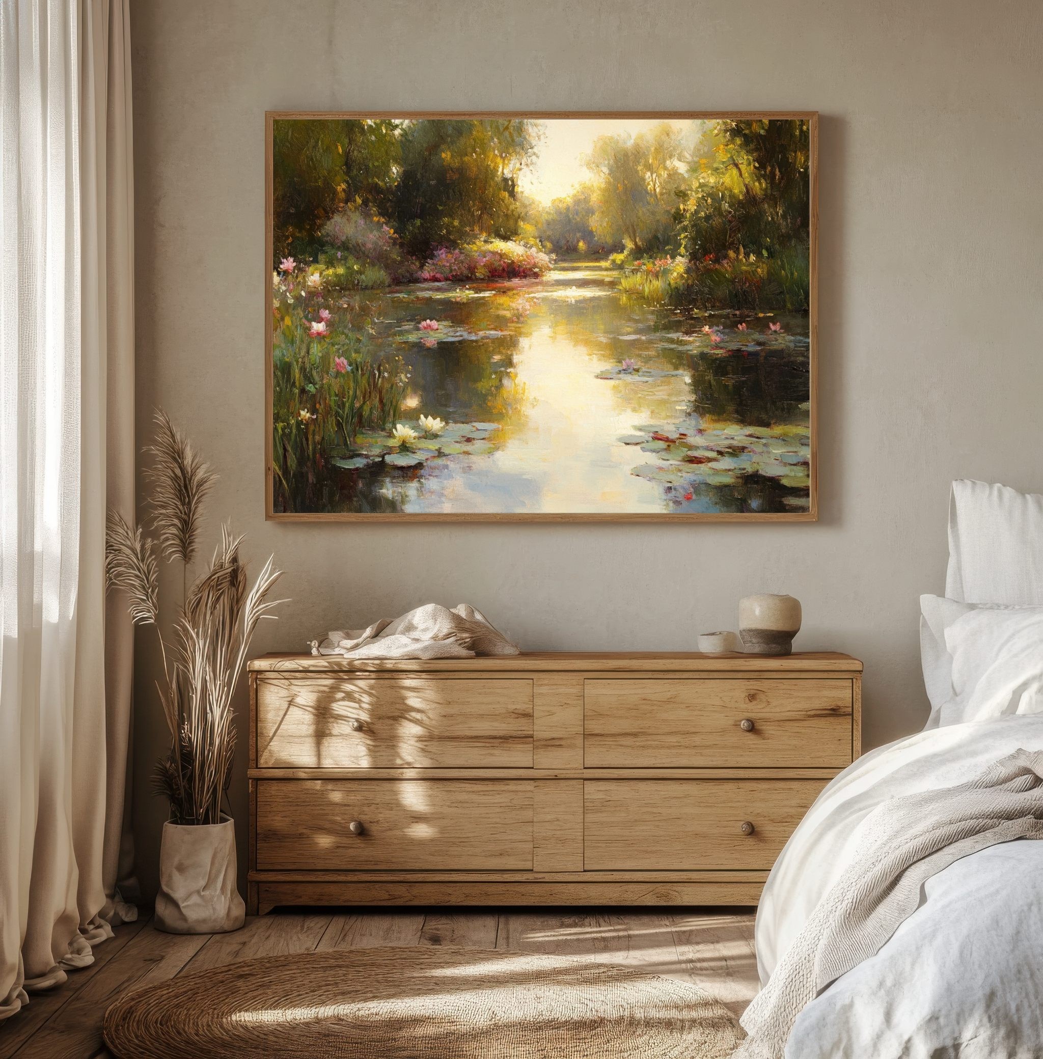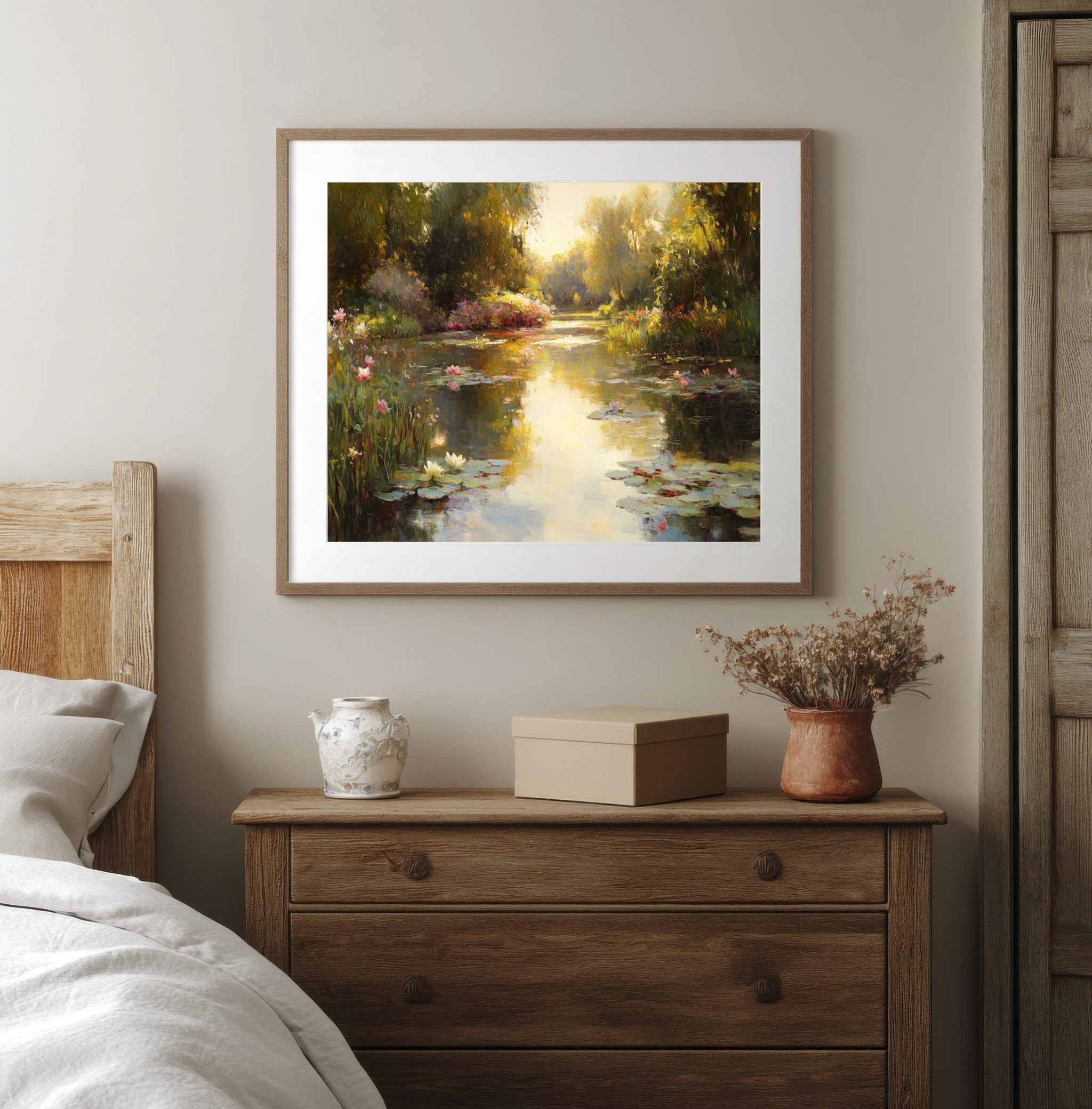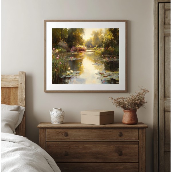Inspirado en la pintura al óleo impresionista, el cuadro destaca por sus pinceladas ricas y expresivas, así como por una paleta vibrante de verdes, amarillos, rosas y reflejos dorados. Los nenúfares flotando sobre el agua añaden un toque delicado y elegante, reforzando la sensación de calma y armonía.