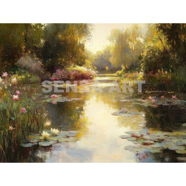 Inspirado en la pintura al óleo paisajística, el cuadro destaca por sus detalles realistas y su rica textura. La paleta combina azules profundos, verdes naturales y tonos cálidos de la madera, logrando una composición armoniosa y llena de luz. Los reflejos del agua intensifican la sensación de profundidad y serenidad.