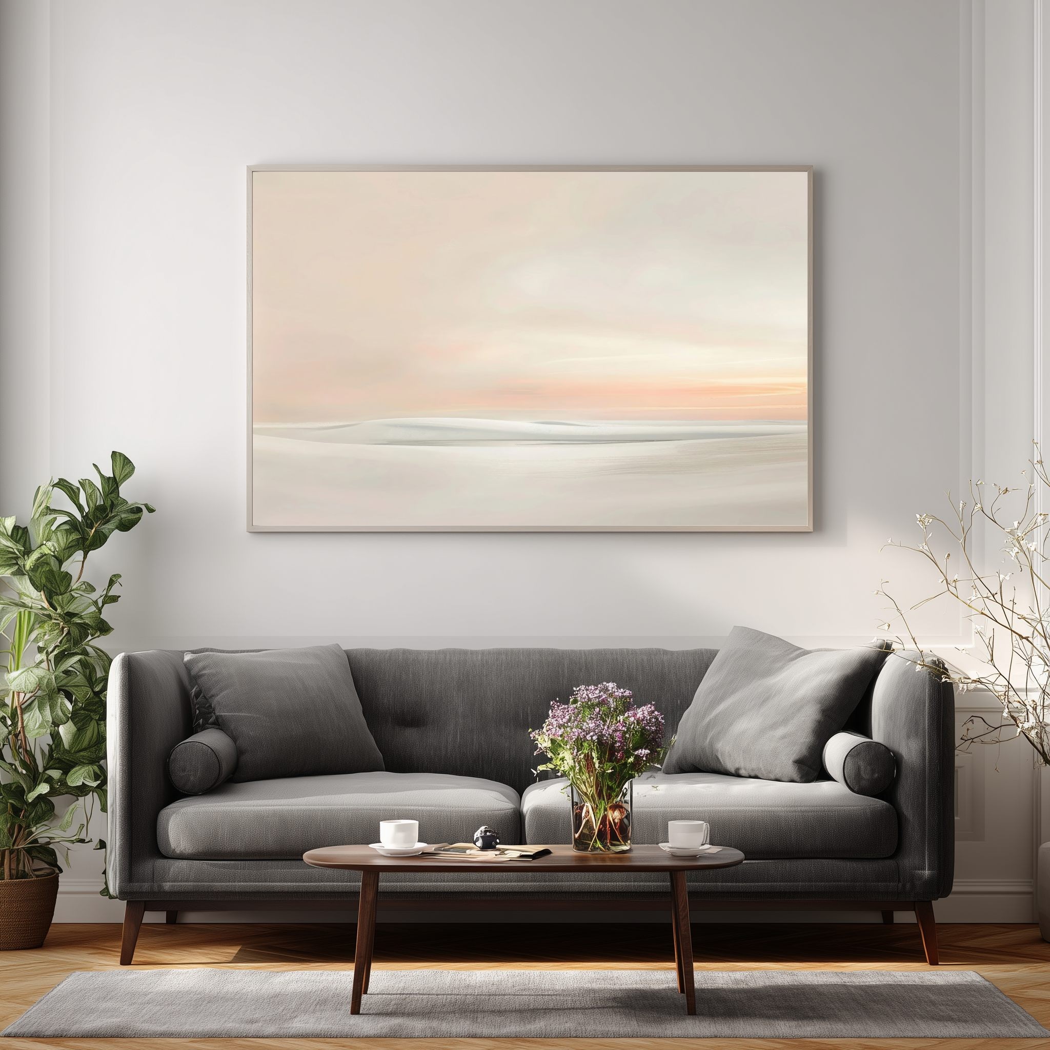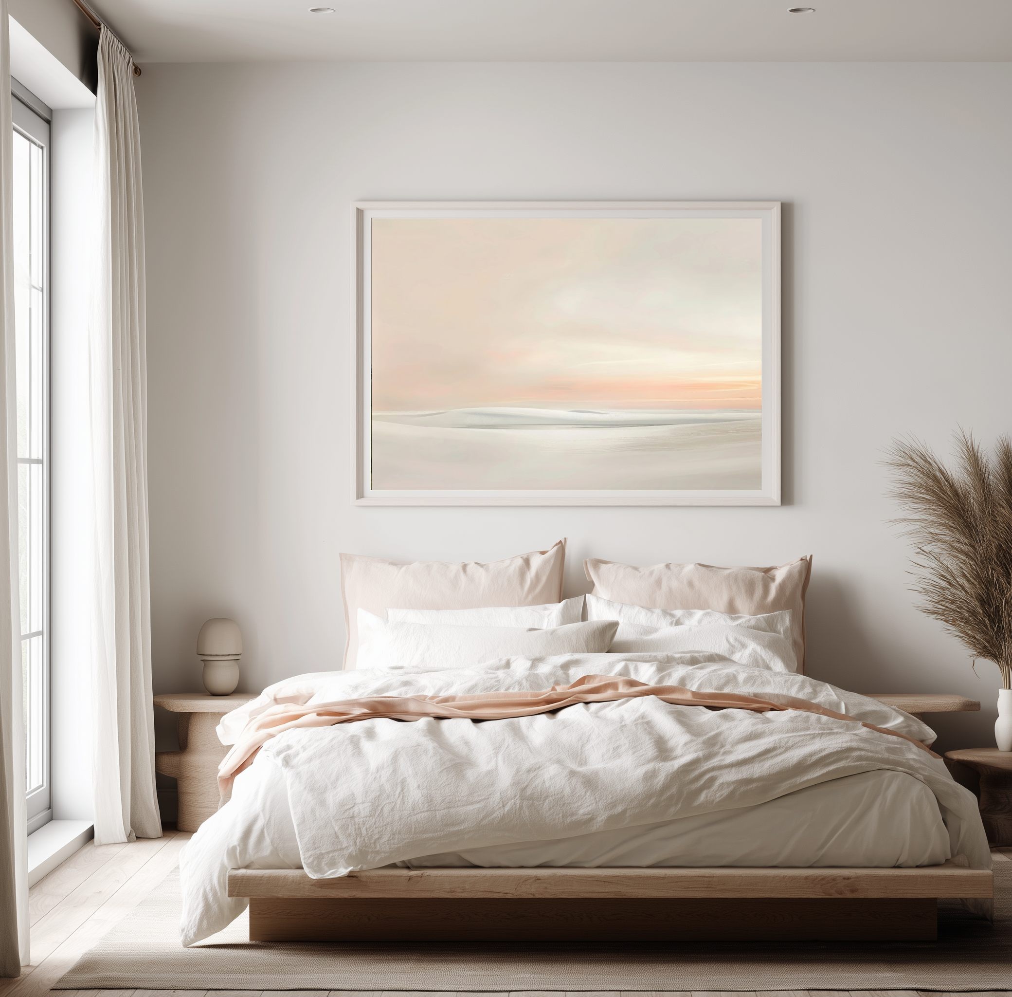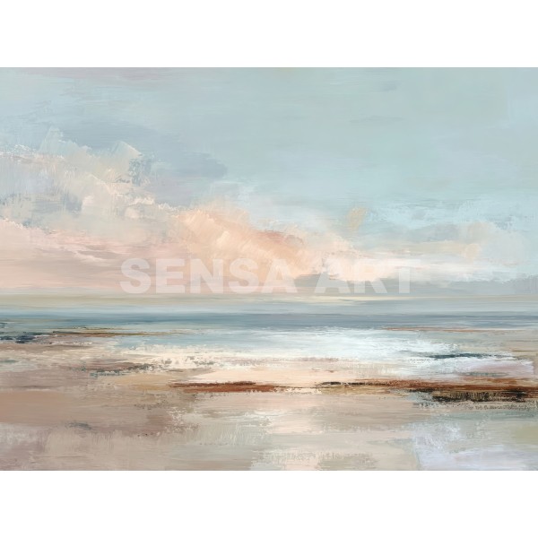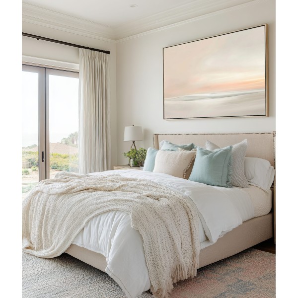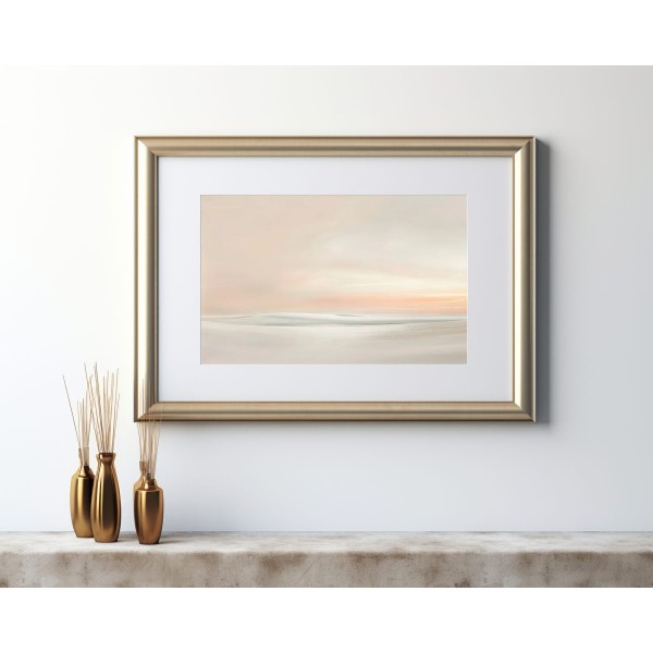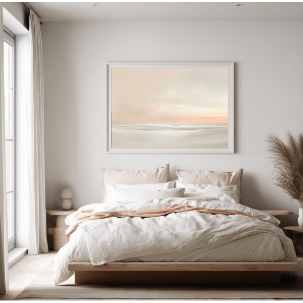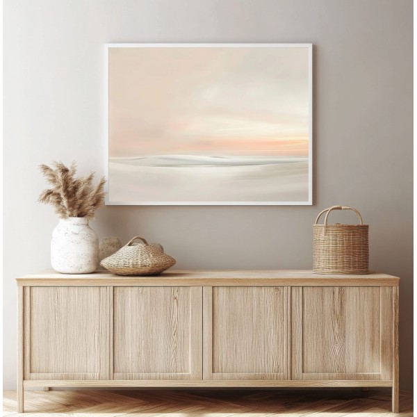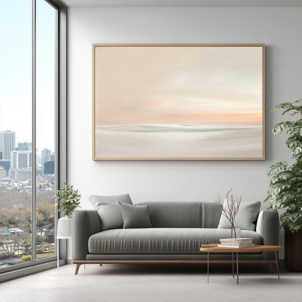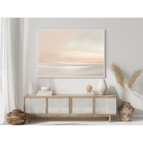 Este delicado cuadro abstracto minimalista representa un paisaje etéreo donde las formas suaves y difuminadas evocan dunas, agua o un horizonte lejano. La composición transmite una sensación de calma absoluta, ideal para crear espacios serenos y equilibrados.