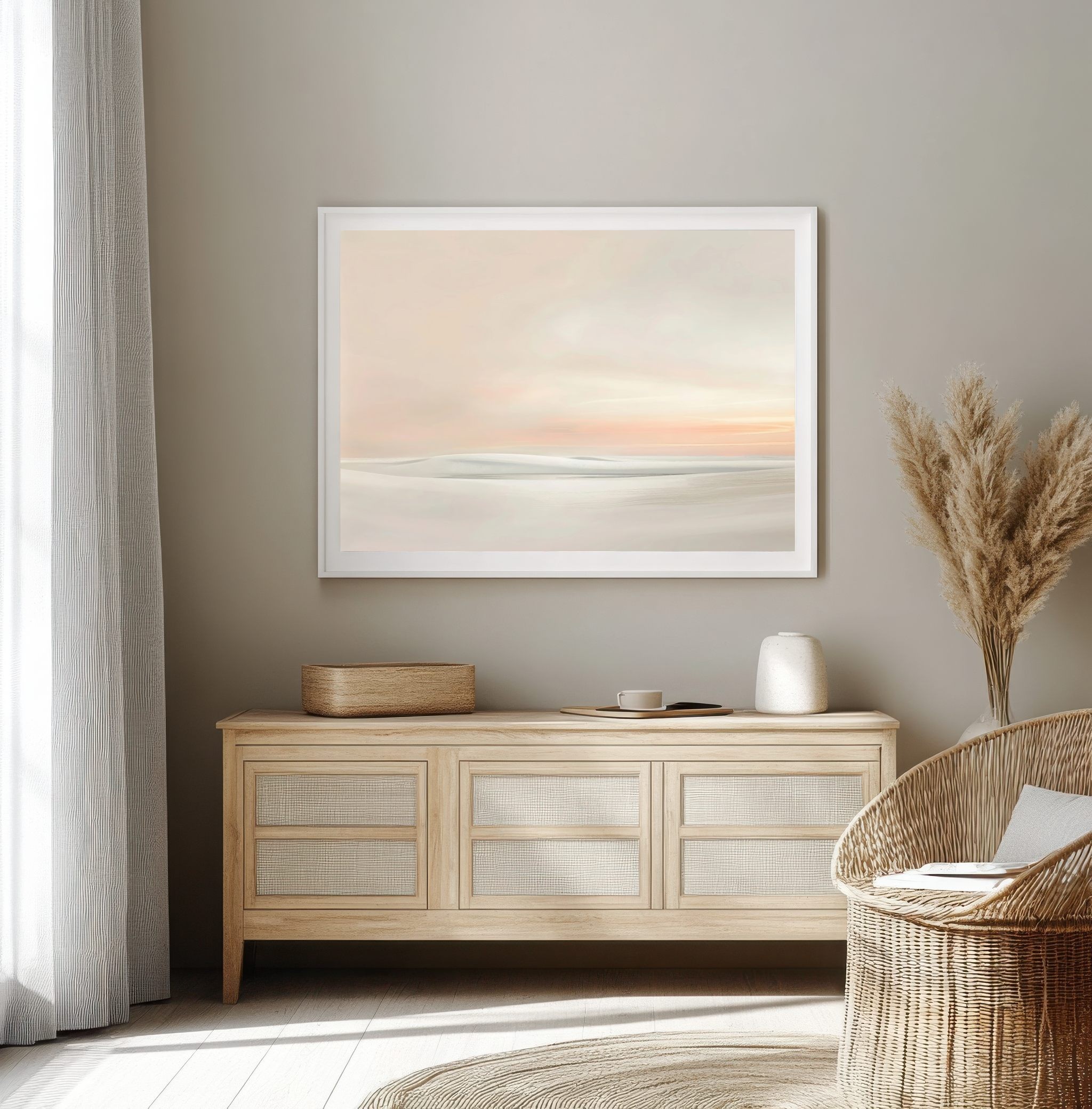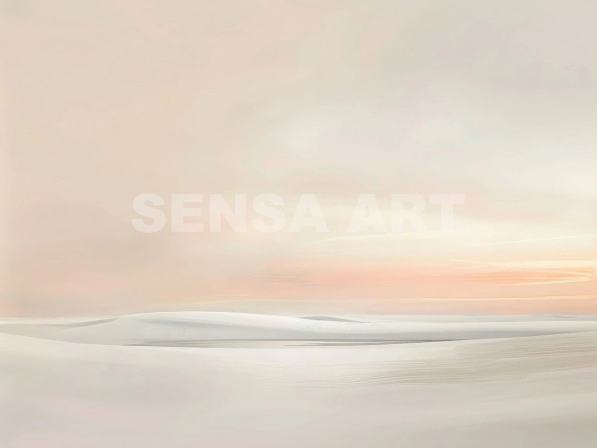La obra destaca por su estética ultra minimalista, con transiciones sutiles y una paleta armónica de tonos beige, crema, blanco roto y suaves matices rosados. La luz cálida en el horizonte aporta profundidad sin romper la delicadeza del conjunto.