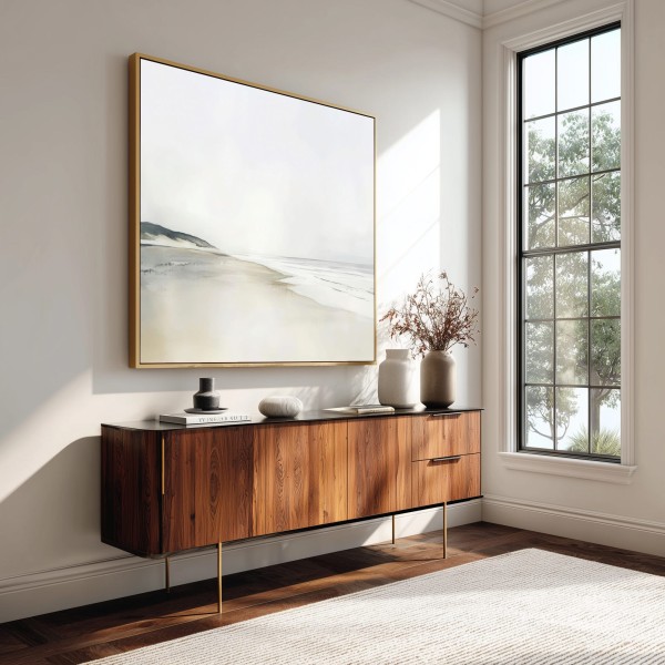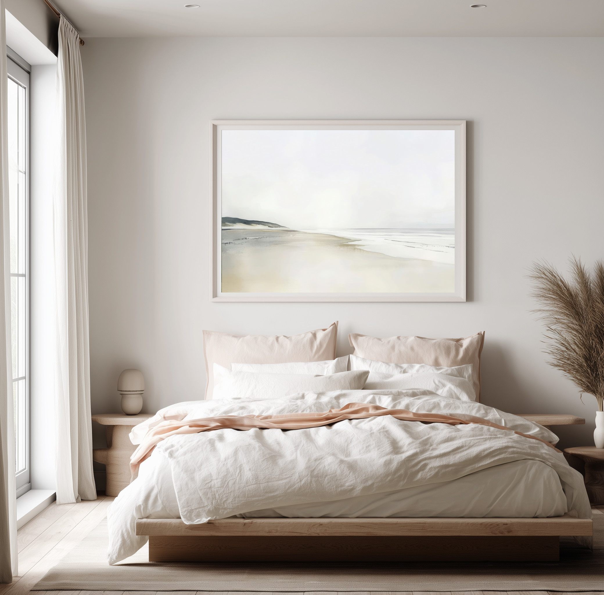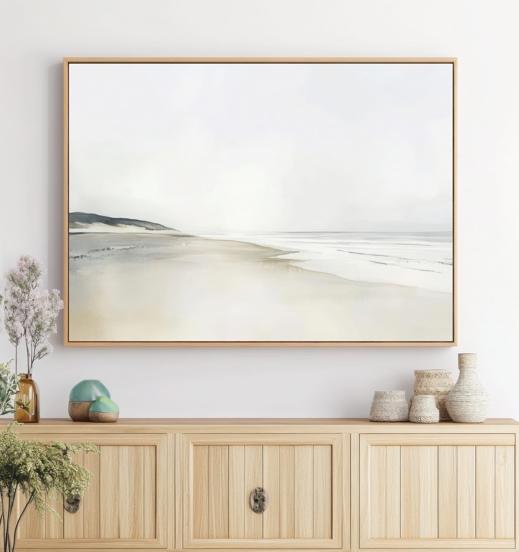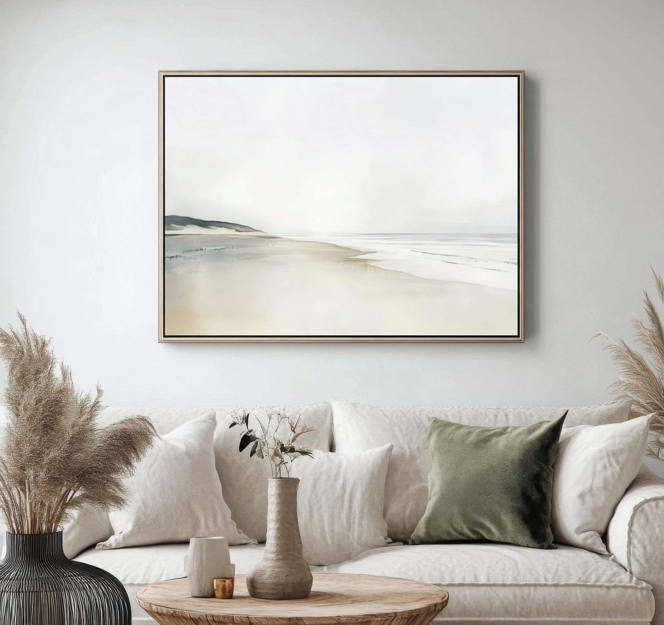 Este cuadro moderno de paisaje costero es perfecto para espacios que buscan serenidad y sofisticación, ideal para salones, dormitorios o interiores de estilo escandinavo, Japandi o mediterráneo.
