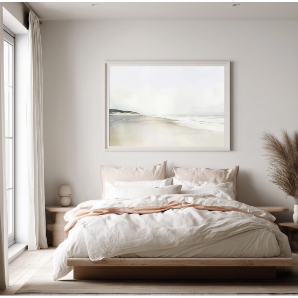 La obra destaca por su estilo acuarela minimalista, con pinceladas ligeras y transiciones sutiles que aportan una estética limpia y elegante. La paleta de tonos beige, blanco roto, gris suave y verdes apagados crea un ambiente natural, equilibrado y muy relajante.