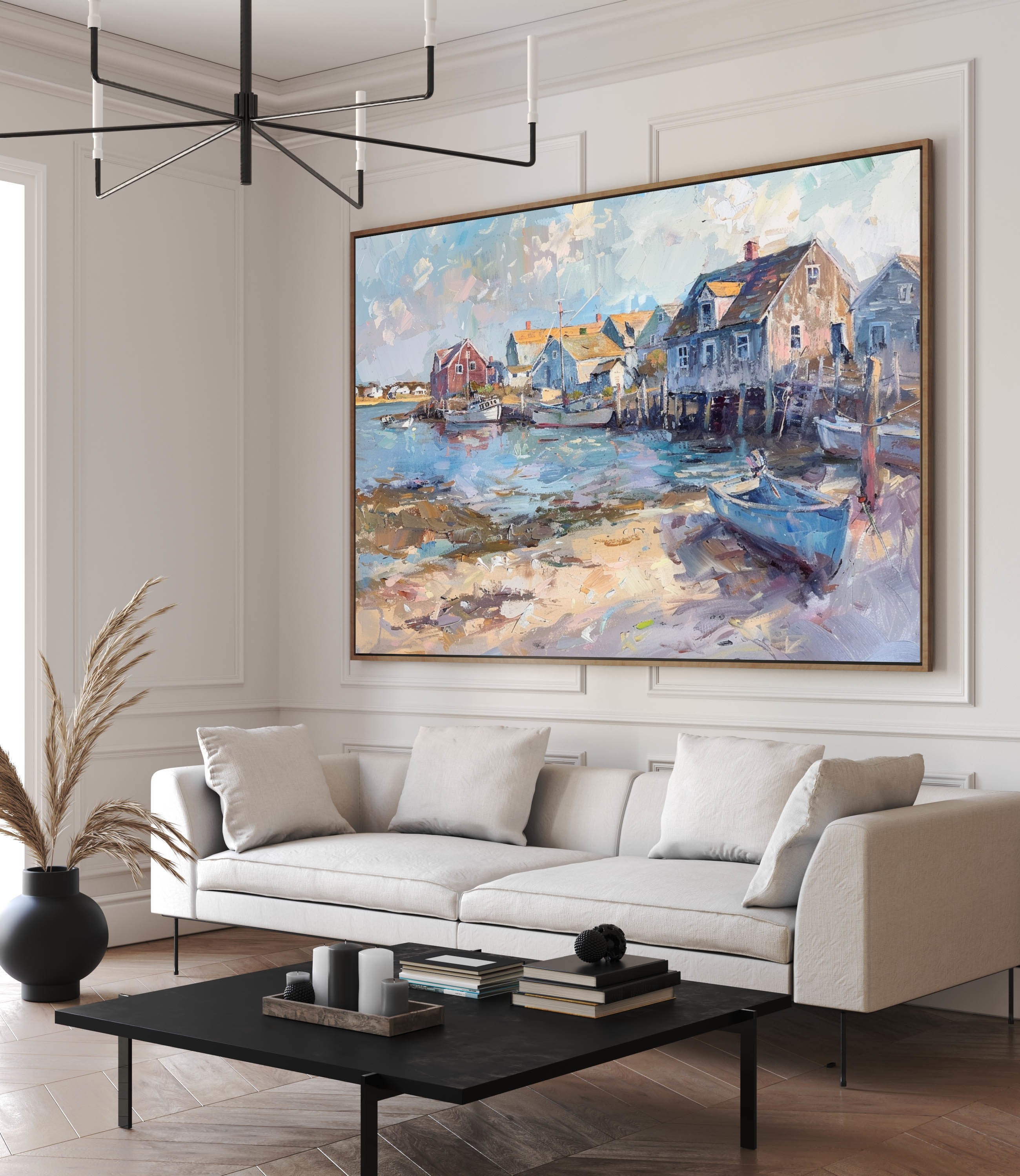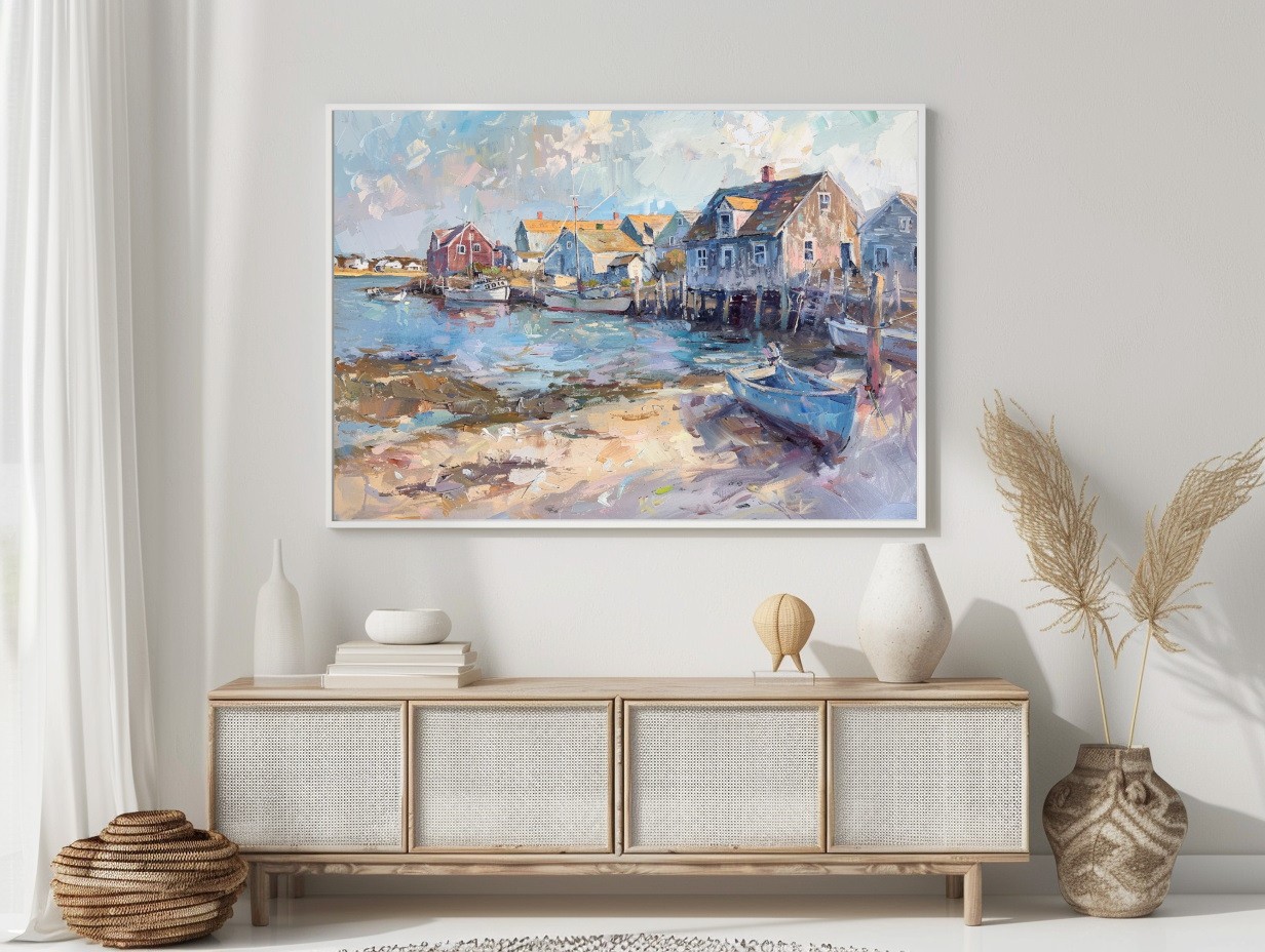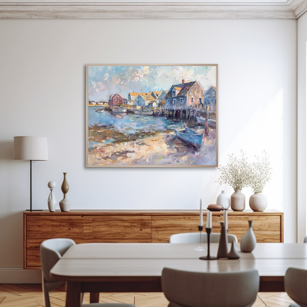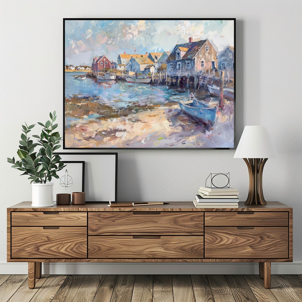 Este cuadro decorativo captura la esencia de un tranquilo puerto pesquero, con casas rústicas de madera y botes anclados en la orilla. Las pinceladas sueltas y los colores suaves transmiten una atmósfera nostálgica y relajante, evocando la vida costera. Ideal para quienes desean añadir un toque de serenidad y encanto marítimo a su hogar.