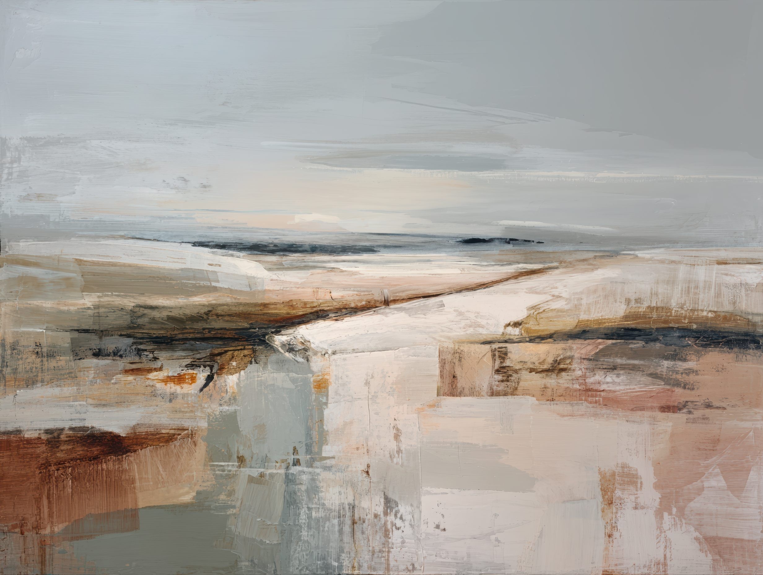 Este cuadro abstracto de paisaje combina tonos tierra, beige, ocres y grises con pinceladas expresivas que transmiten movimiento y profundidad. La composición sugiere un horizonte abierto y sereno, evocando la fuerza de la naturaleza en un estilo contemporáneo. Ideal para decoración moderna en salones, dormitorios u oficinas, esta obra aporta equilibrio y sofisticación al ambiente. Su paleta neutra y cálida lo convierte en una pieza versátil, perfecta para quienes buscan arte abstracto elegante que combine con diferentes estilos decorativos y aporte personalidad.