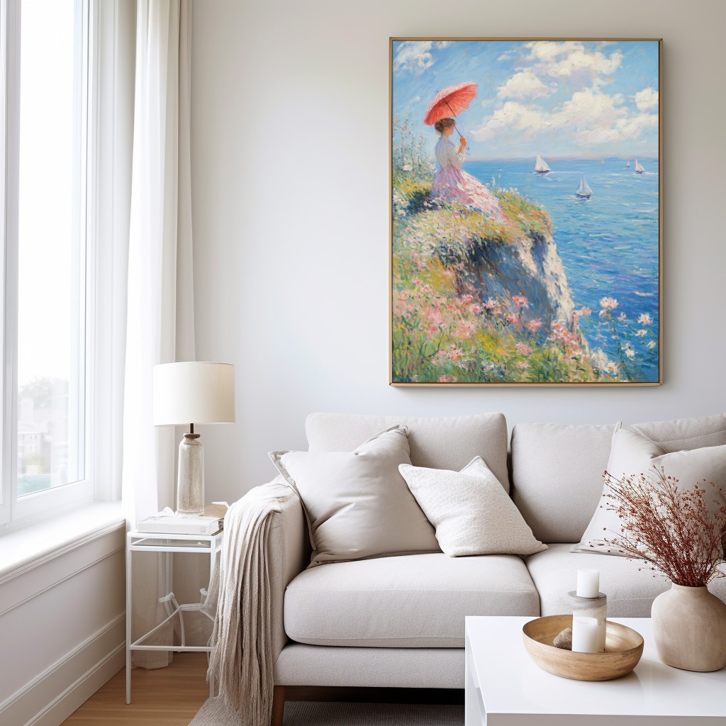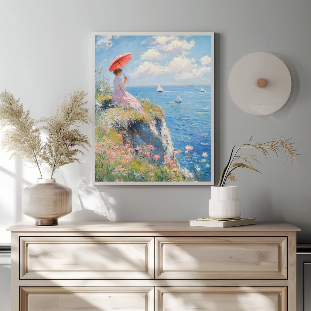 Este cuadro muestra a una mujer con sombrilla rosa en un acantilado florido, contemplando el mar. Las flores silvestres rodean la escena, y el cielo azul se refleja en el océano, donde navegan veleros blancos. Pintado con un estilo impresionista, transmite una sensación de calma y romanticismo, ideal para aquellos que buscan una imagen serena y poética del verano.