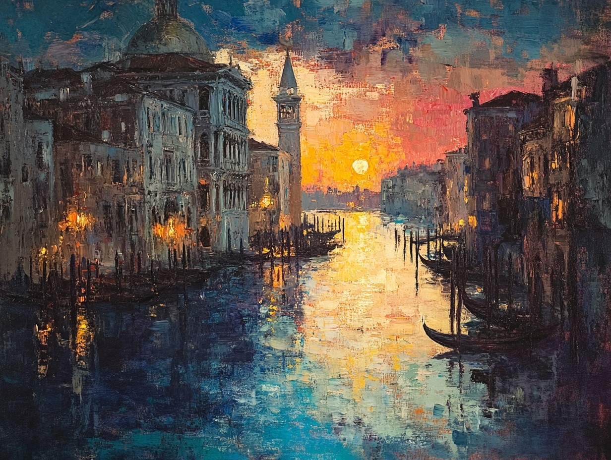 Este cuadro decorativo impresionista captura la magia de un atardecer en Venecia, con reflejos dorados y azul profundo sobre el agua. Las luces cálidas de los edificios y góndolas crean una atmósfera romántica y nostálgica, ideal para salones, oficinas o espacios elegantes. Esta obra de arte transforma cualquier ambiente con su belleza y sofisticación.