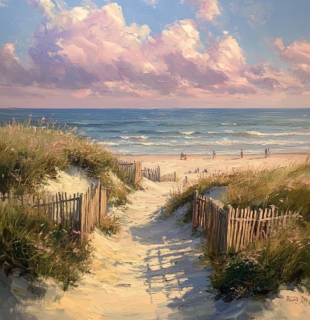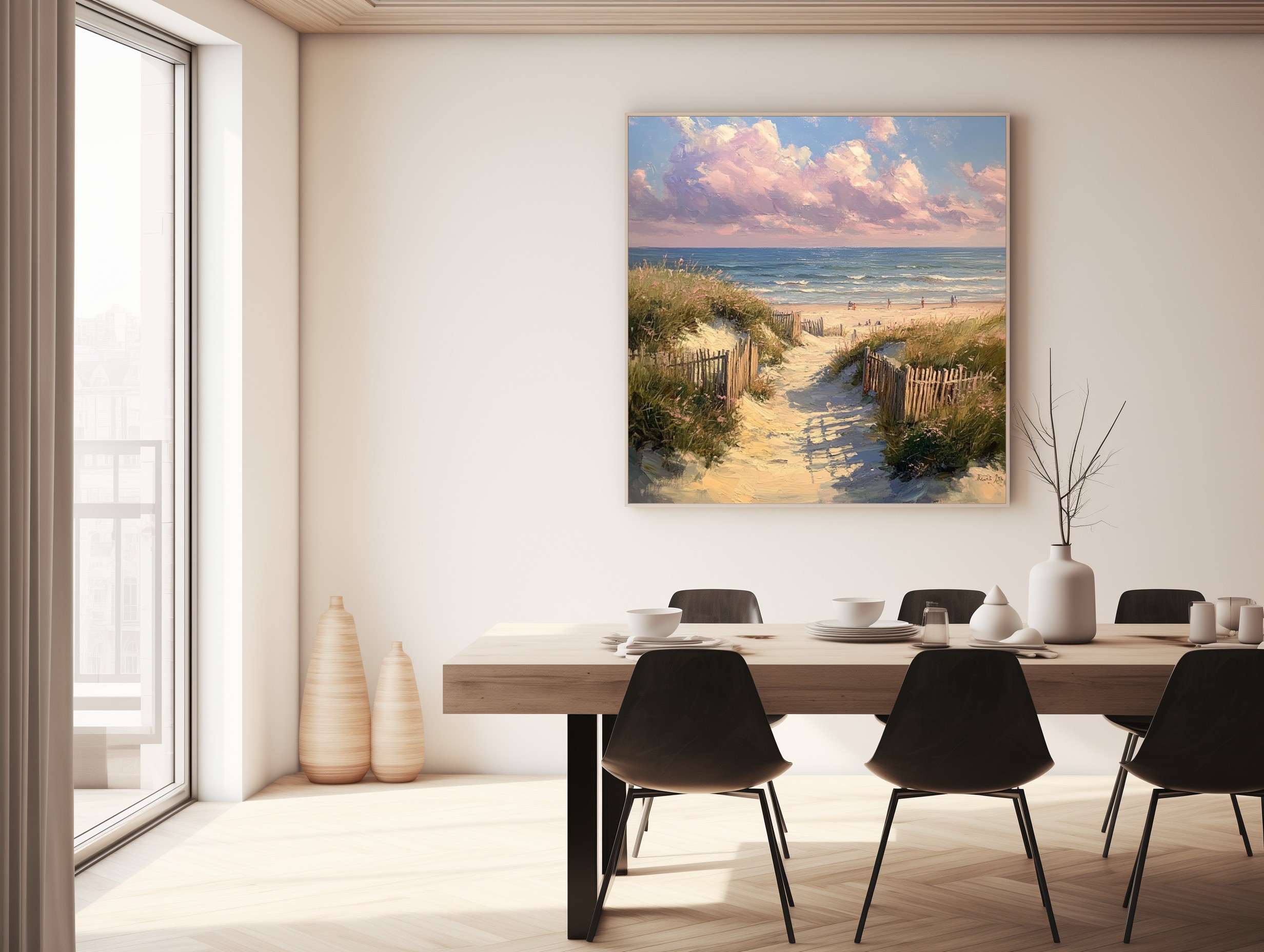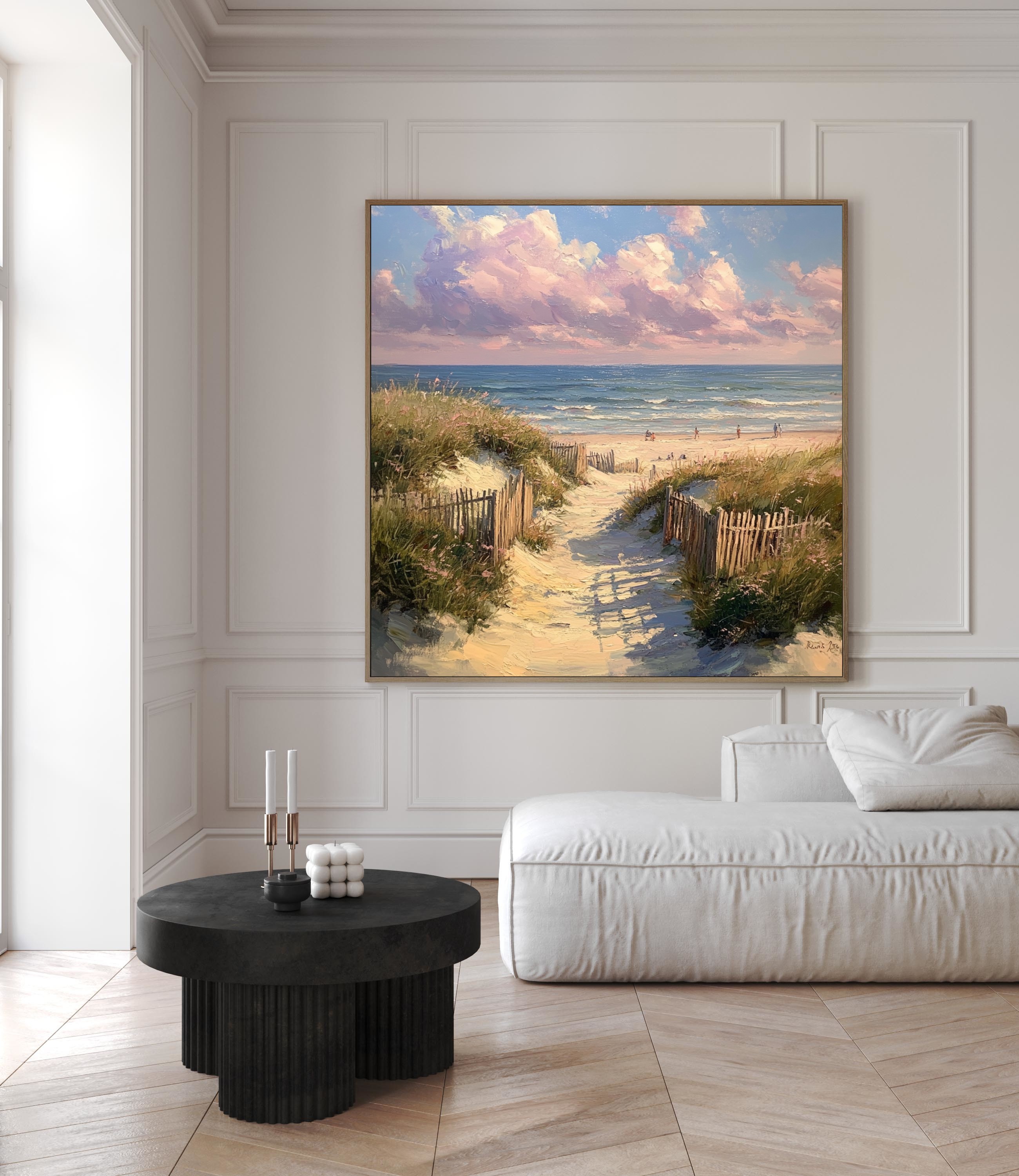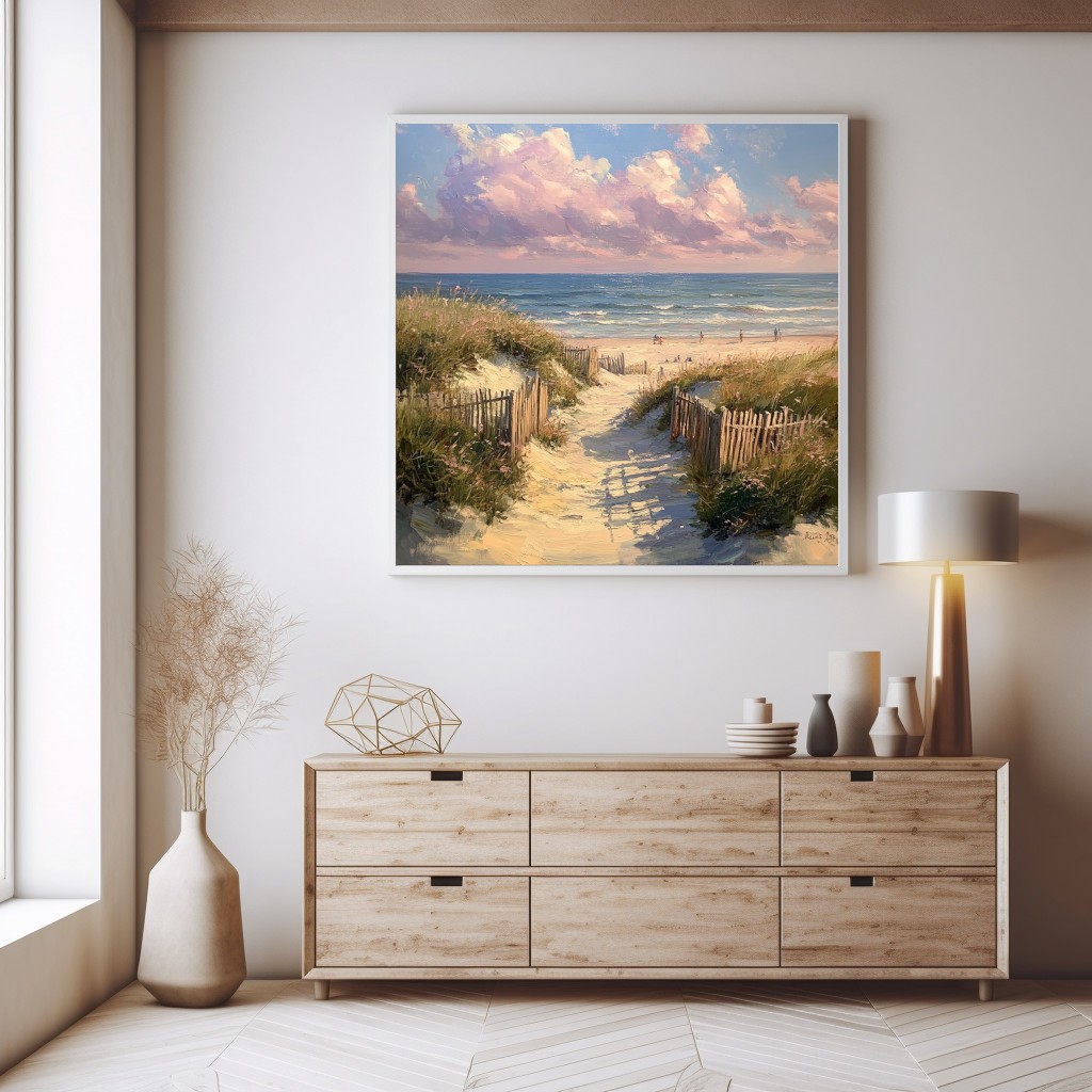 Este cuadro decorativo impresionista captura la belleza de una playa serena con un sendero de arena que conduce al mar. Sus colores suaves en tonos arena, azul y rosa reflejan la calidez de una tarde soleada con nubes esponjosas y olas tranquilas. Ideal para salones, dormitorios o espacios de relajación, esta obra aporta frescura y armonía a cualquier ambiente. Sus pinceladas expresivas y textura detallada transmiten realismo y profundidad. Perfecto para quienes buscan arte costero elegante.