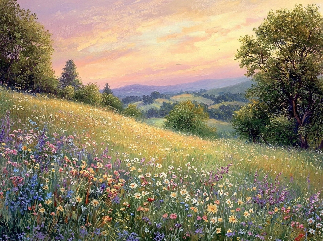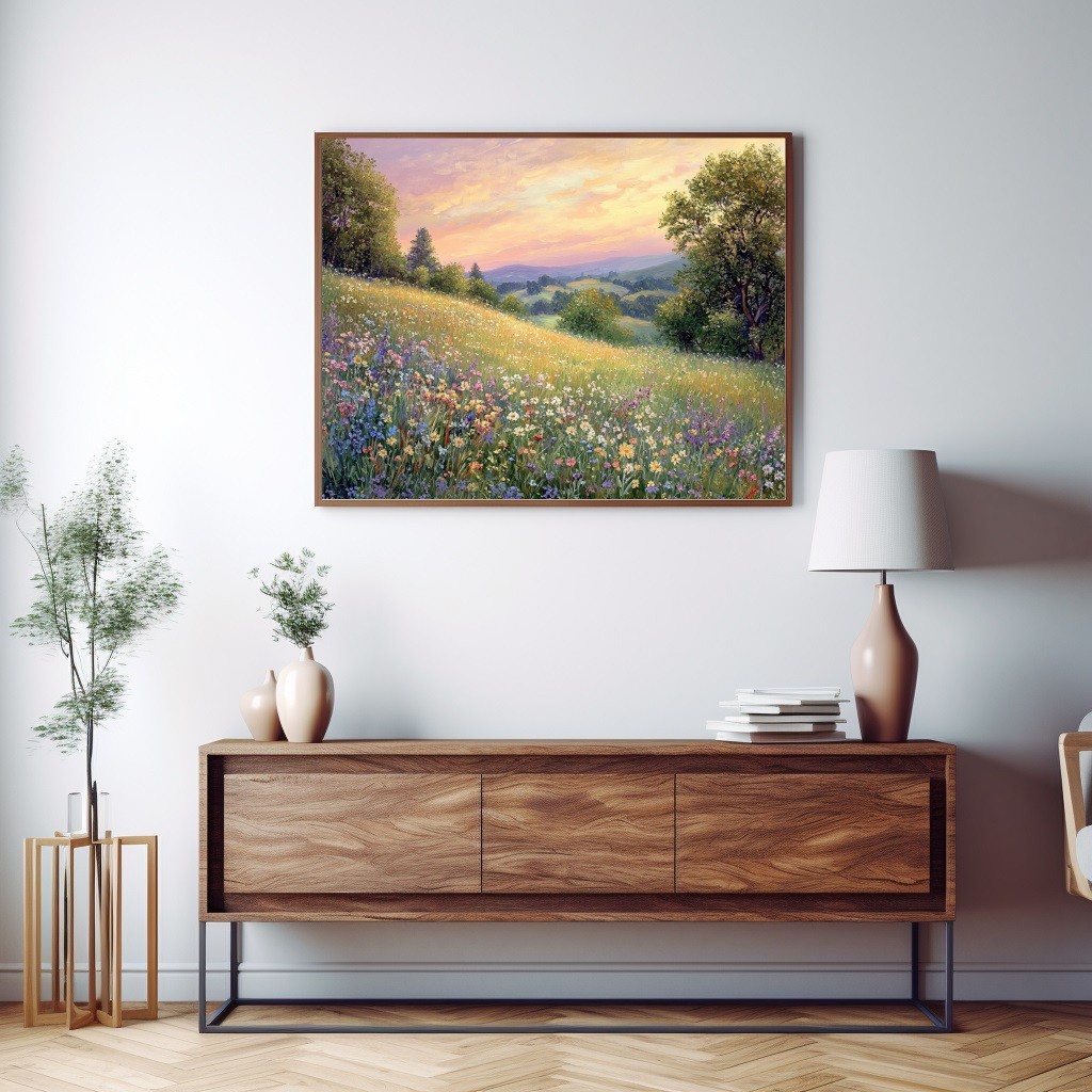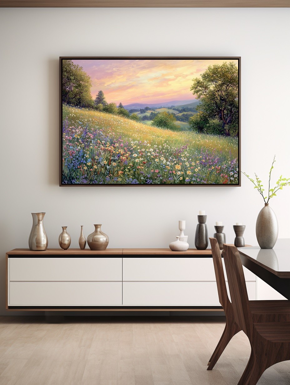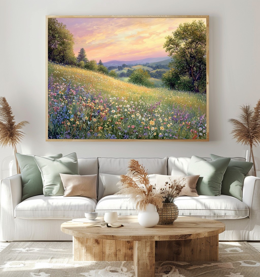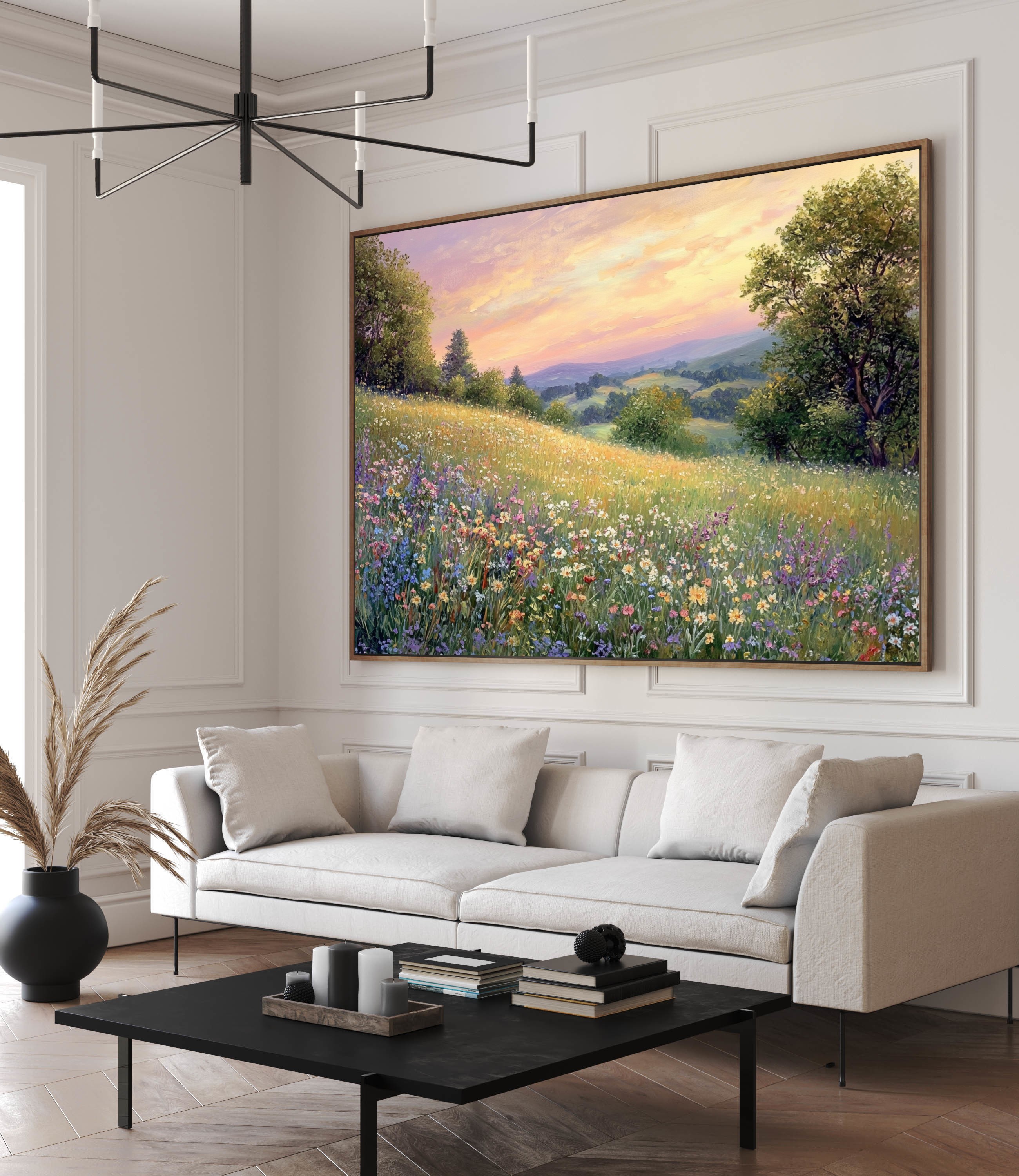 Este cuadro decorativo impresionista representa un campo de flores silvestres bajo un cielo de atardecer en tonos pastel, creando una atmósfera de serenidad y encanto natural. Sus vibrantes colores, con matices de amarillo, morado y verde, aportan frescura y luminosidad a cualquier espacio. Ideal para salones, dormitorios o áreas de descanso, esta obra transforma el ambiente con su armonía visual.