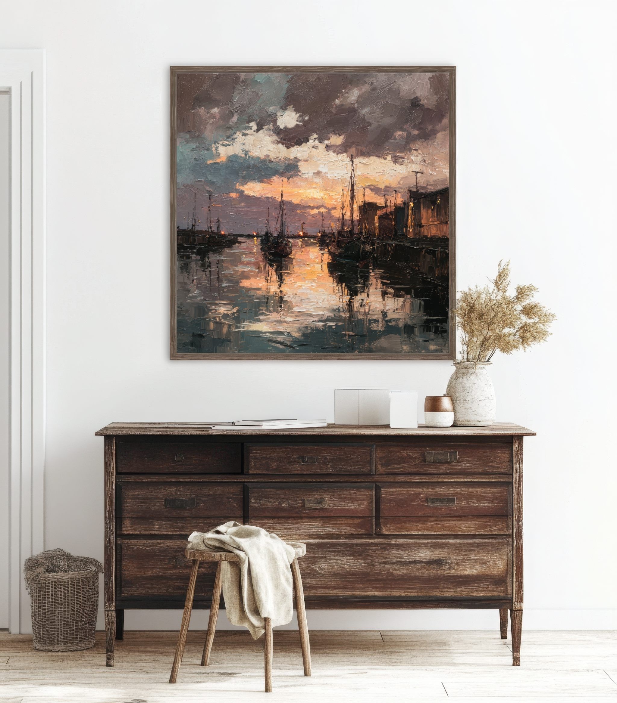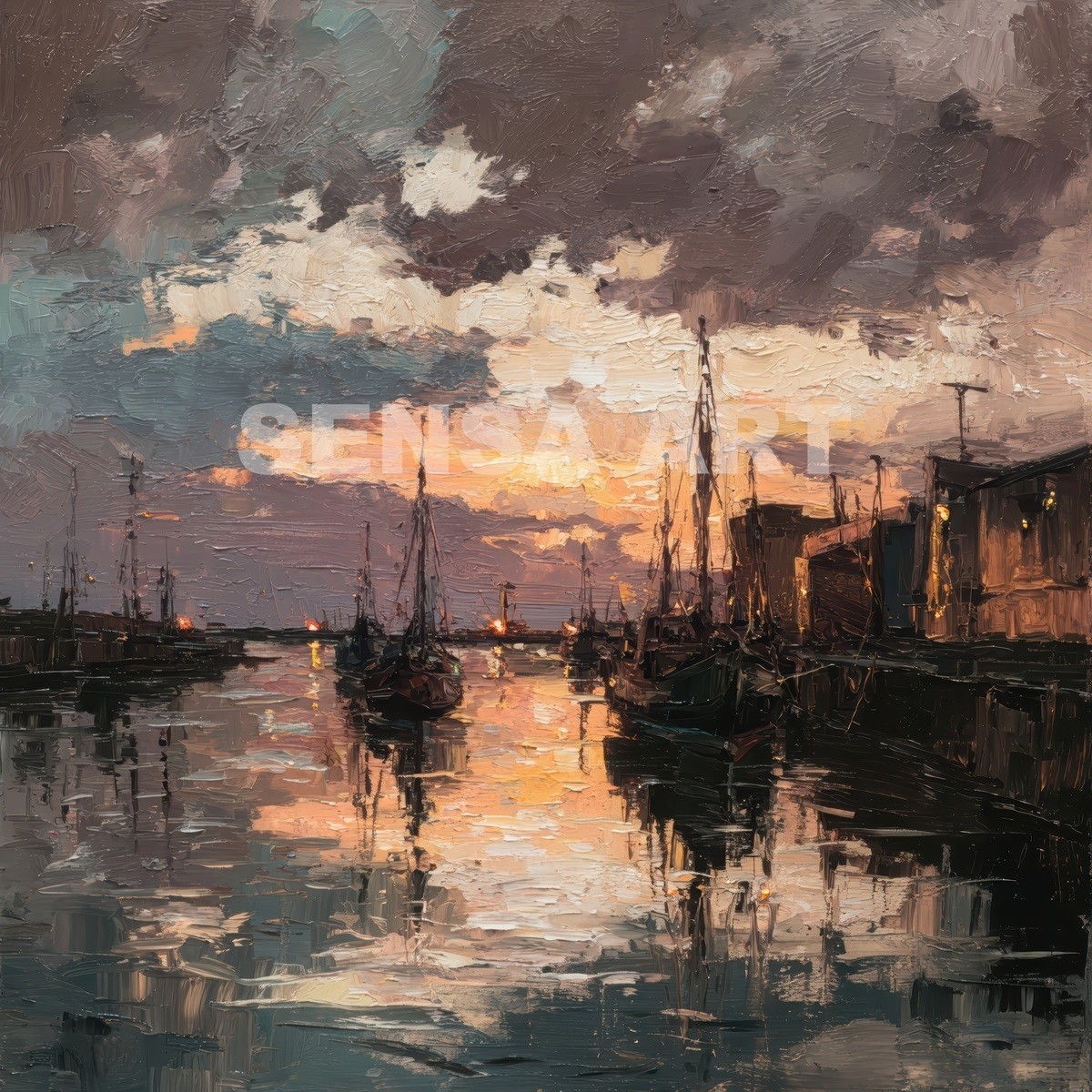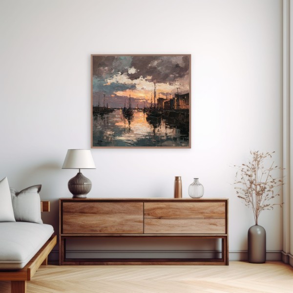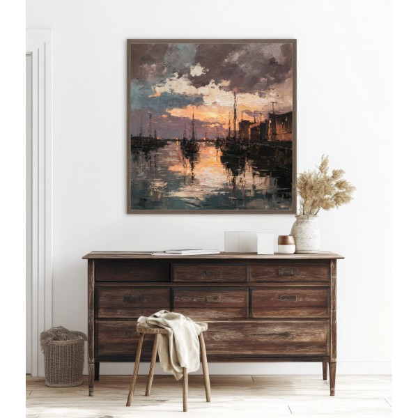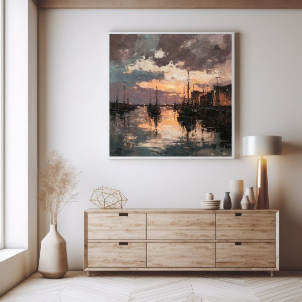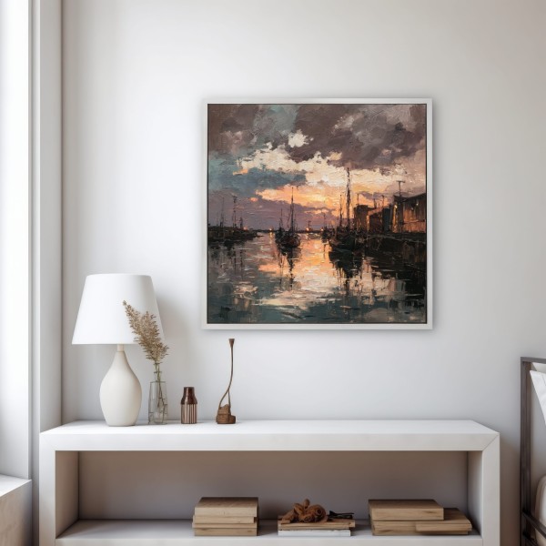 Este evocador cuadro de puerto al atardecer captura la atmósfera única de un muelle tranquilo iluminado por los últimos rayos del sol. Las embarcaciones descansan sobre el agua mientras el cielo, cargado de nubes dramáticas, se tiñe de tonos cálidos que se reflejan en la superficie creando un efecto visual intenso y envolvente.