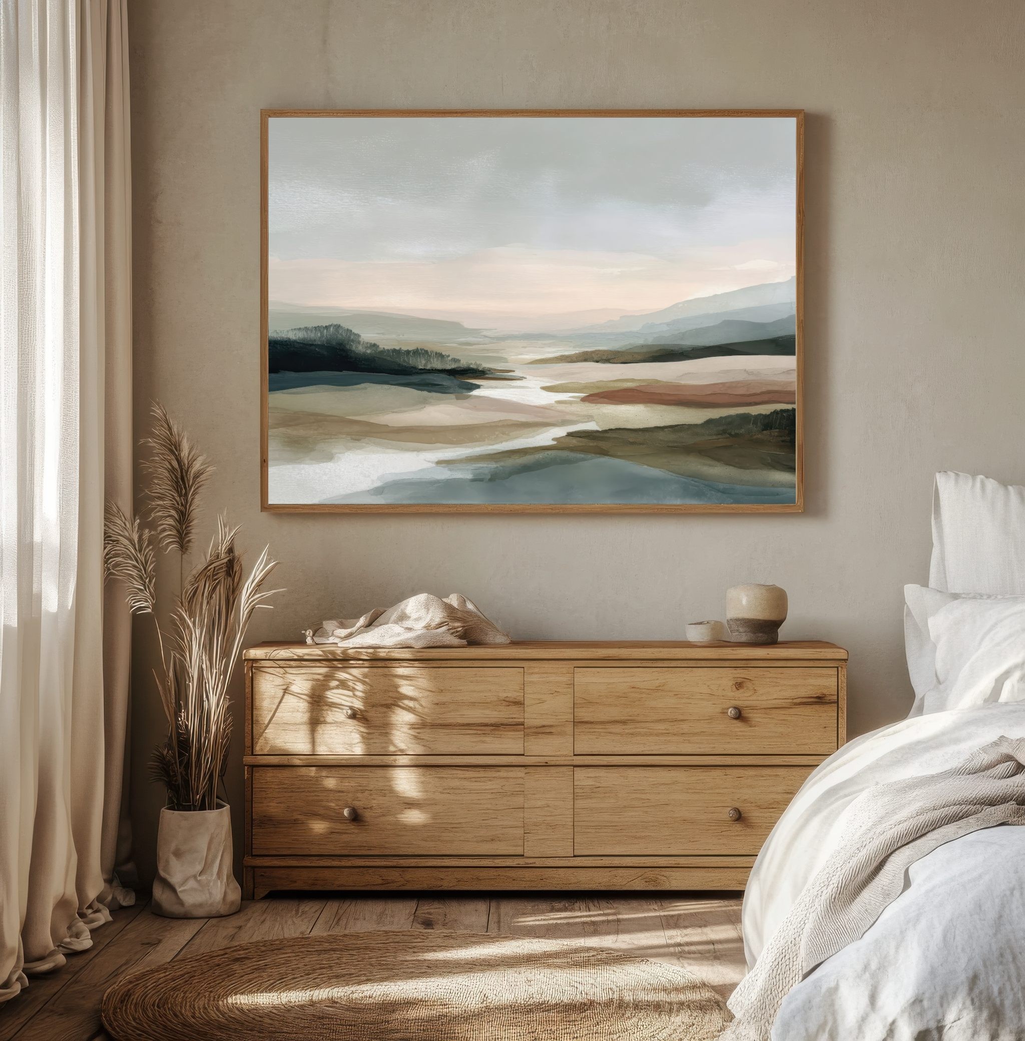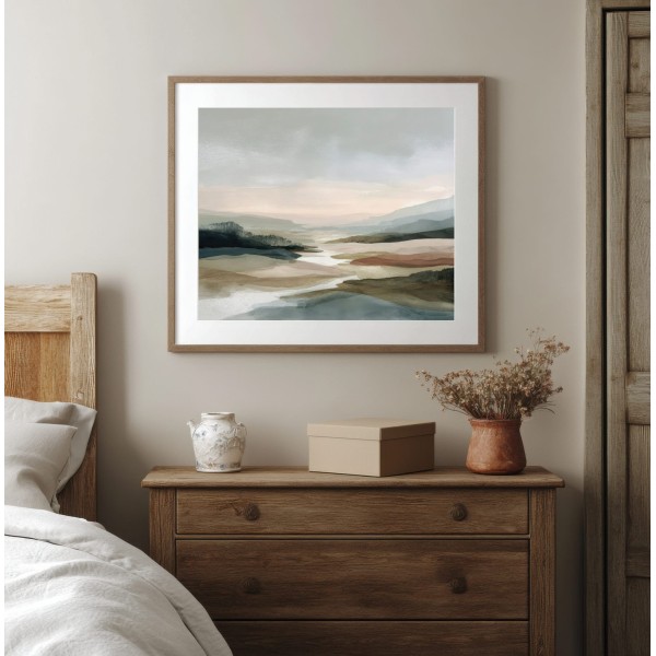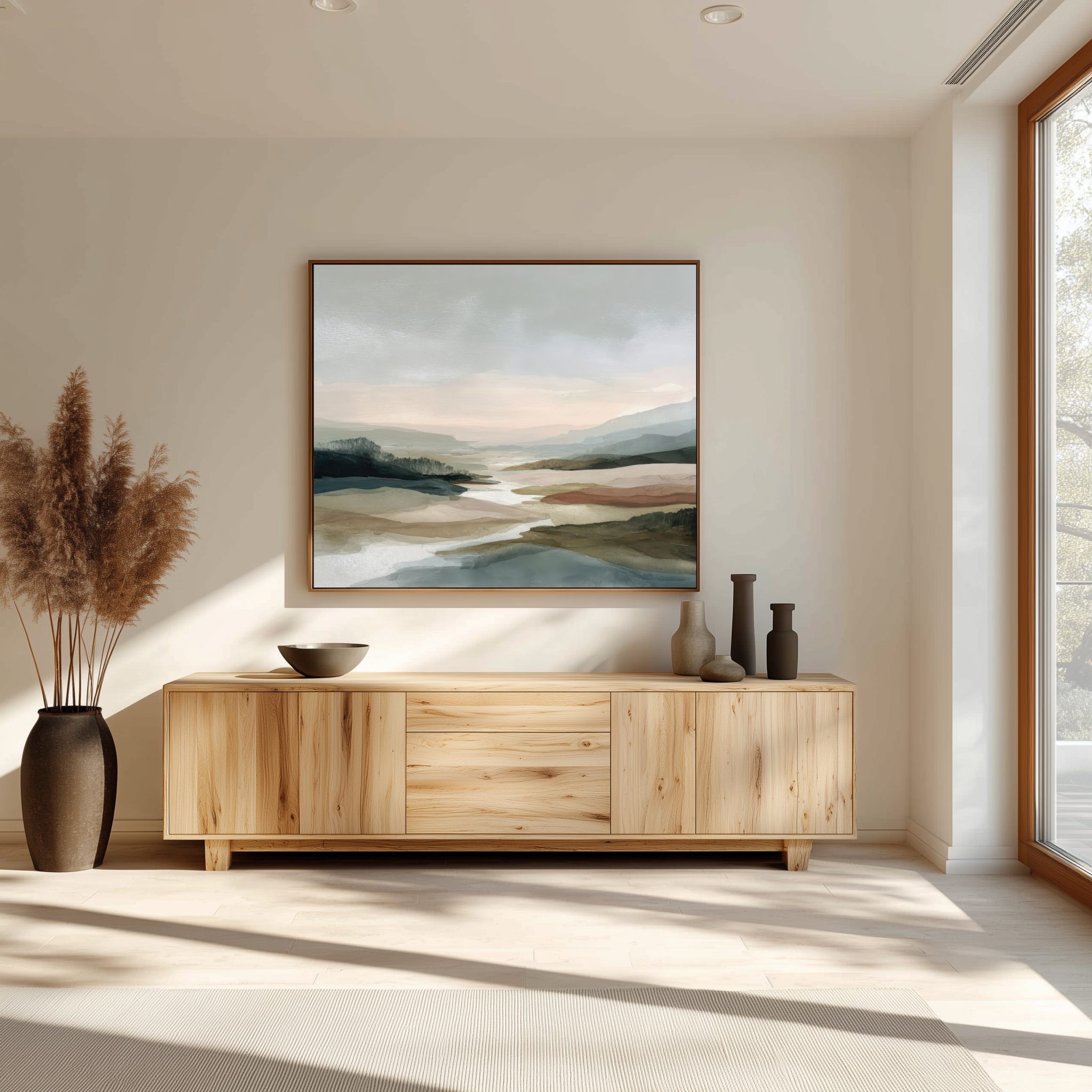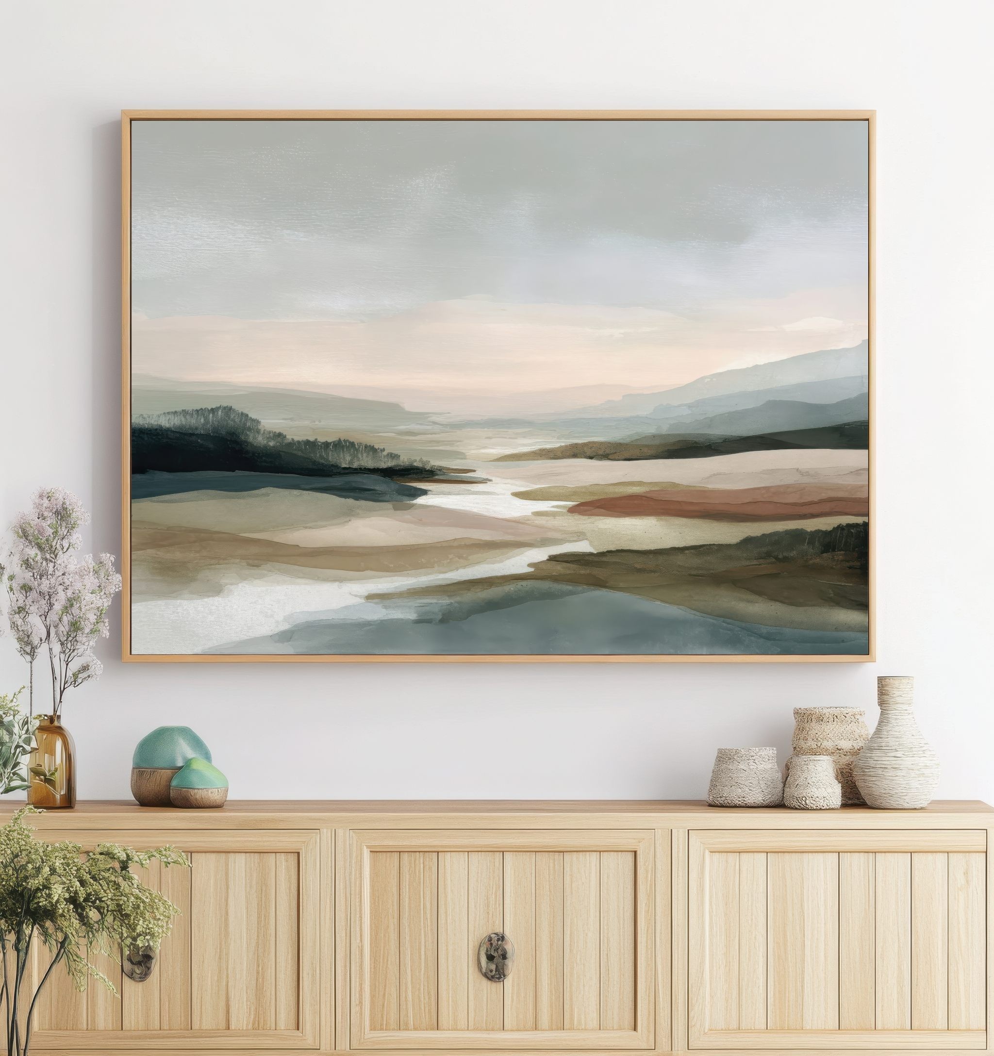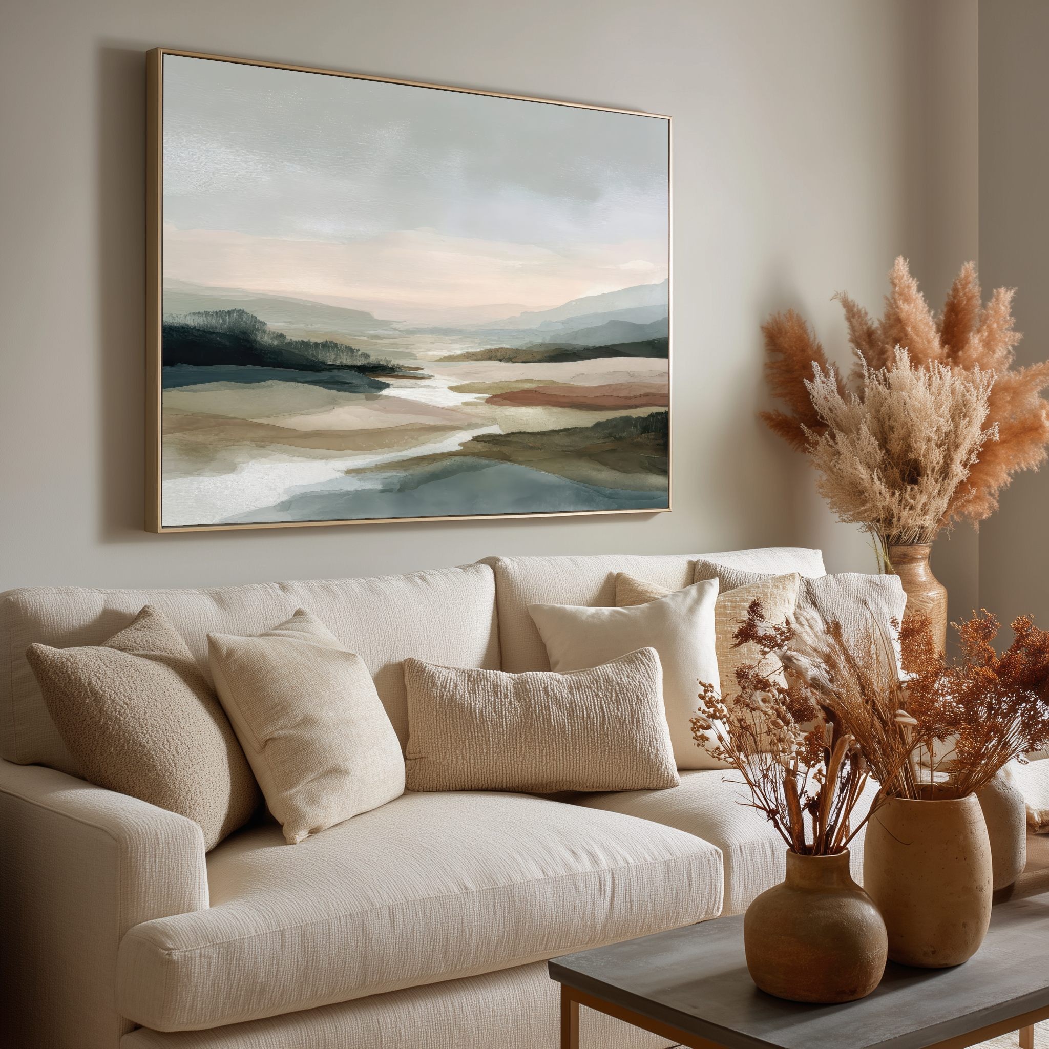 Este cuadro abstracto de paisaje con montañas en tonos tierra y grises suaves evoca la calma de un horizonte natural envuelto en neblina. Su paleta de colores neutros, con matices beige, arcilla y verde apagado, crea una sensación de profundidad y serenidad. Las transiciones suaves recuerdan la acuarela y aportan una atmósfera tranquila y elegante. Perfecto para interiores contemporáneos, Japandi o wabi-sabi, este arte mural transmite equilibrio y conexión con la naturaleza a través de una estética minimalista y poética.