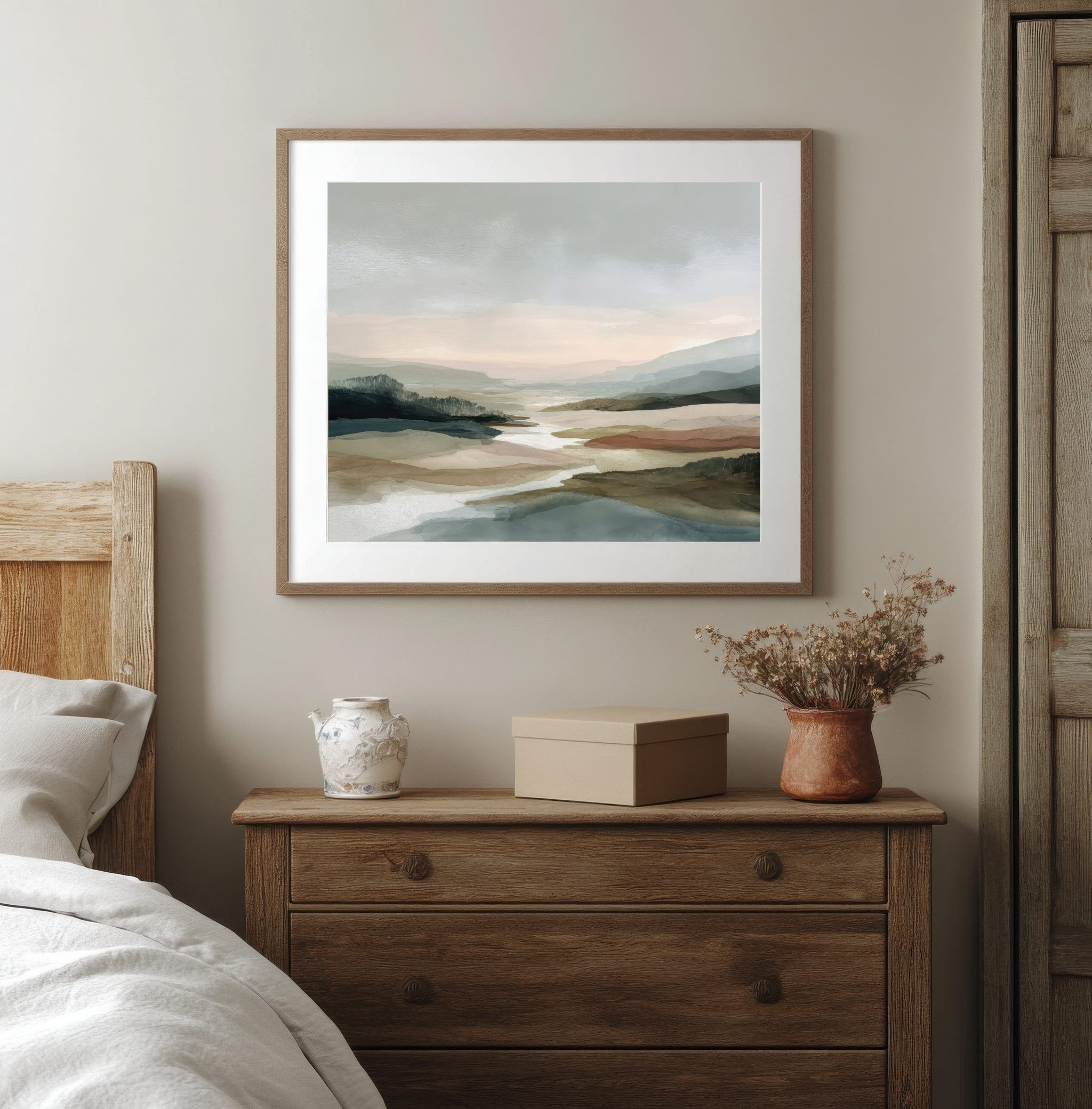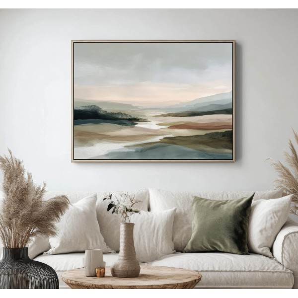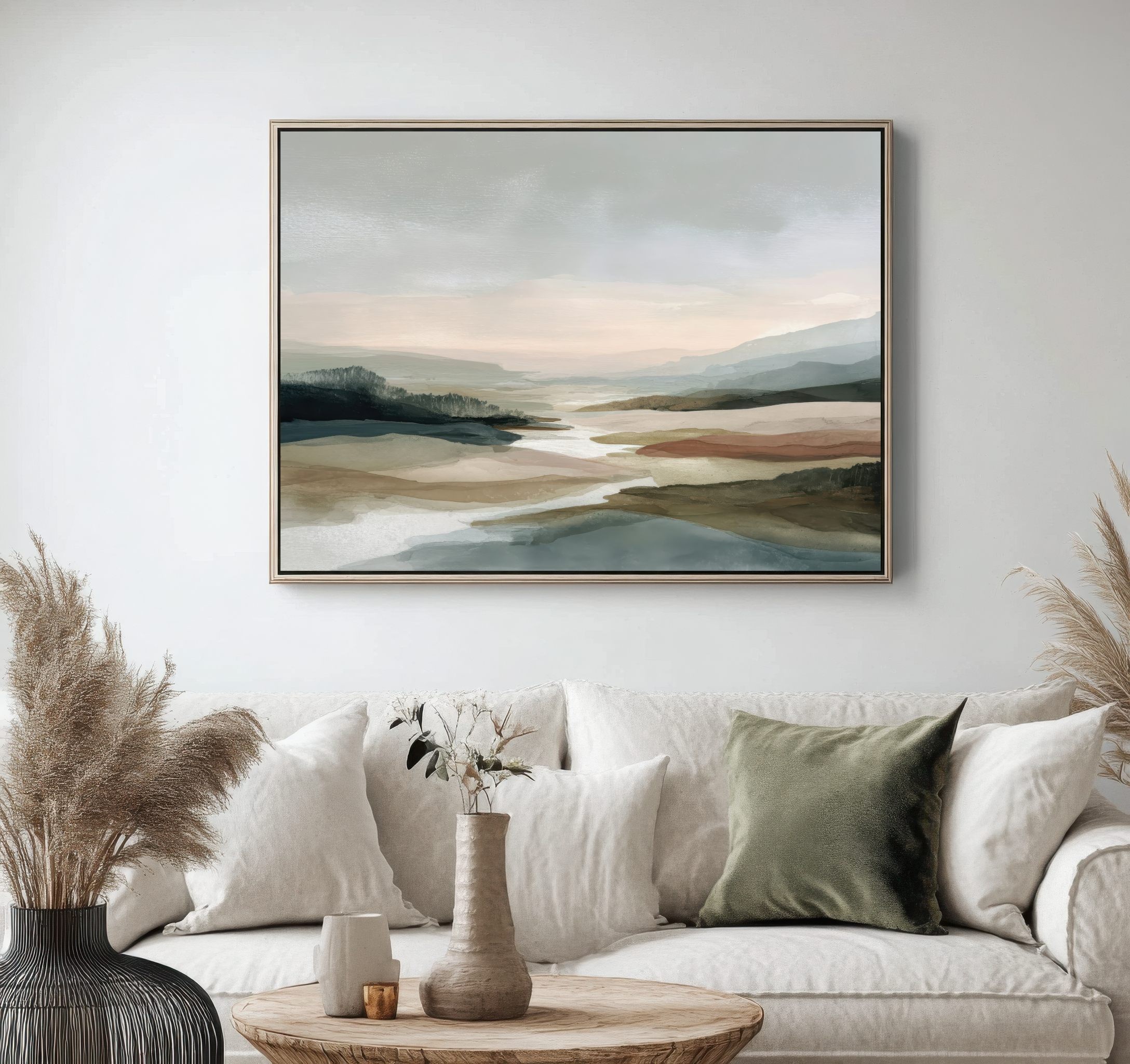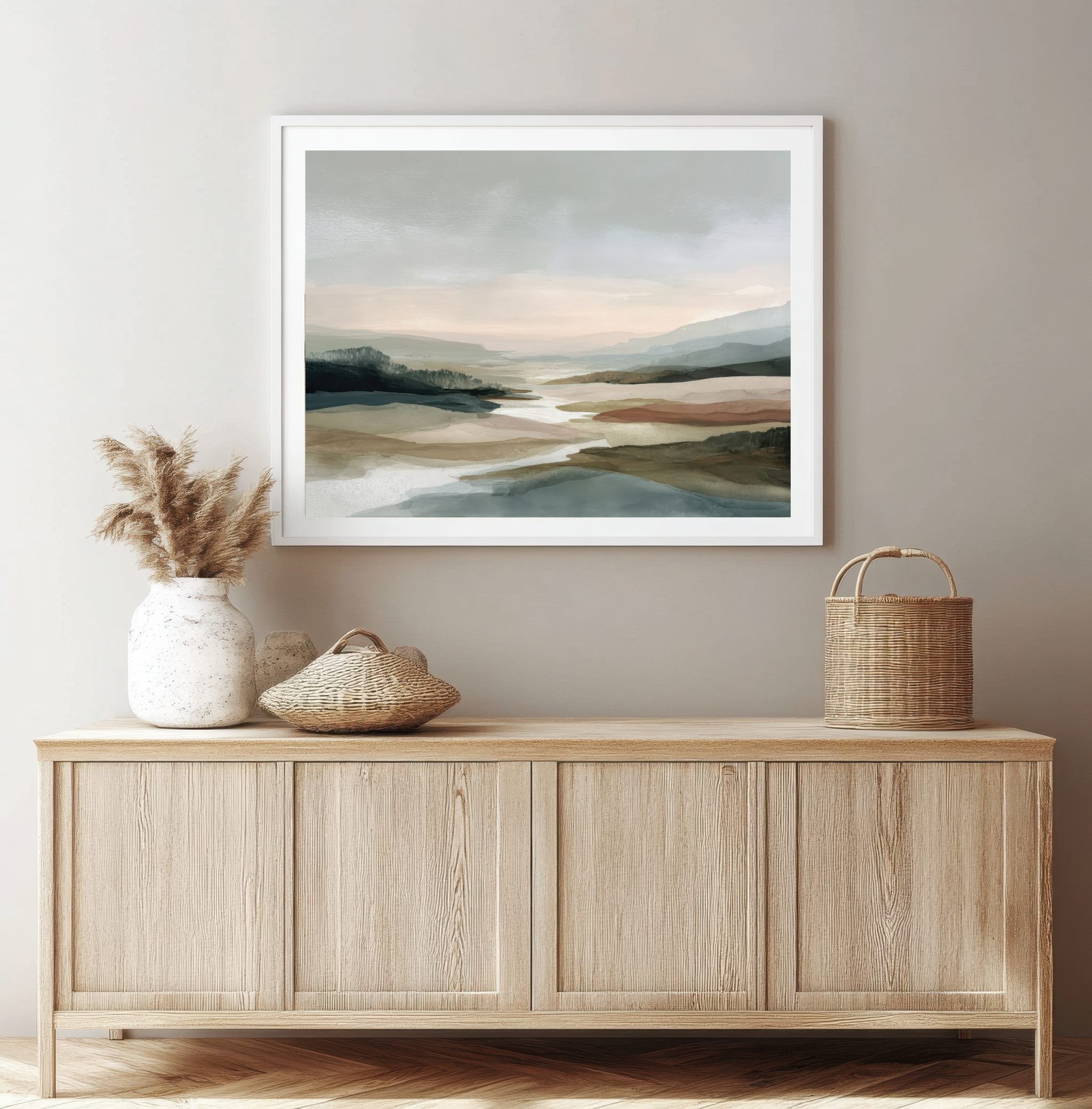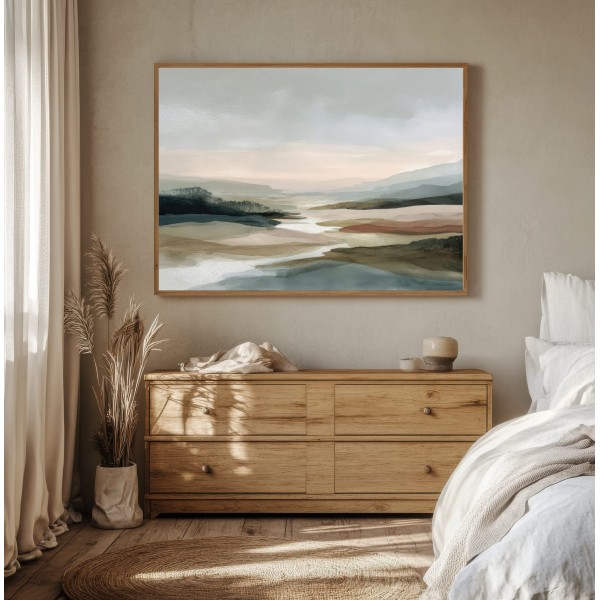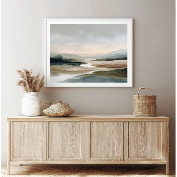Este cuadro abstracto de paisaje con montañas en tonos tierra y grises suaves evoca la calma de un horizonte natural envuelto en neblina. Su paleta de colores neutros, con matices beige, arcilla y verde apagado, crea una sensación de profundidad y serenidad. Las transiciones suaves recuerdan la acuarela y aportan una atmósfera tranquila y elegante. Perfecto para interiores contemporáneos, Japandi o wabi-sabi, este arte mural transmite equilibrio y conexión con la naturaleza a través de una estética minimalista y poética.