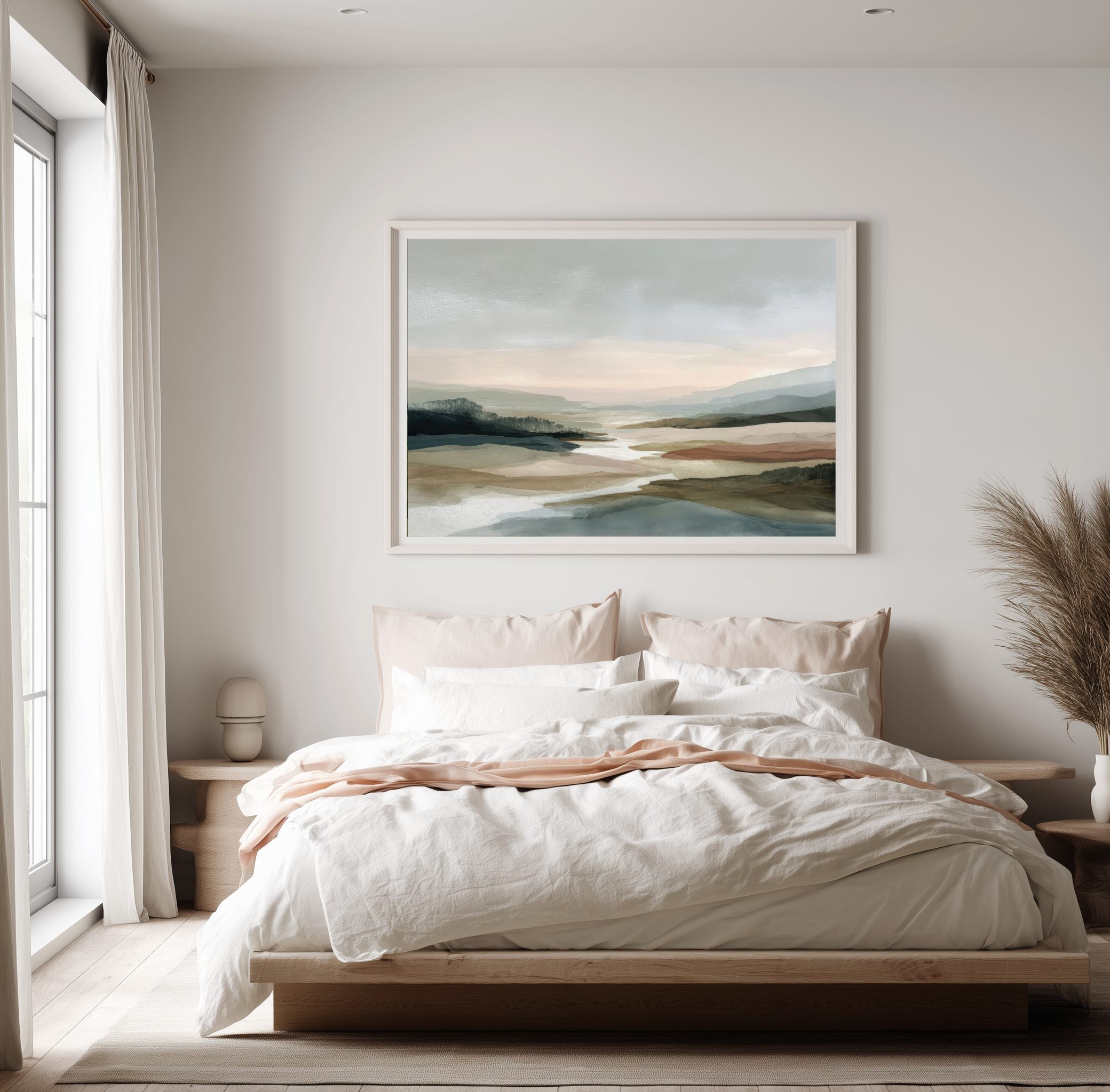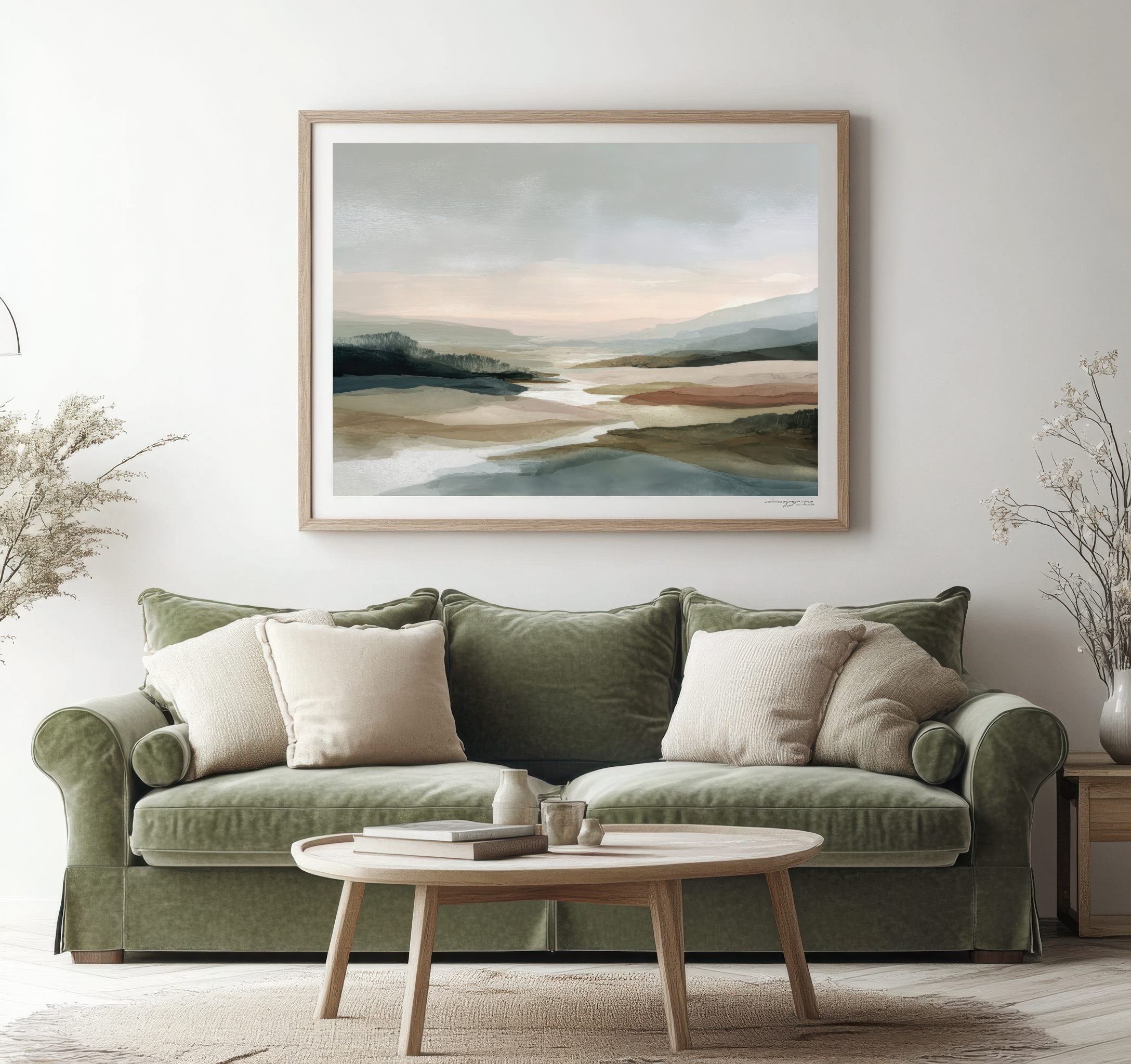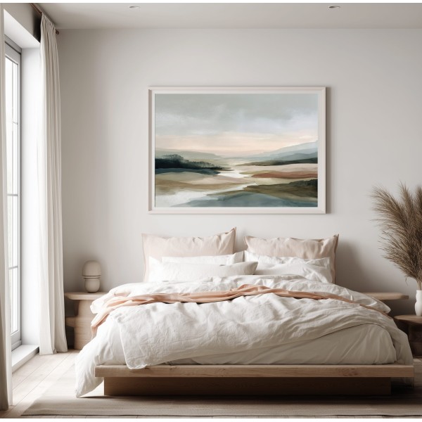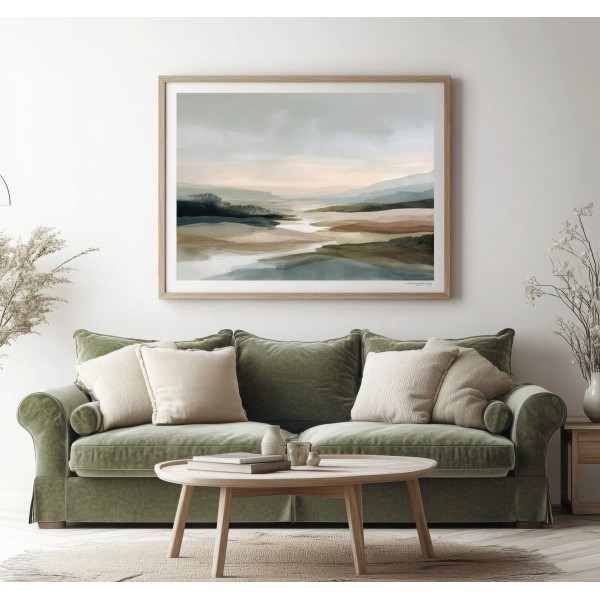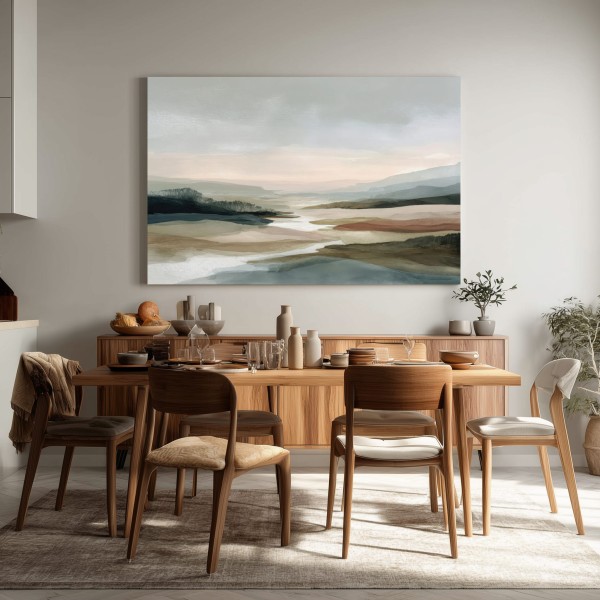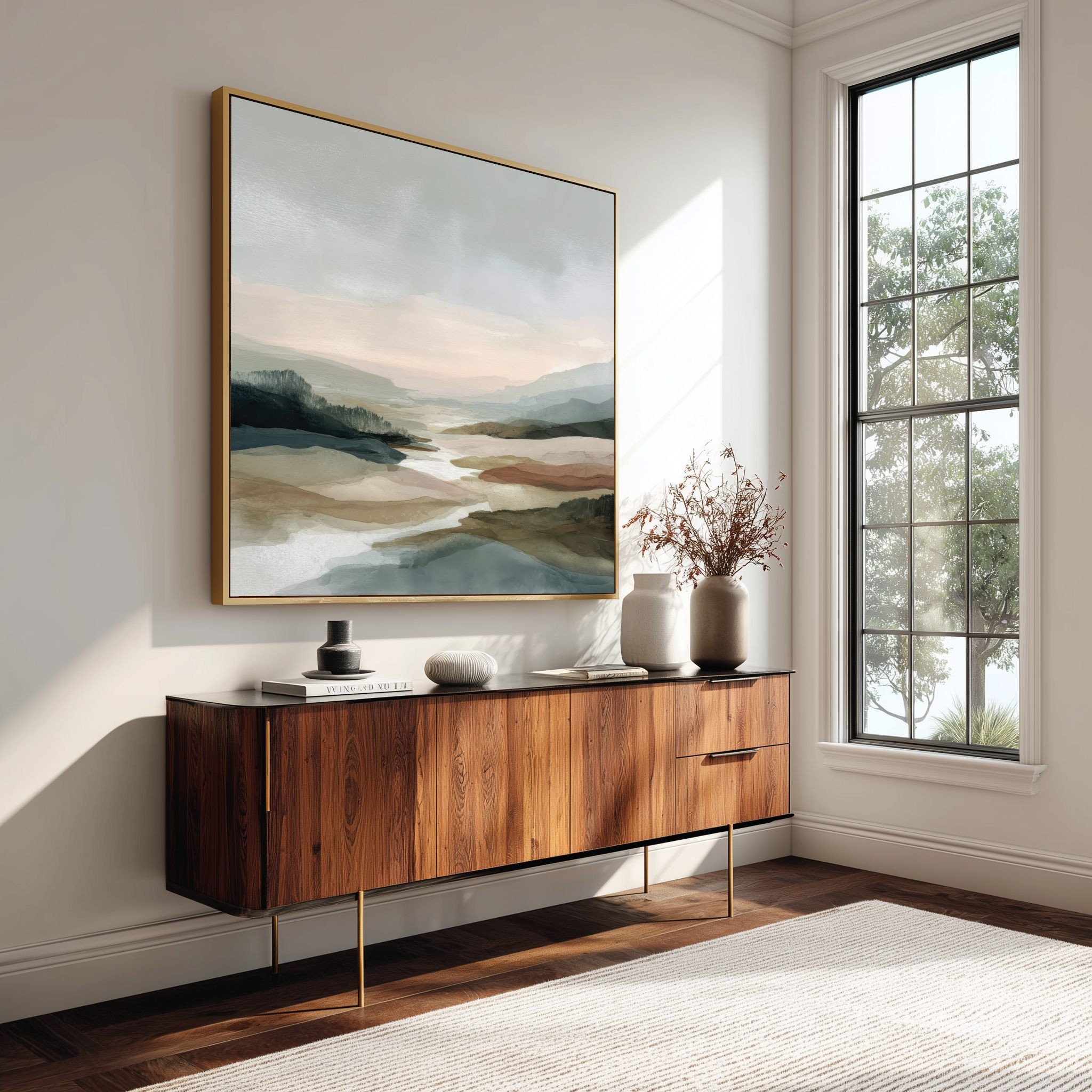Este cuadro abstracto de paisaje con montañas en tonos tierra y grises suaves evoca la calma de un horizonte natural envuelto en neblina. Su paleta de colores neutros, con matices beige, arcilla y verde apagado, crea una sensación de profundidad y serenidad. Las transiciones suaves recuerdan la acuarela y aportan una atmósfera tranquila y elegante. Perfecto para interiores contemporáneos, Japandi o wabi-sabi, este arte mural transmite equilibrio y conexión con la naturaleza a través de una estética minimalista y poética.