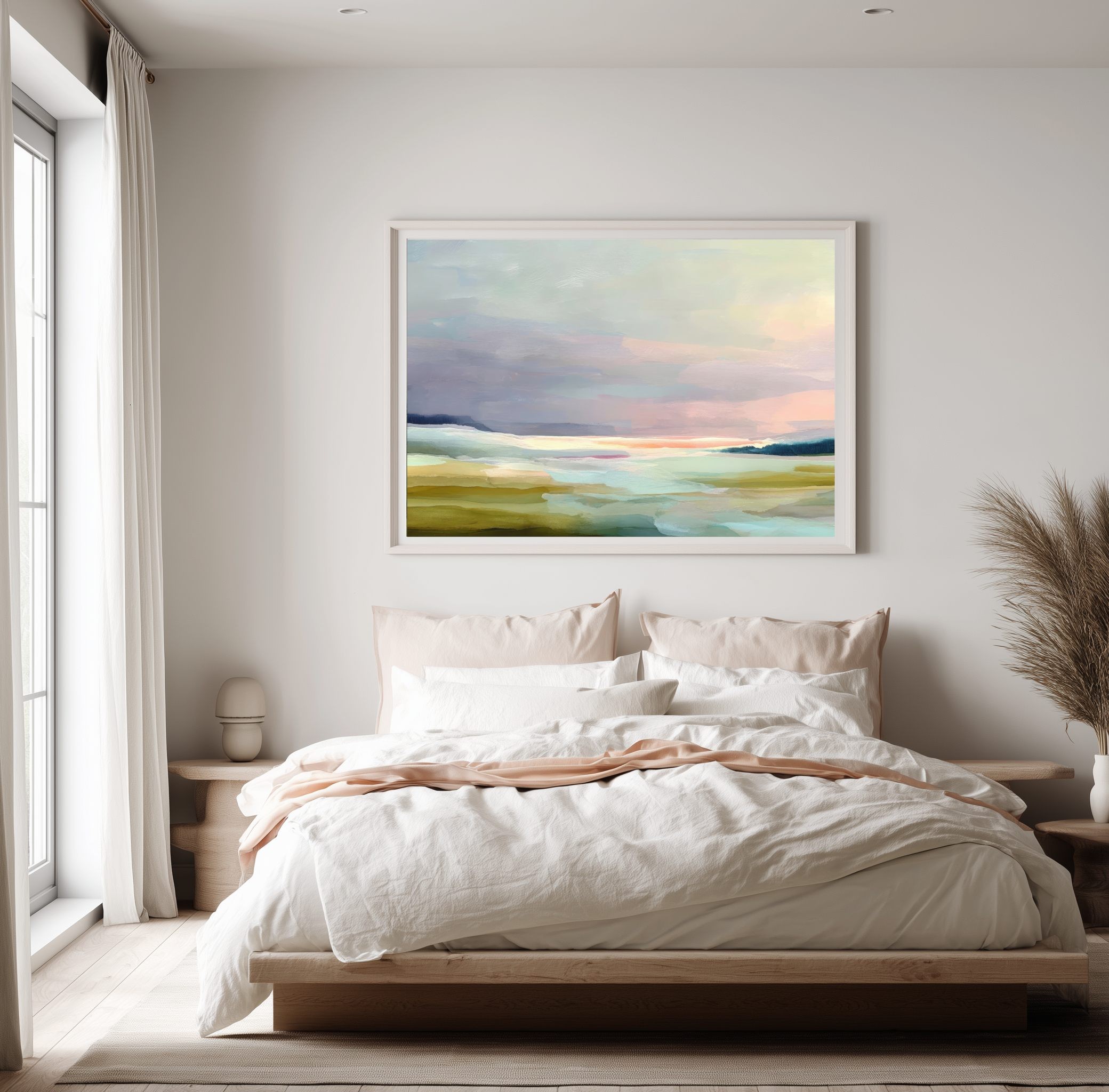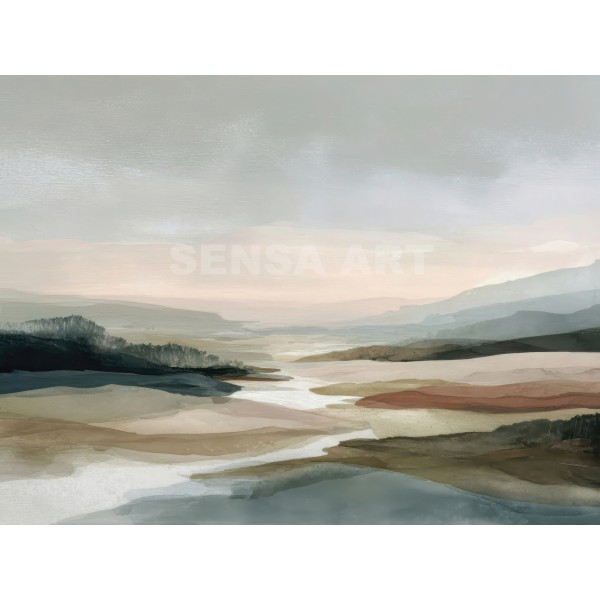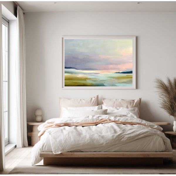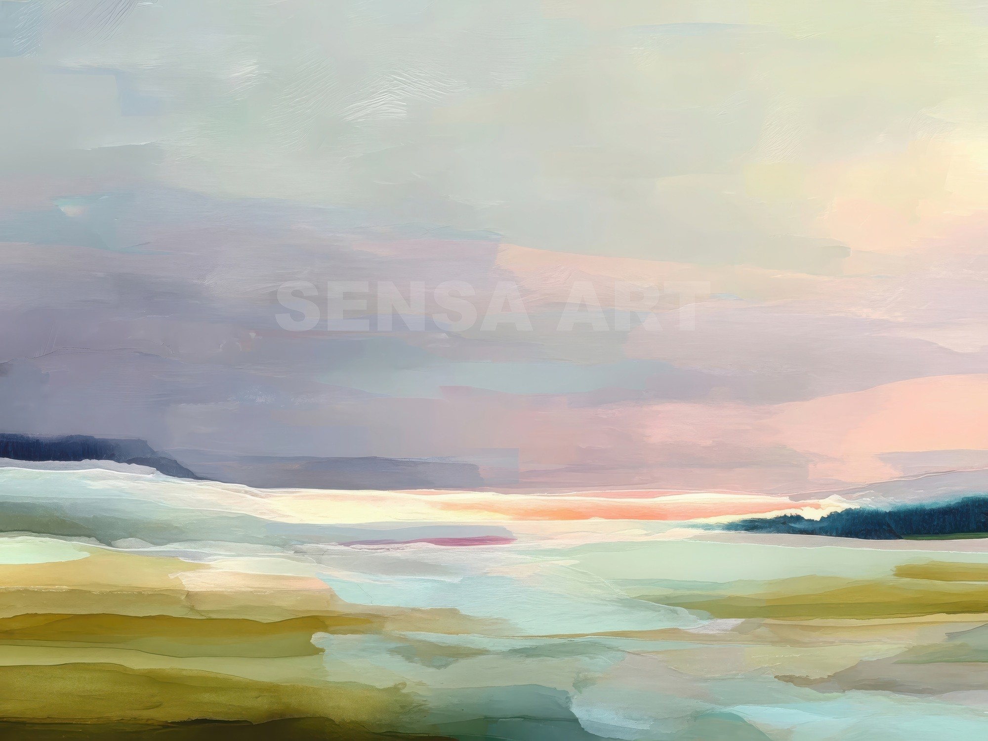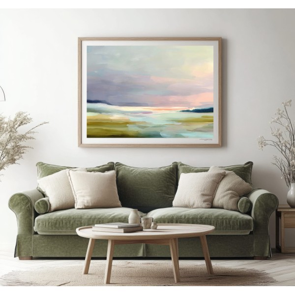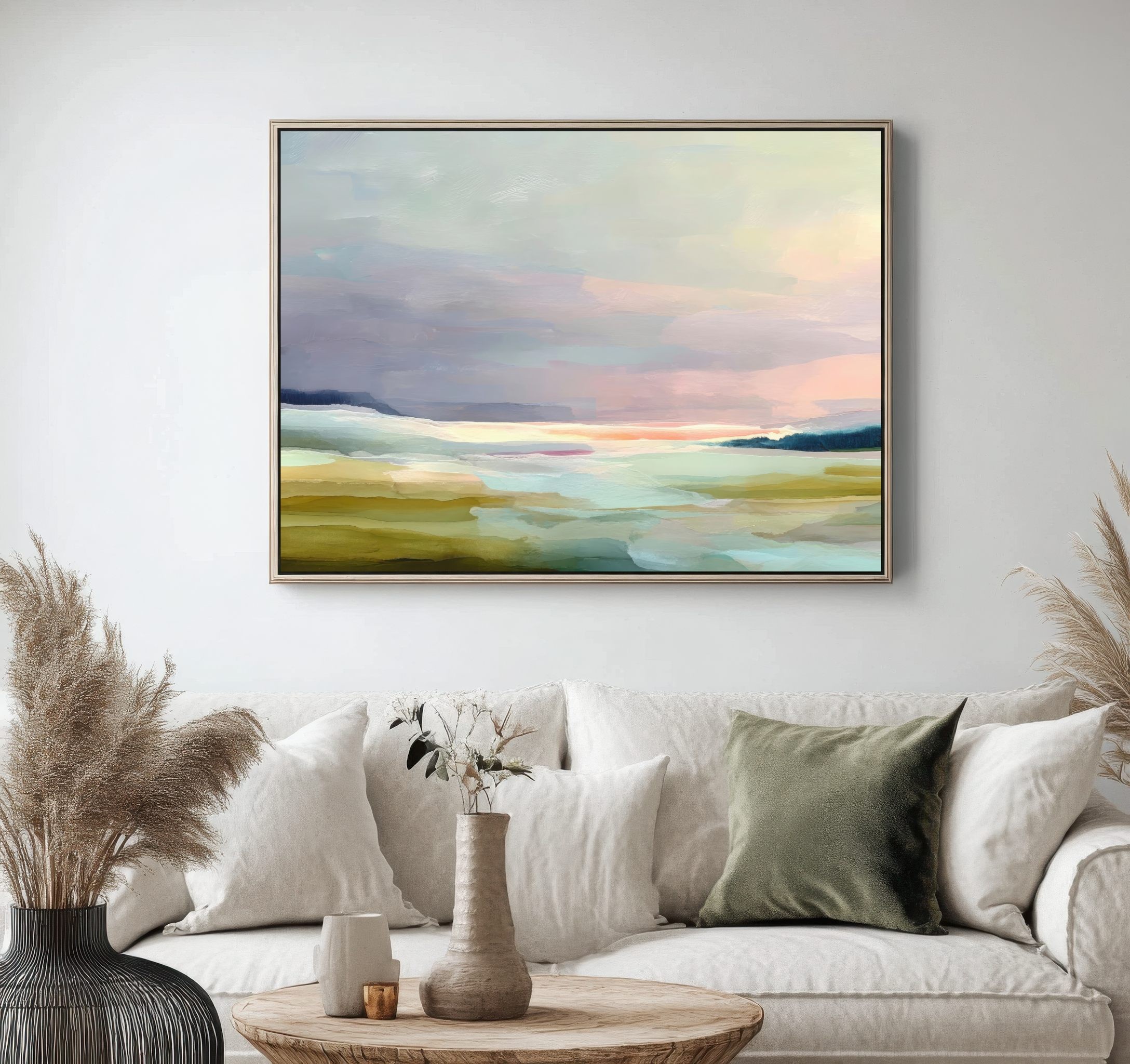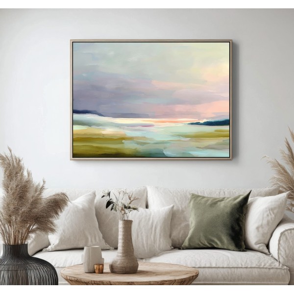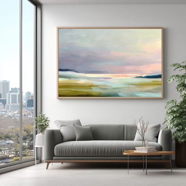 El cuadro abstracto Dreamscape destaca por su delicada armonía de colores suaves: verdes, lilas y rosados se funden en una atmósfera luminosa y tranquila. Con una composición fluida que evoca la serenidad del paisaje al amanecer, esta obra aporta una sensación de calma y equilibrio visual. Ideal para interiores modernos, nórdicos o Japandi, combina arte contemporáneo y naturalidad. Perfecto para quienes buscan decorar con elegancia y suavidad, creando un ambiente acogedor, equilibrado y lleno de luz.