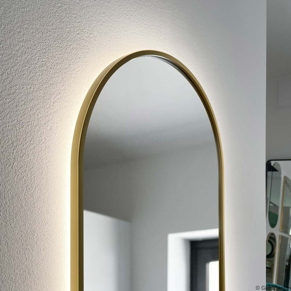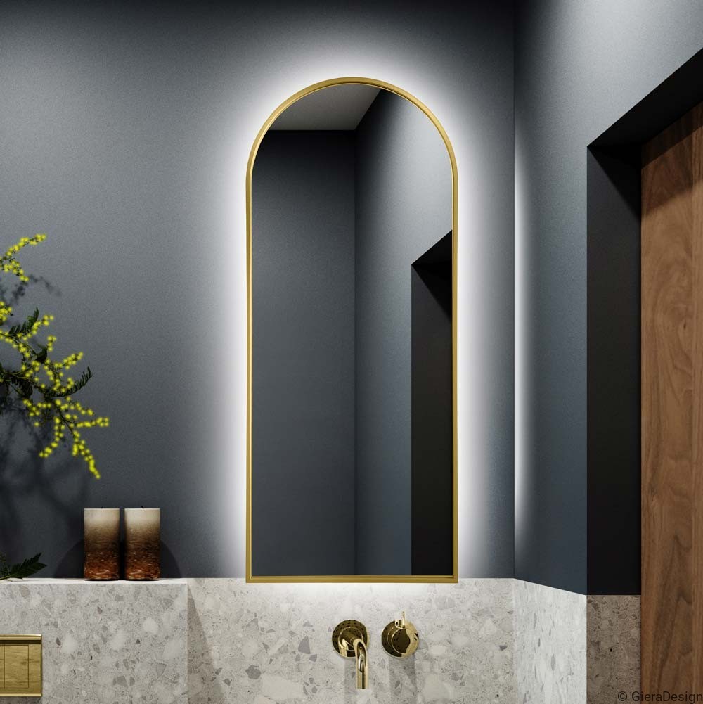Espejo de baño con forma de arco, marco dorado y retroiluminación LED, ideal para interiores elegantes, modernos o de estilo clásico renovado. Su diseño vertical con curva superior suaviza el espacio y aporta un aire sofisticado, mientras la luz LED perimetral crea una atmósfera cálida y funcional. El acabado dorado añade un toque de lujo sutil, ideal para combinar con mármol, madera o tonos neutros. Espejo decorativo con luz integrada y marco dorado, perfecto para proyectos de interiorismo refinados y luminosos.