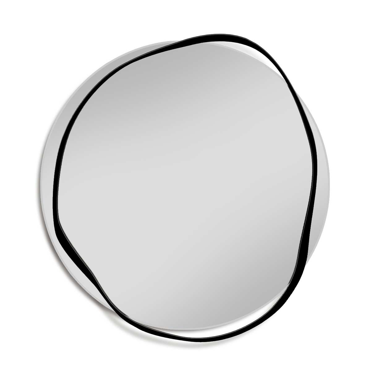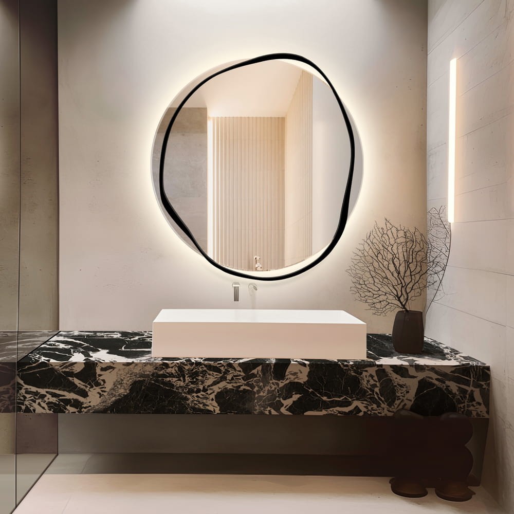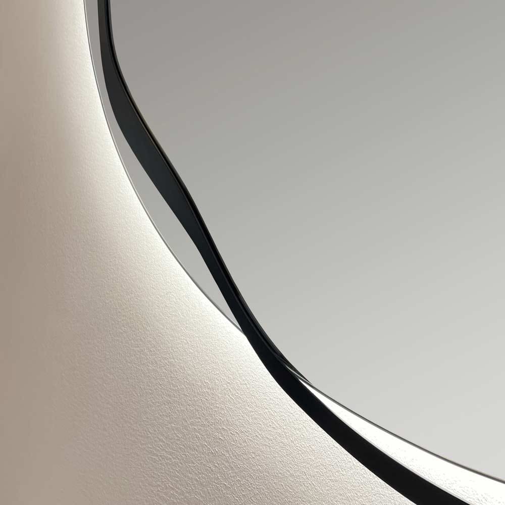 El espejo original retroiluminado Banda. En la superficie del espejo OptiWhite se ha aplicado un marco metálico irregular, lacado en negro. El marco negro irregular parece ondear y elevarse en el espacio, como un portal a otra dimensión. Esto hace que el espejo redondo clásico adquiera características decorativas, y la forma irregular del marco se integra perfectamente en las tendencias modernas. Con su diseño original, el espejo atrae la atención sin perder sus cualidades prácticas. Es ideal para baños modernos pero también será una decoración original para el salón, el dormitorio o el recibidor.