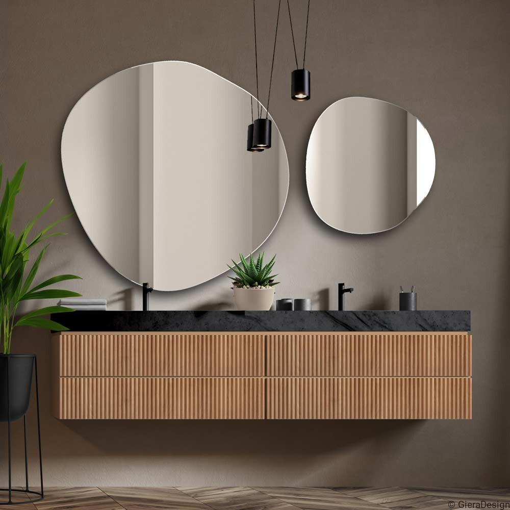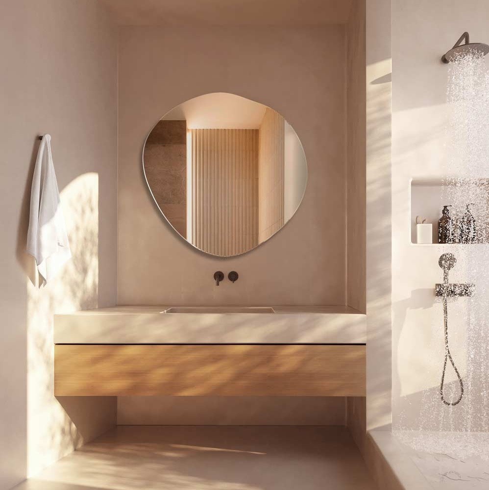 Este espejo de baño con forma irregular y bordes redondeados destaca por su diseño orgánico y natural. Sin marco y con líneas suaves, se integra a la perfección en interiores minimalistas, escandinavos o de inspiración wabi-sabi. Fabricado con cristal pulido de alta calidad, su silueta asimétrica aporta elegancia y personalidad sin sobrecargar el espacio. Perfecto para baños modernos que buscan luz, armonía y diseño. Su forma fluida lo convierte en una pieza funcional y decorativa, ideal para quienes aprecian la estética contemporánea y el confort visual.