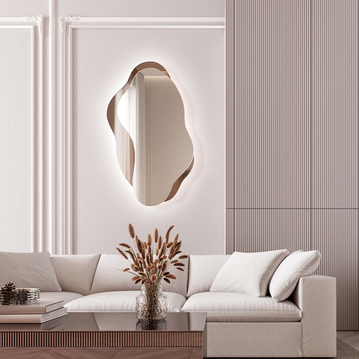 Sumérgete en el fascinante mundo del diseño vanguardista con nuestro espejo asimétrico retroiluminado Libido, una pieza que transformará por completo la apariencia de cualquier espacio. Este espejo se distancia de lo convencional y lleva la creatividad a un nivel superior. Cada aspecto de su diseño ha sido cuidadosamente elaborado para ofrecer una obra maestra de arte y funcionalidad.
