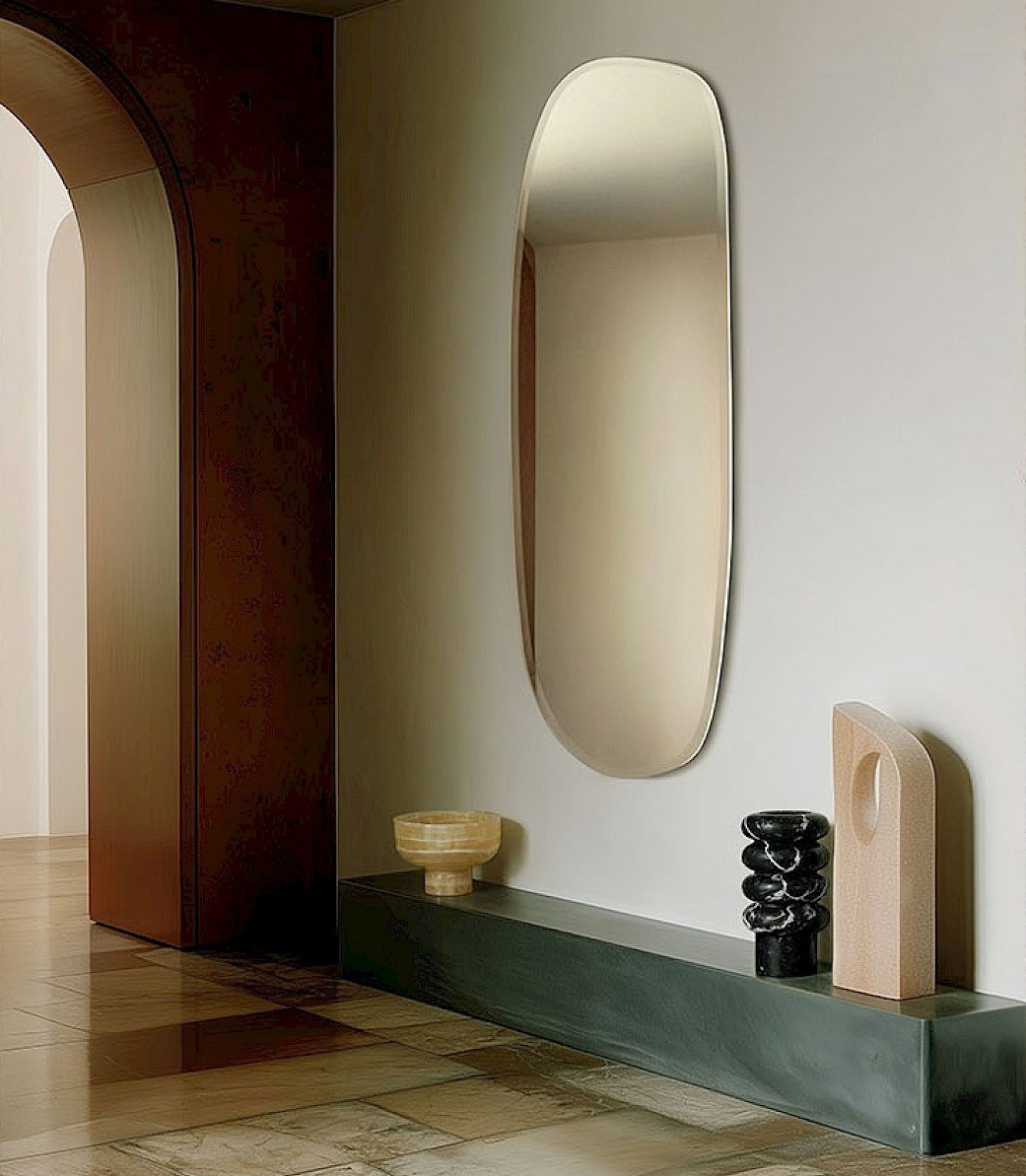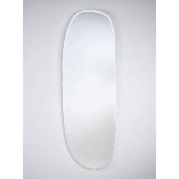Este espejo asimétrico biselado destaca por su silueta orgánica y su presencia ligera y sofisticada. El bisel perimetral de 2 cm sigue con precisión el contorno irregular del espejo, capturando la luz y creando una sutil sensación de profundidad que realza el espacio.