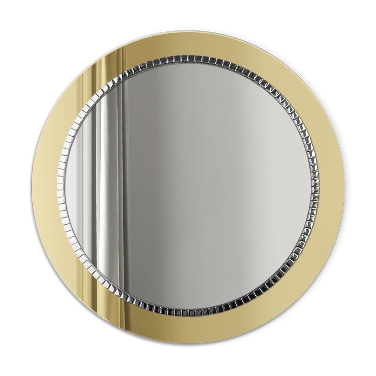 Espejo redondo decorativo con marco hecho de espejo color dorado, decorado con mosaicos cuadrados plateados. Una pieza excepcional de alto valor decorativo que combina a la perfección con interiores decorados con glamour donde se busca un complemento elegante y refinado. Perfecto para vestir la pared de un salón comedor, recibidor, hall o dormitorio.