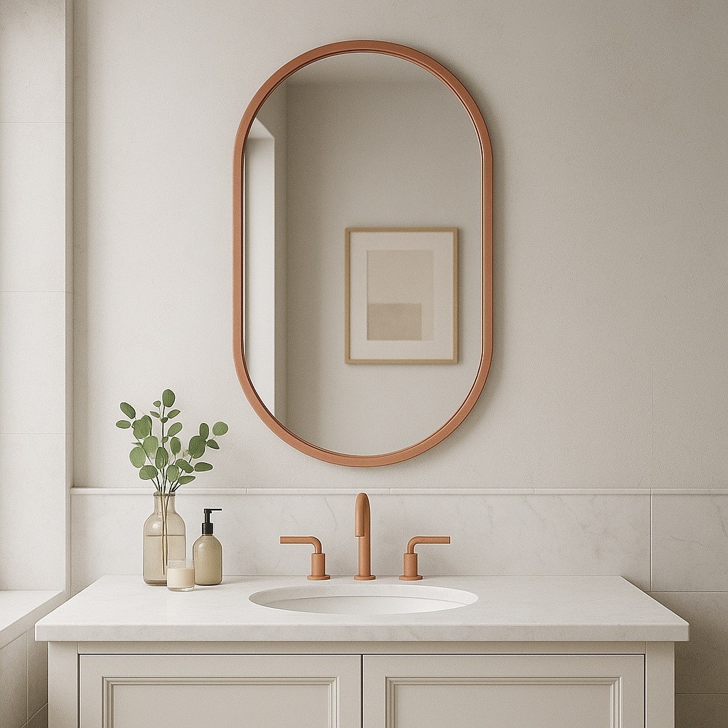 Este espejo de baño con marco color cobre combina calidez y sofisticación en un diseño moderno. Su forma ovalada y acabado aportan un estilo contemporáneo con un toque artesanal. Ideal para baños elegantes o de inspiración natural, este espejo decorativo para baño realza la luminosidad del ambiente. Fabricado con materiales resistentes a la humedad, asegura durabilidad y fácil mantenimiento. Si buscas un espejo moderno de baño con carácter y personalidad, esta opción en tono cobre es perfecta para transformar cualquier espacio con estilo sutil y acogedor.