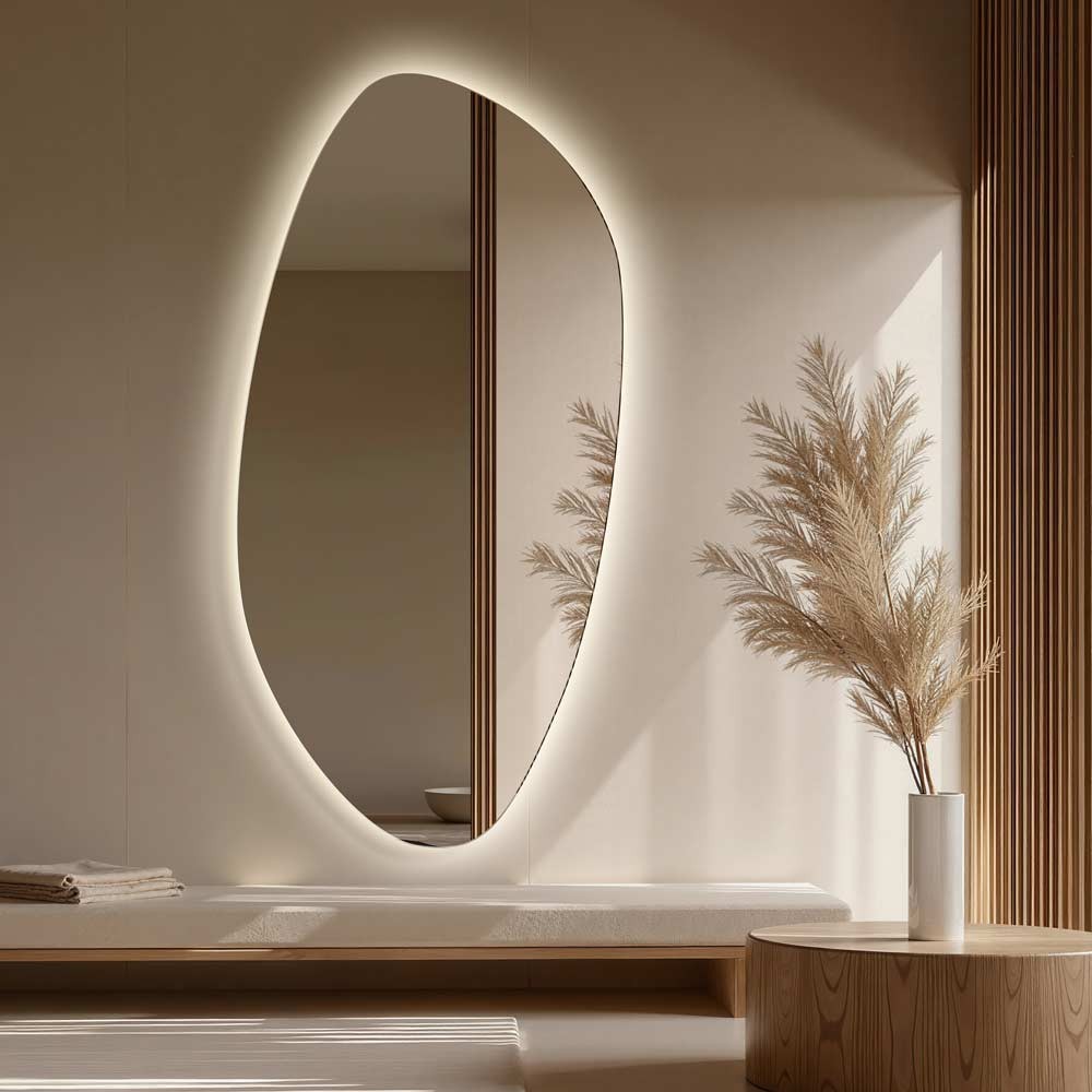Este espejo asimétrico con luz LED es una pieza escultórica que aporta luz, estilo y sofisticación a cualquier ambiente. Su forma orgánica y fluida convierte cualquier pared en un punto focal, mientras que su iluminación trasera crea una atmósfera cálida y envolvente. Ideal como espejo decorativo de dormitorio o vestidor, es perfecto para ampliar visualmente el espacio y aportar funcionalidad con estilo. Fabricado con cristal de alta calidad, este espejo vertical con LED encaja en interiores modernos, minimalistas o inspirados en el diseño escandinavo.